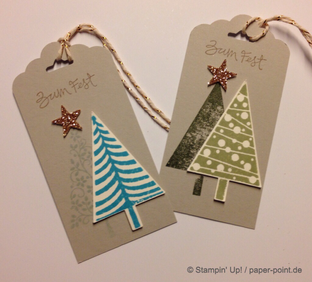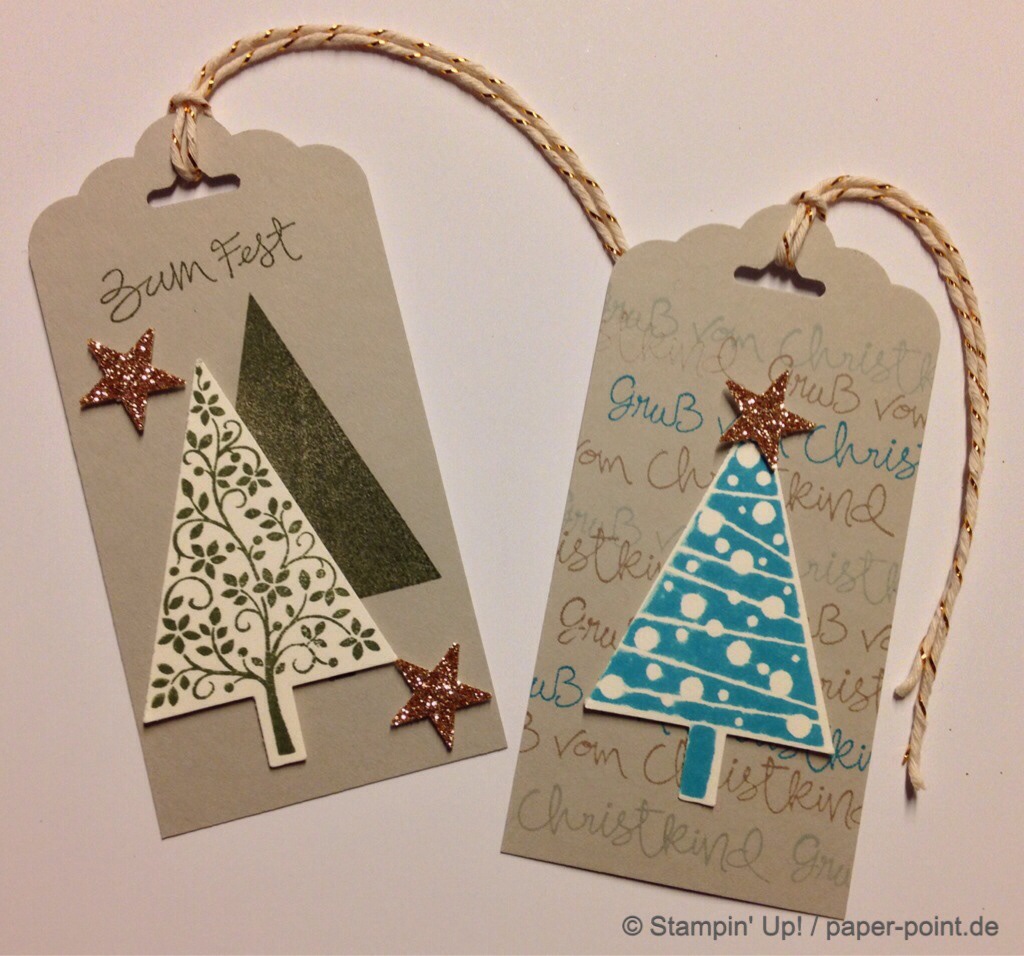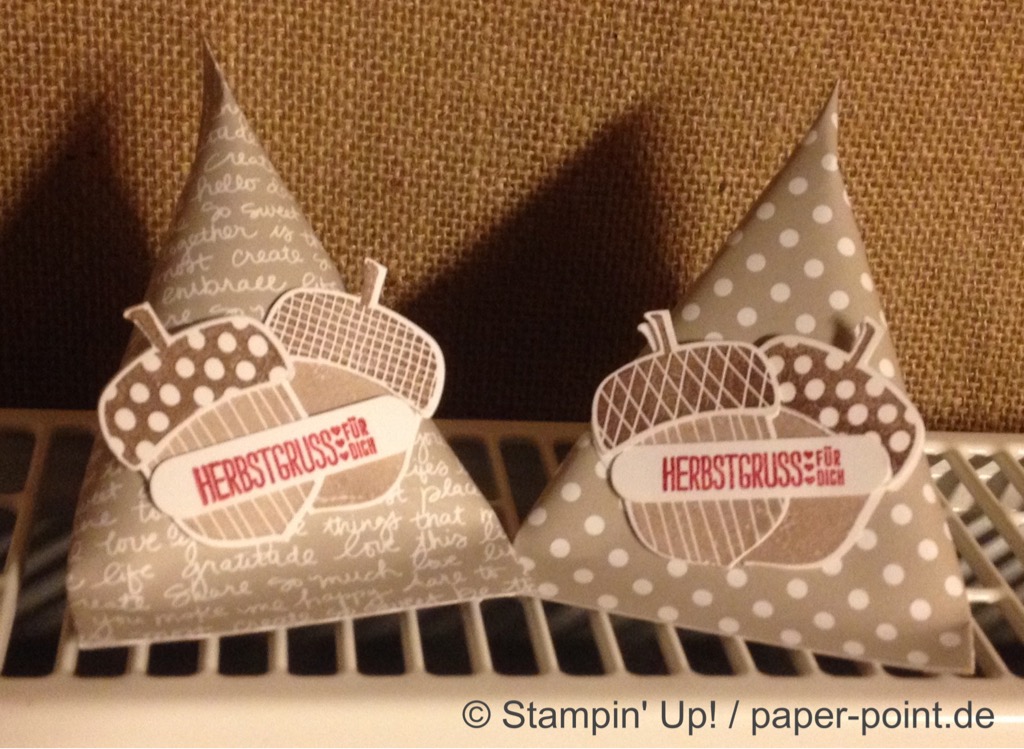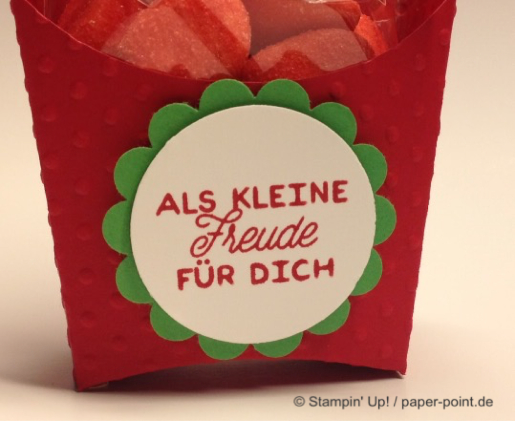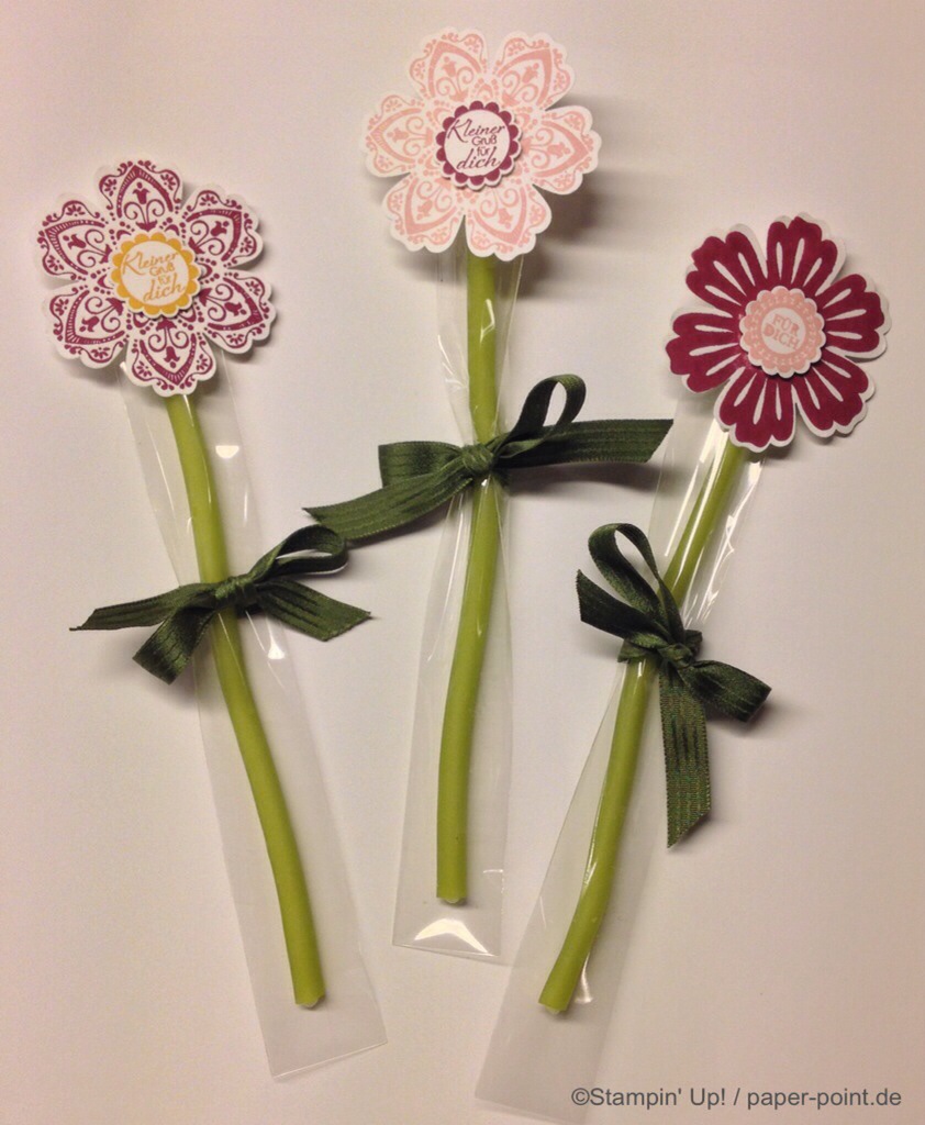 Verwendet haben wir die schmalen Zellophantüten, das Stempelset „Mixed Bunch“, die kleinen Stempel aus „Eine runde Sache“ und Schleifenband in der Farbe „Waldmoos“.