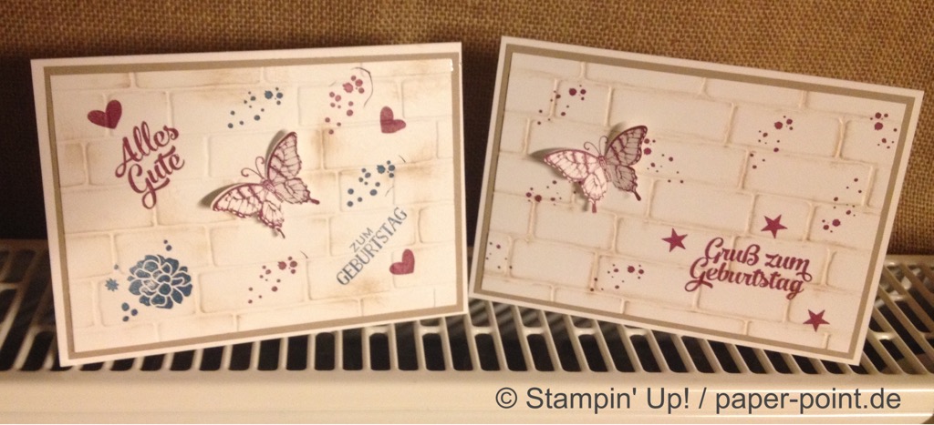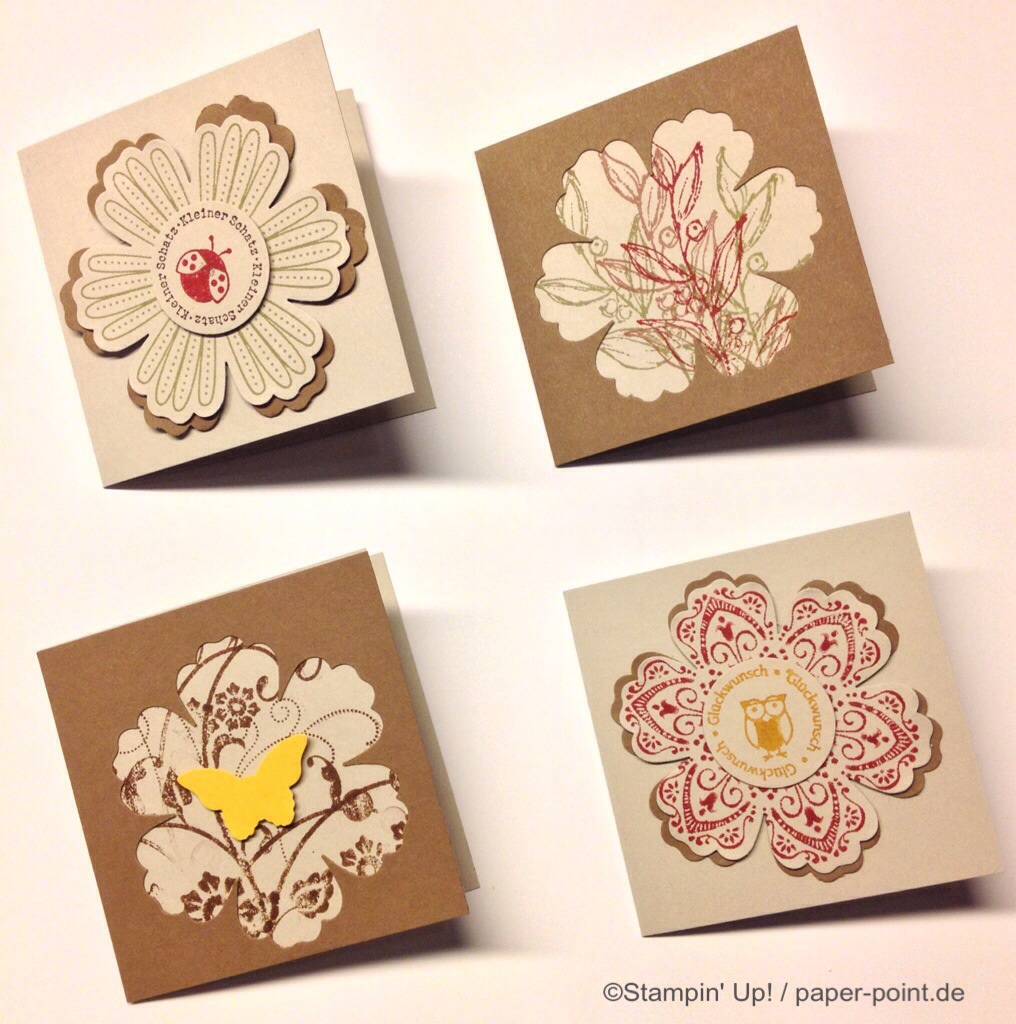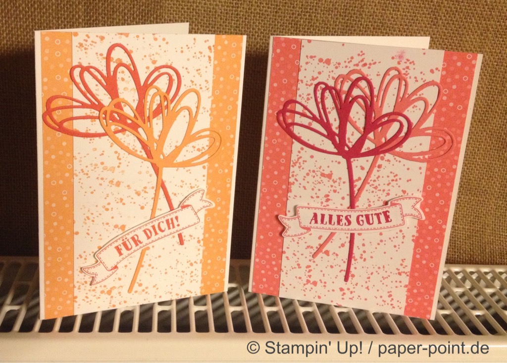Danach haben wir mit der Stanze „Blume“ und einigen Blütenstempeln noch zwei süße kleine Grußkärtchen gebastelt.