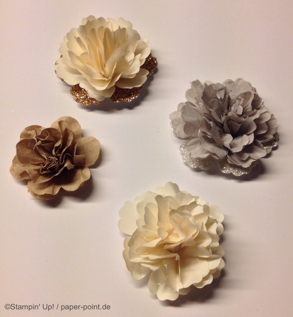 Heute aber ganz druck- äh bastelfrisch die Ergebnisse vom gestrigen Workshop. Fünf fleißige Bastlerinnen haben eifrig Blumen und Blüten gewerkelt. Wir kamen uns fast vor wie in einem Blumenladen… Achtung, jetzt folgen gaaaaanz viele Bilder!