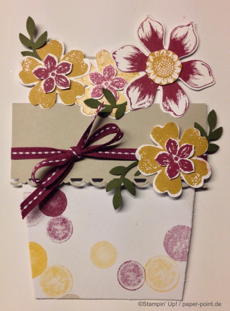 Man kann an den oberen Blüten vorsichtig ziehen, dann kommt eine beschriftbare Karte aus dem Blumentopf, das hat für einen Wow-Effekt bei den Teilnehmerinnen gesorgt. Das Band hält die Karte zusammen, man muss die Seiten gar nicht zukleben.