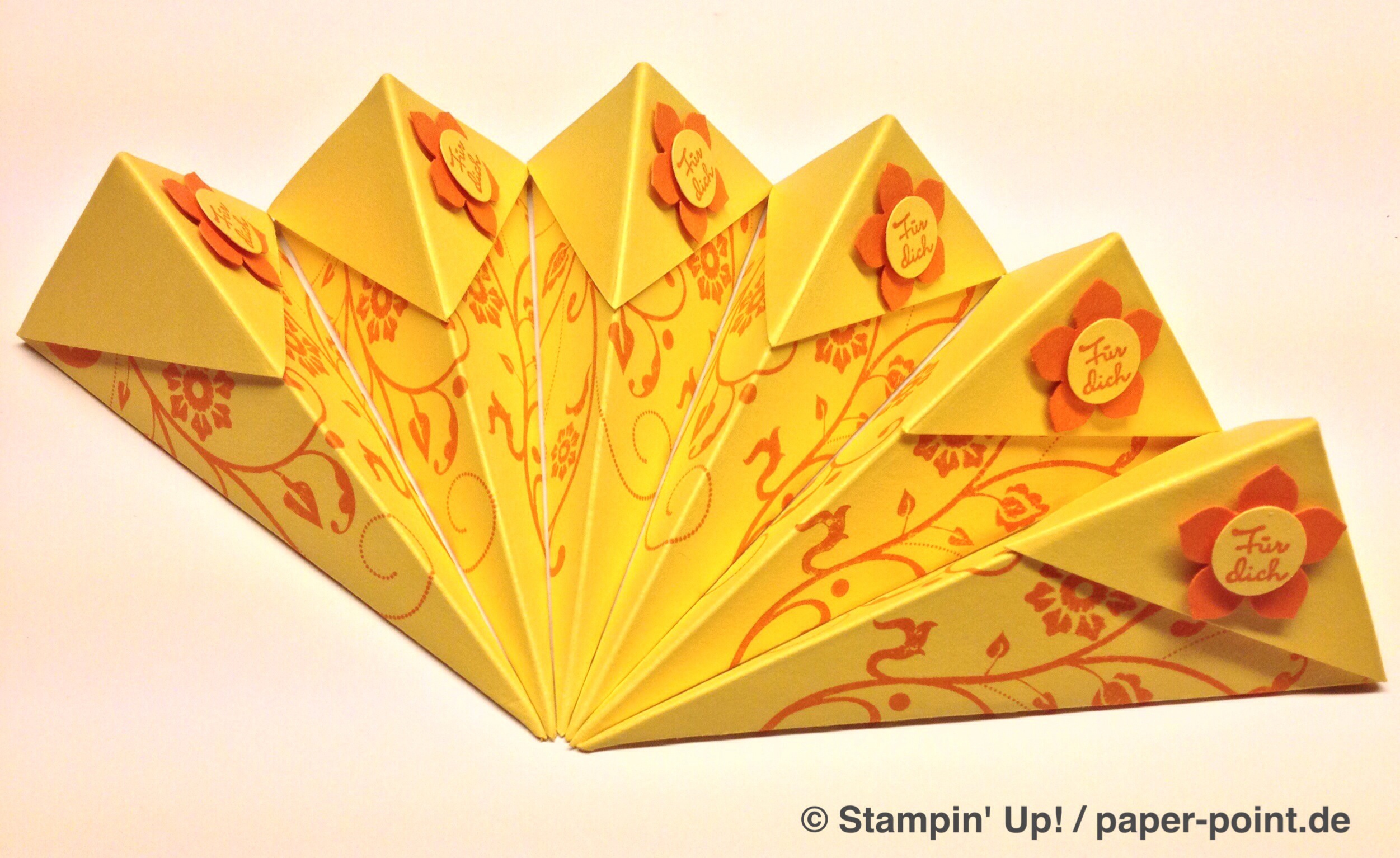 Ich habe aus den Quadraten kleine Spitztüten gefaltet und zusammengeklebt und die Kleine Blüte als Deko drauf gesetzt.
