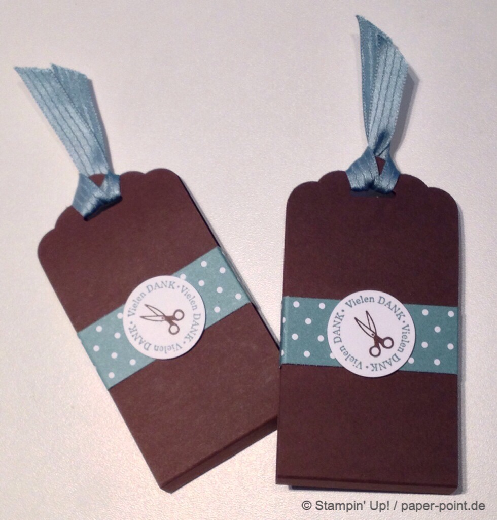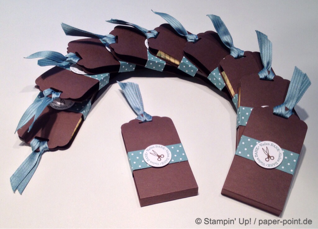 Die Schere auf dem Etikett finde ich sehr passend, da sie ja ein wichtiges Werkzeug für unsere tolle Arbeit ist! Und das Lagunenblaue Band und die Banderole passen gut zum Farbkarton in Schokobraun. In den Hüllen hat sich natürlich noch etwas Schoki versteckt, hier waren es zwei Merci-Schokoriegel.