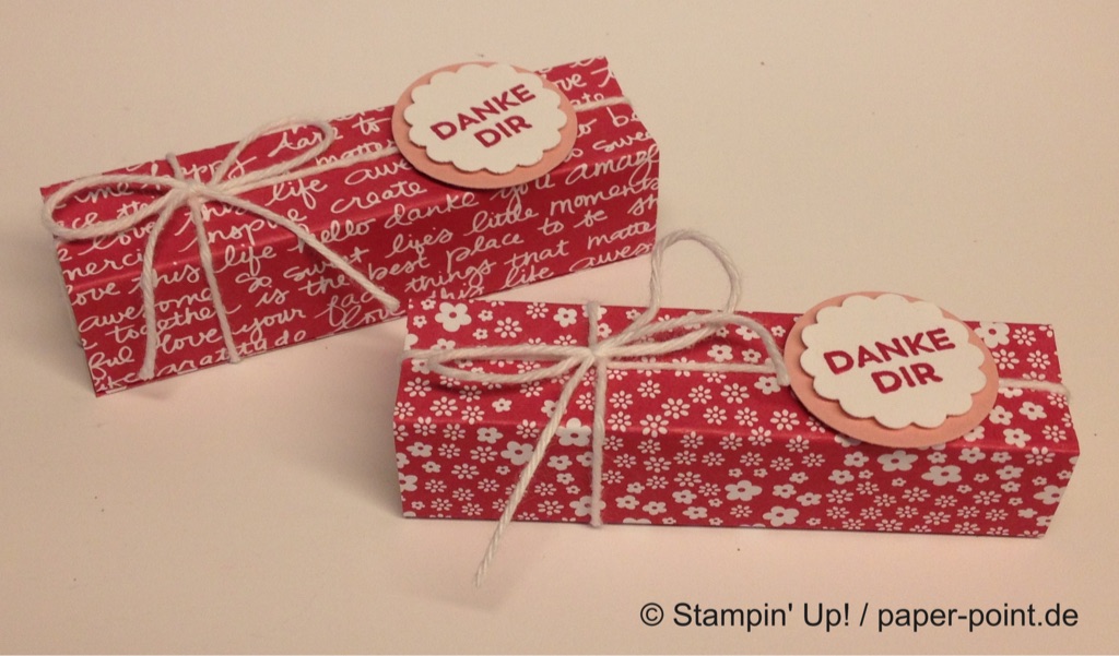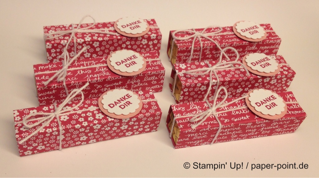 Ich habe zwei Schokoriegel in Designerpapier eingewickelt und mit weißer Kordel eine Schleife darum gebunden.