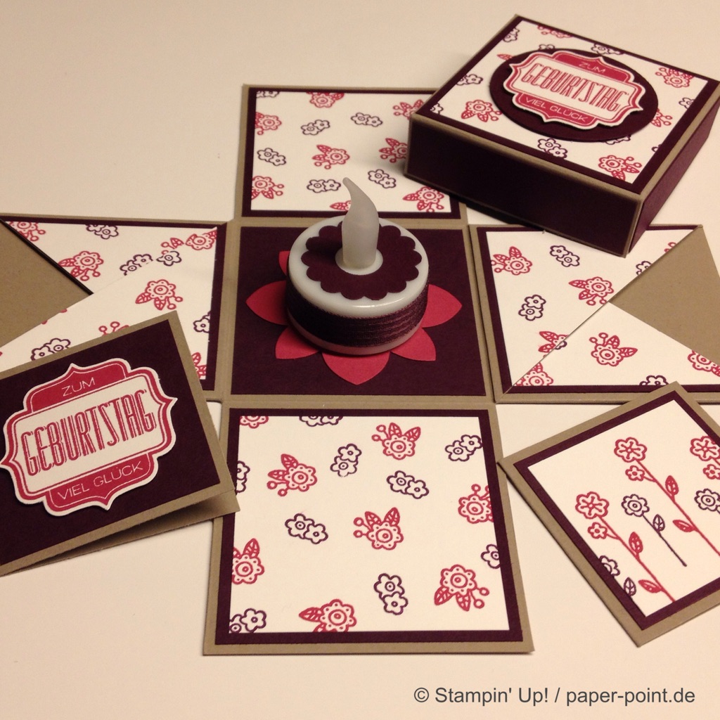 Aufgeklappt erkennt man gut die einzelnen Teile: Die aufgeklappte Box, den Deckel und die beiden Kärtchen, die man in die Seitenteile stecken kann. In die Mitte habe ich noch eine Geburtstagskerze aus einem LED-Teelicht gestellt.