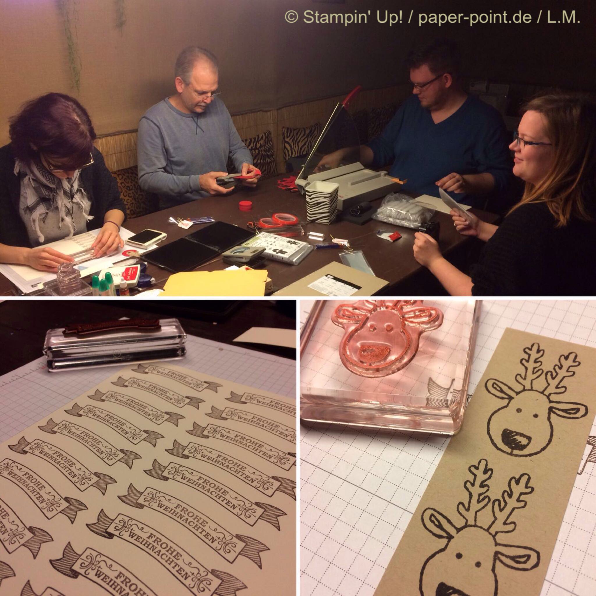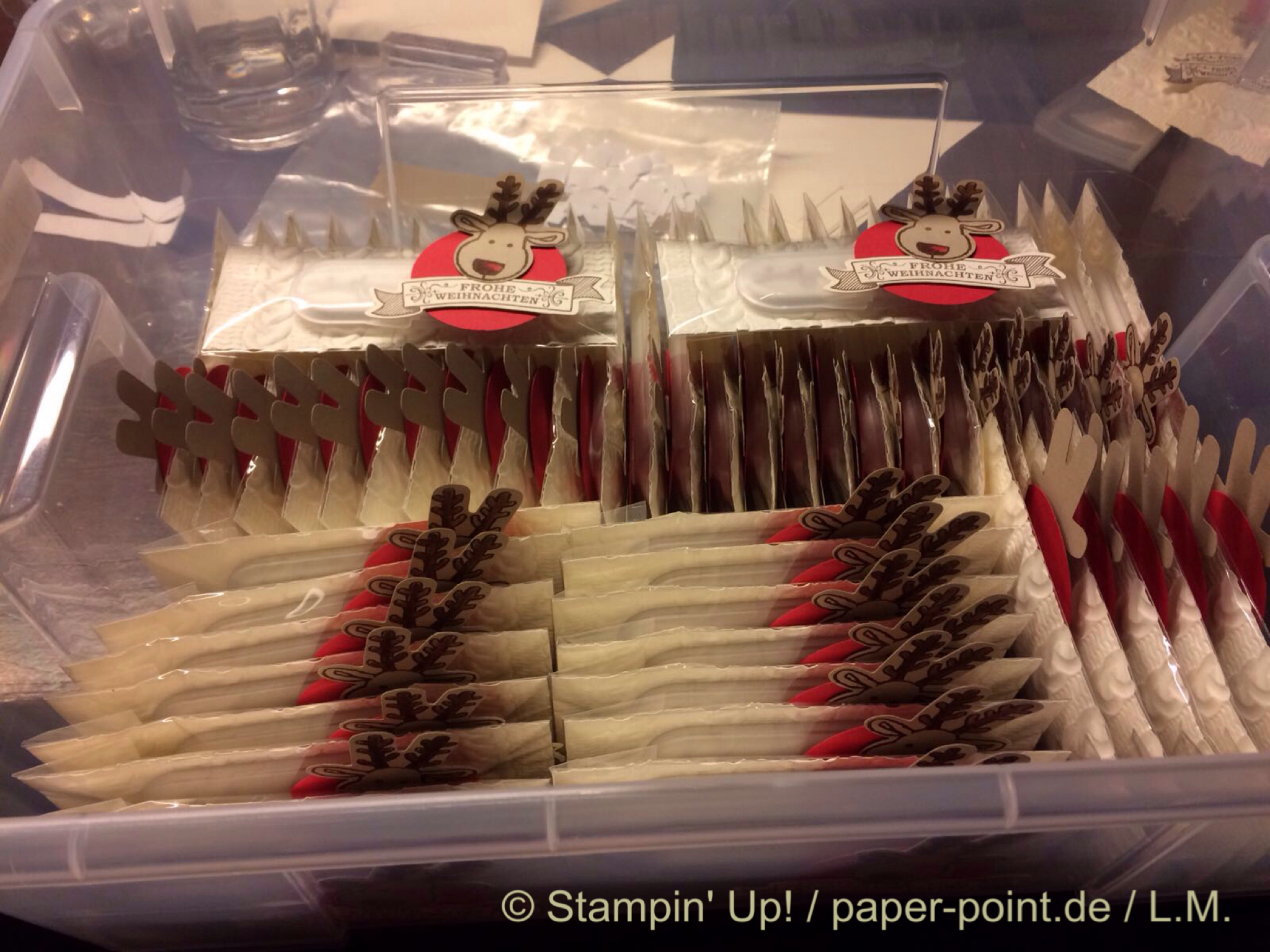 Ganz viele Rentiere hat eine liebe Freundin gestempelt, ausgestanzt und angemalt, um die Weihnachtsgeschenke für ihre Kunden und Kundinnen liebevoll zu verzieren. Dabei hatte sie tatkräftige Unterstützung von Papa, Schwester und Schwager. Das war toll!