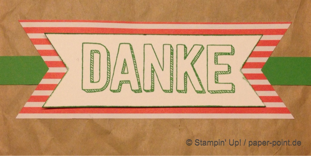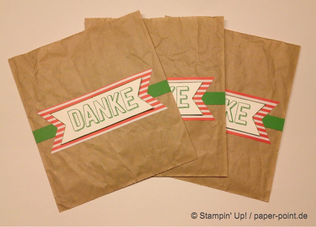Ein Spruch aus dem gleichen Set passte auch noch auf die Tütchen. Wir haben dafür dann die Stanzen „Abreißetikett“ oder „dreifach einstellbares Fähnchen“ benutzt.