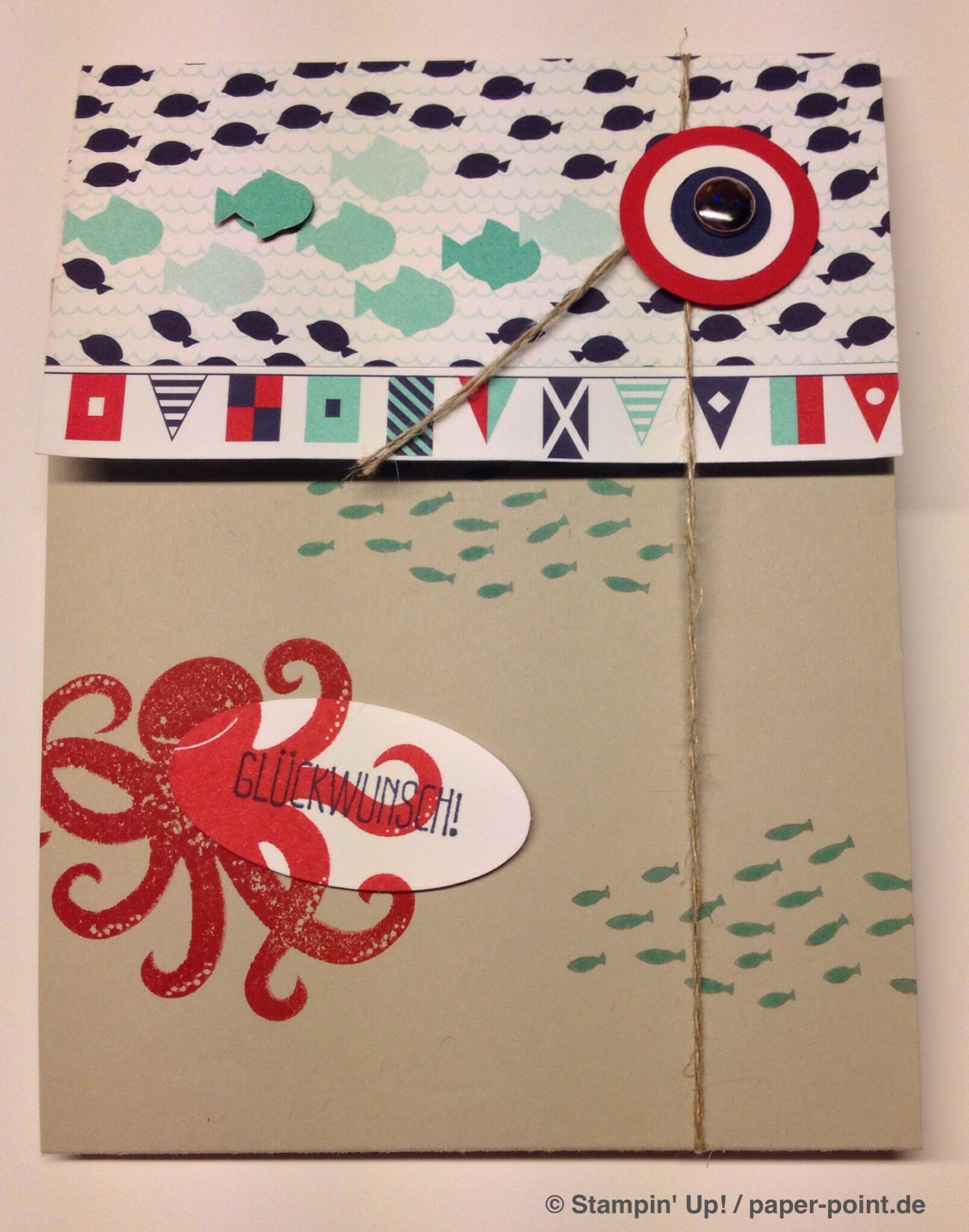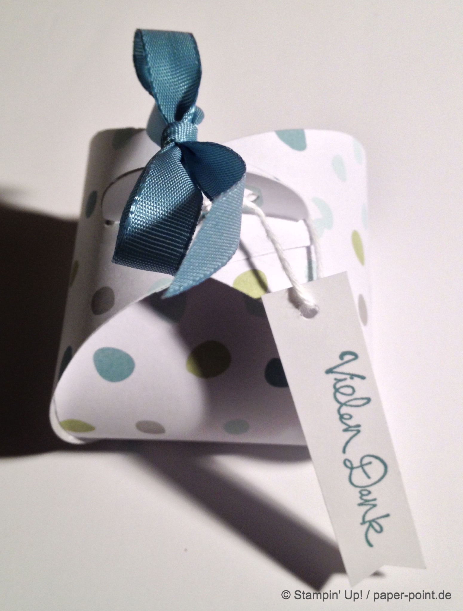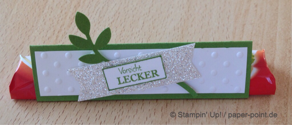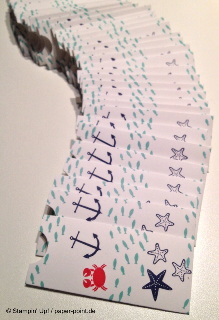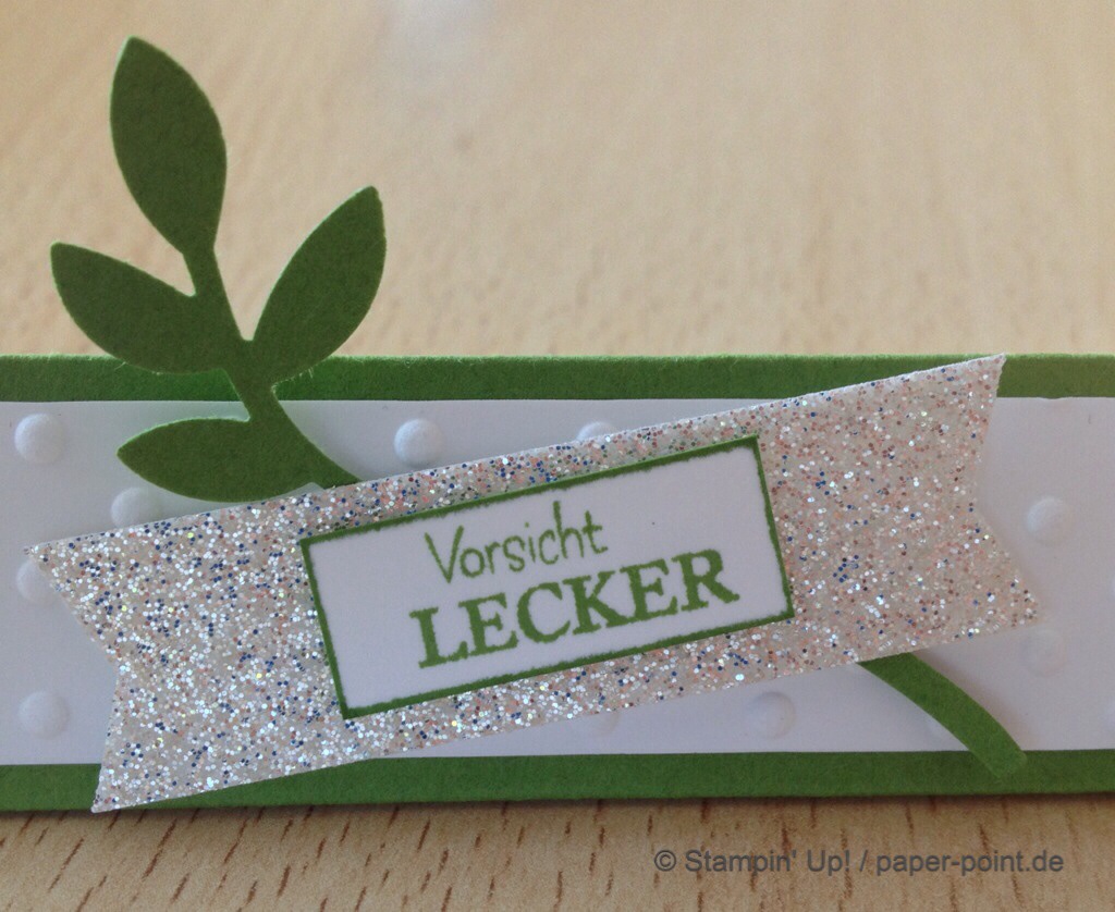 Und nun zur „Füllung“. Ich habe kleine Kaustreifen mit einem vorher bestempelten Fähnchen (Fähnchenstanze) verziert, bei dem ich noch ein Stück Leinenfaden mit reingetackert habe. Diesen Leinenfaden einfach zu einer Schleife binden – voilà, fertig!
