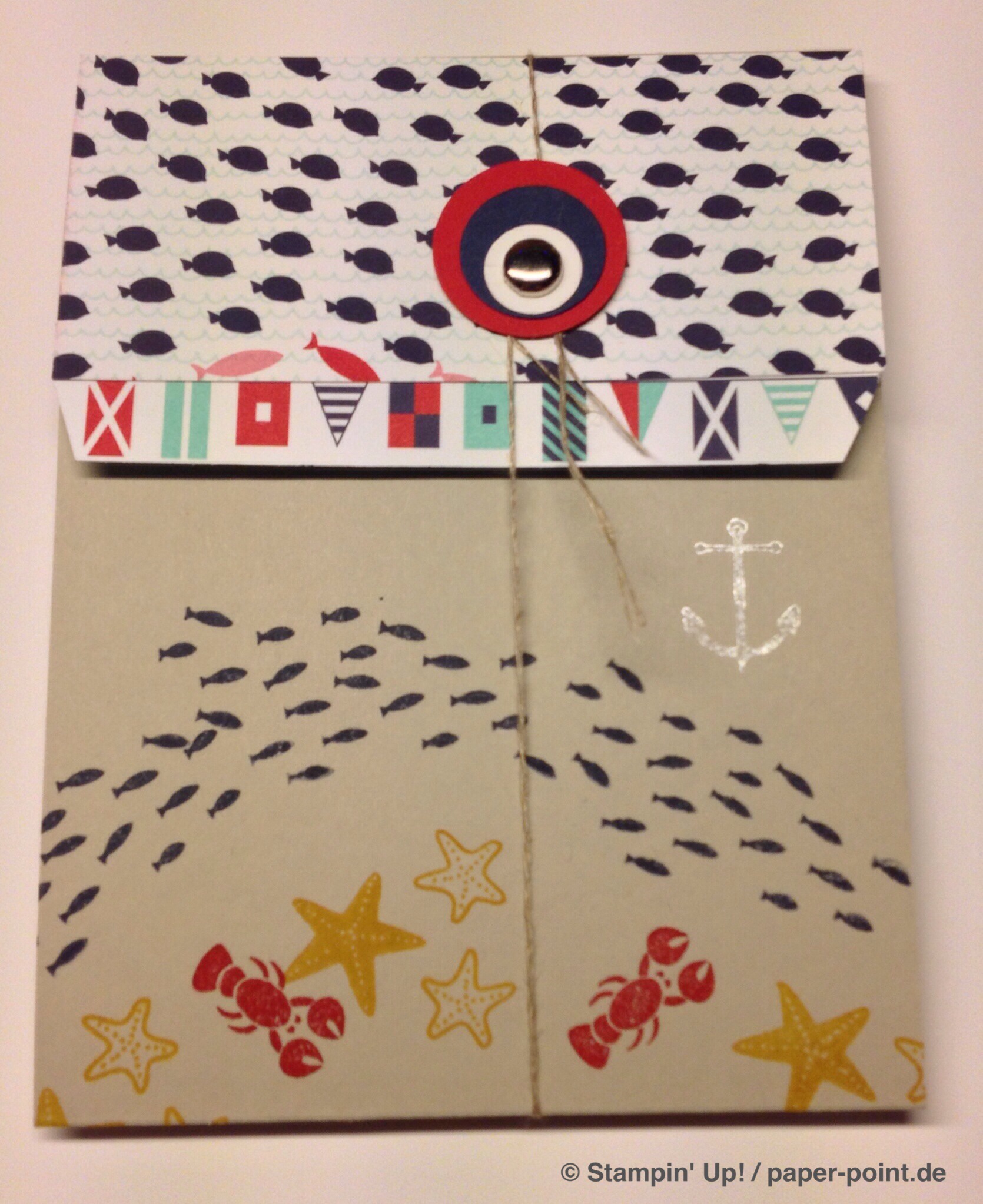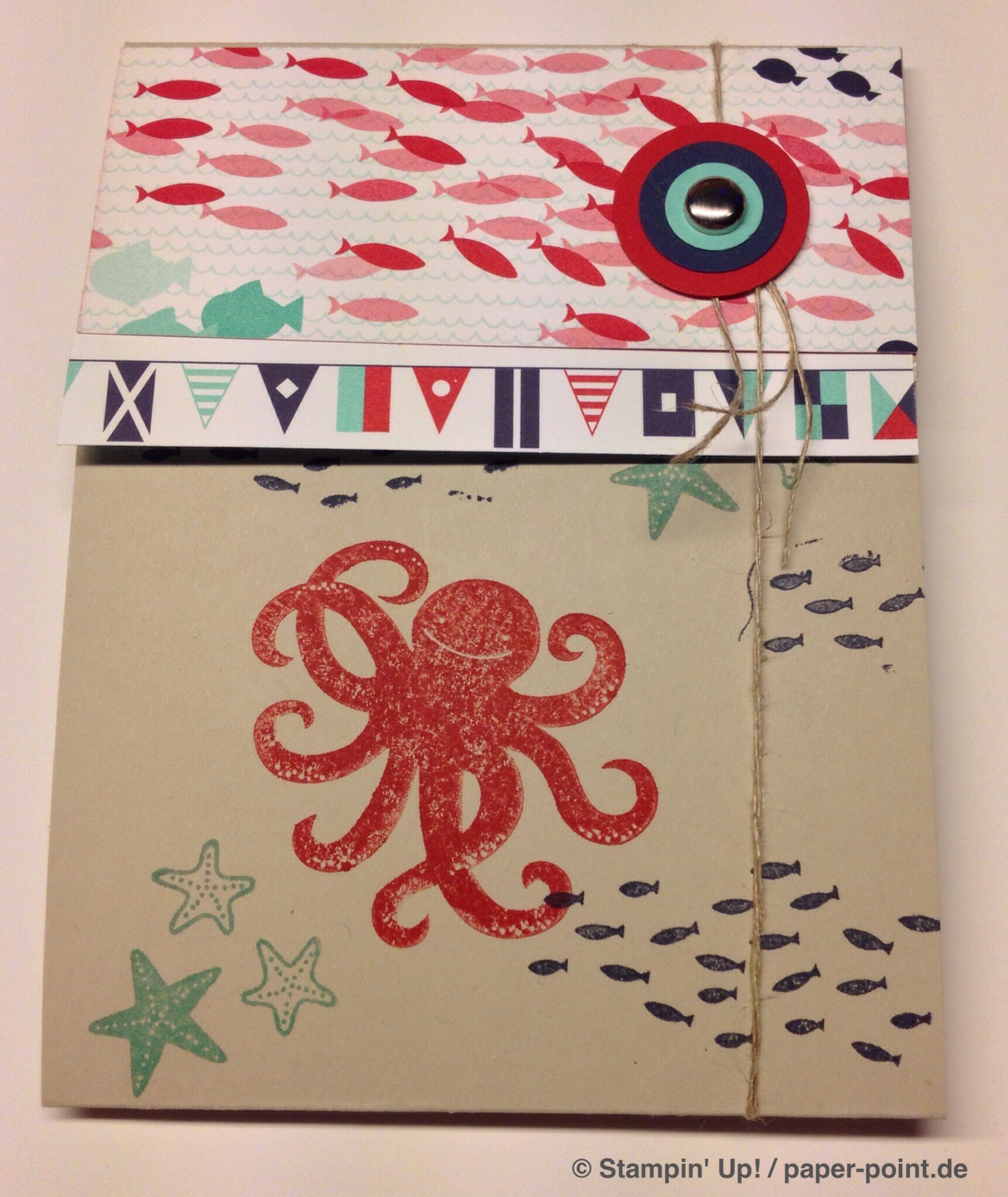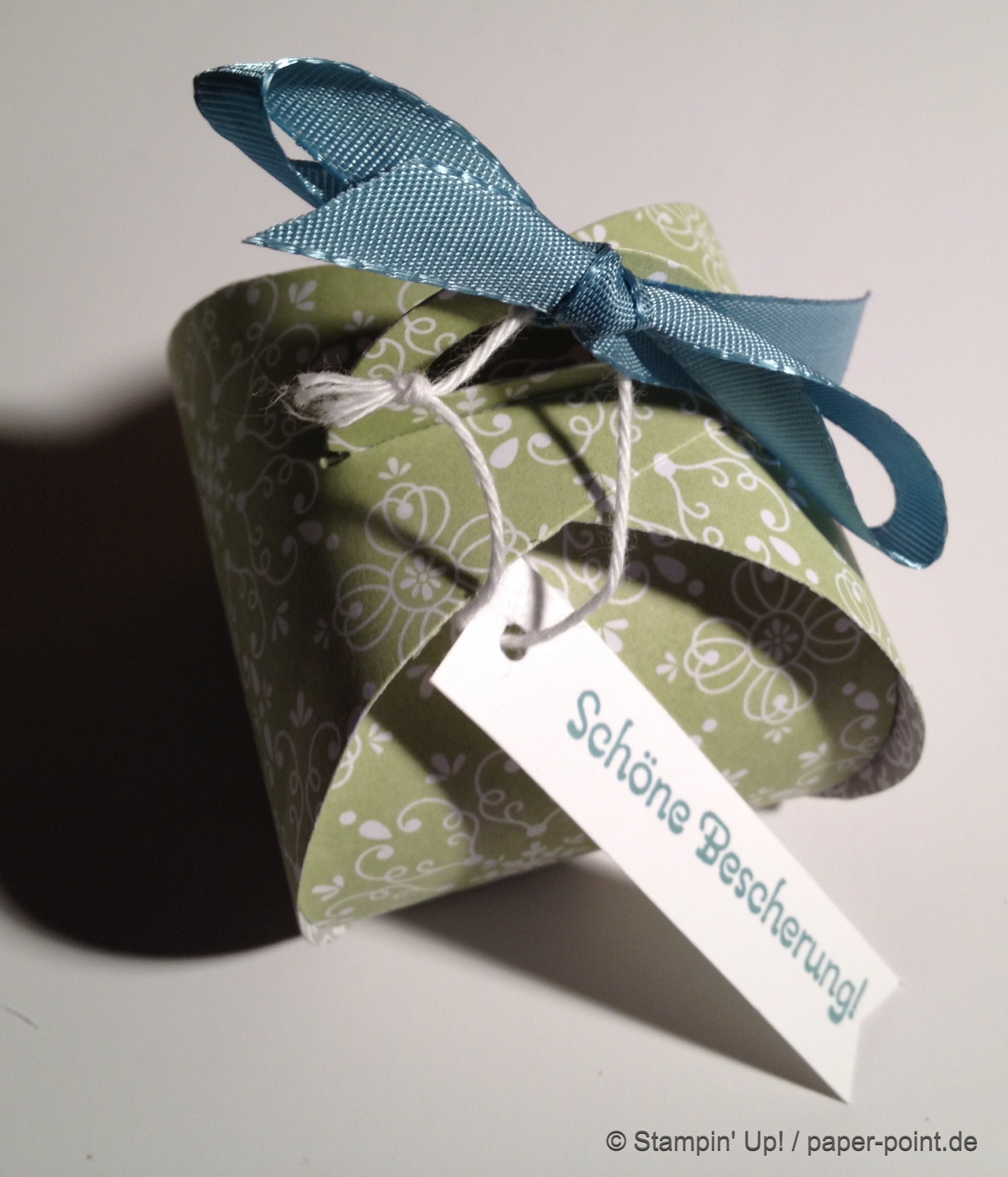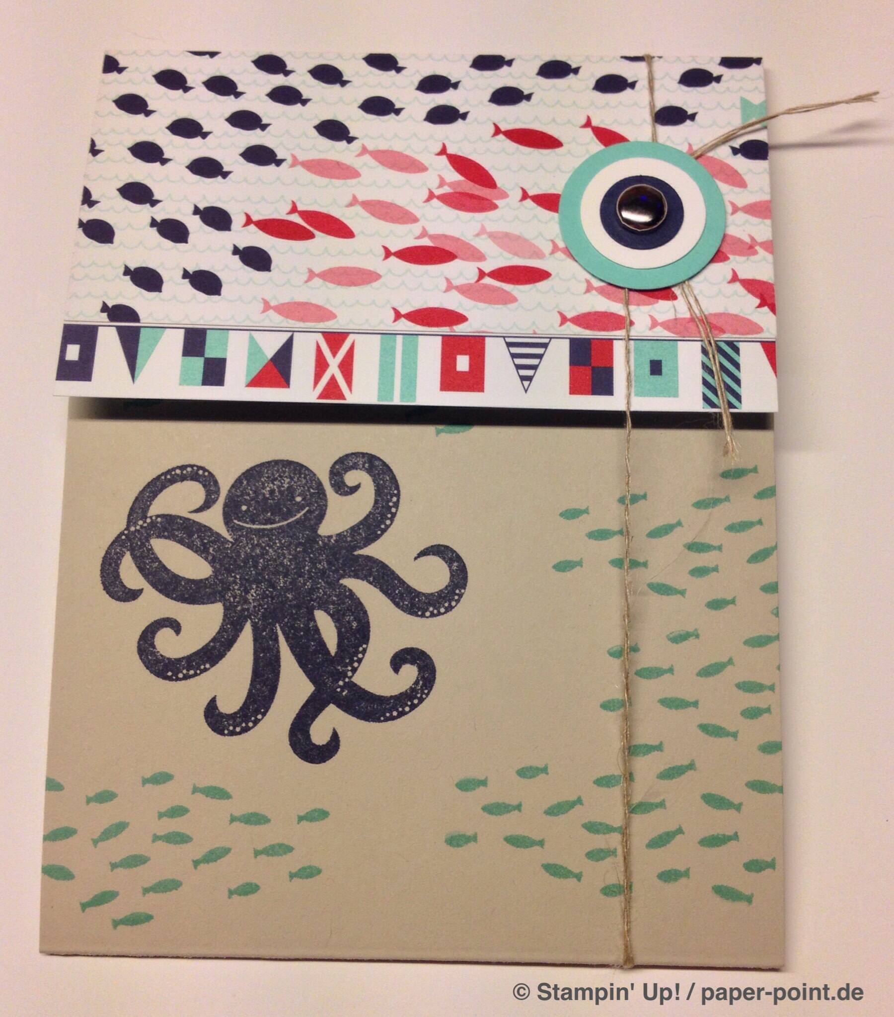 Und nun zur „Füllung“. Ich habe kleine Kaustreifen mit einem vorher bestempelten Fähnchen (Fähnchenstanze) verziert, bei dem ich noch ein Stück Leinenfaden mit reingetackert habe. Diesen Leinenfaden einfach zu einer Schleife binden – voilà, fertig!