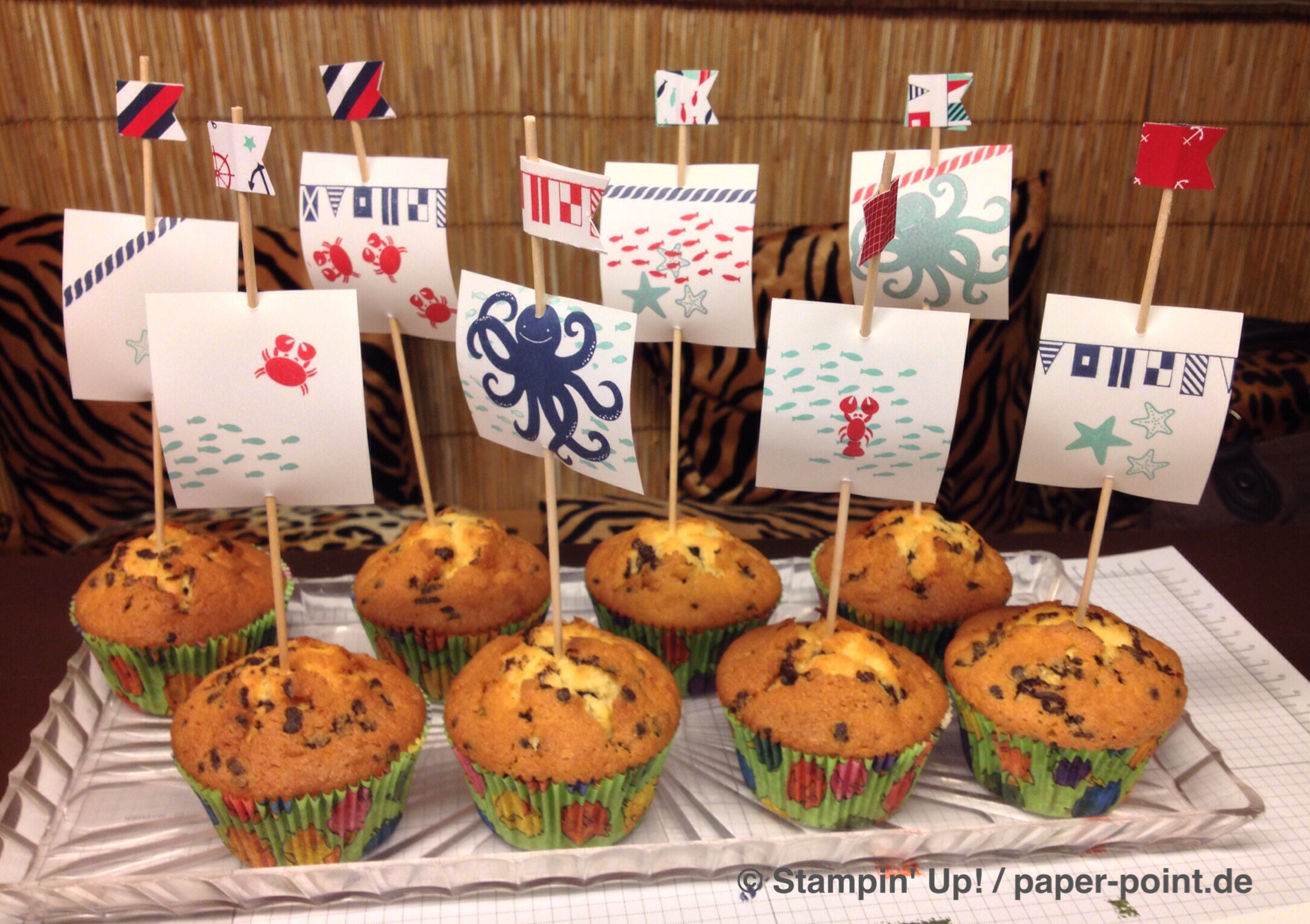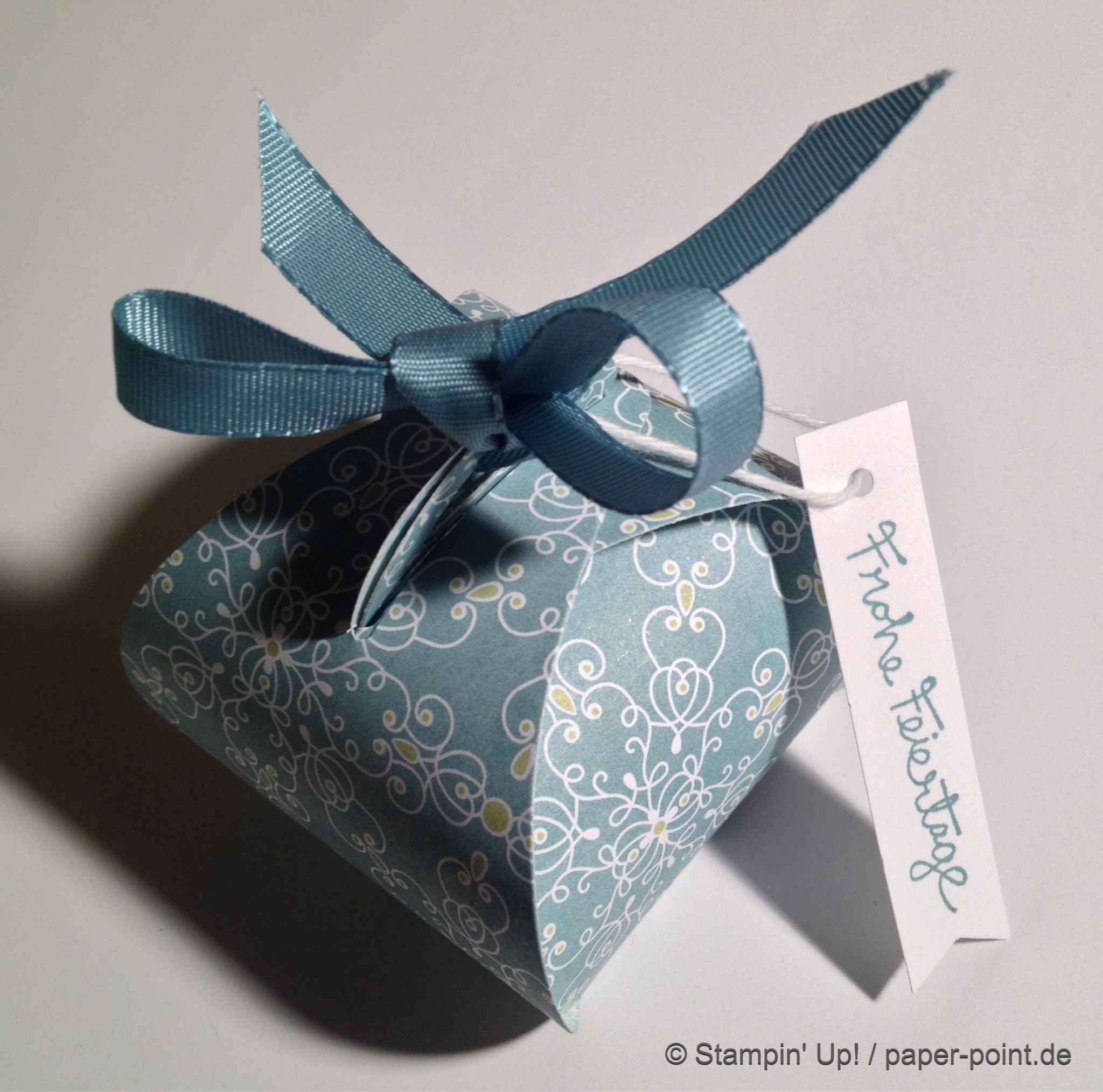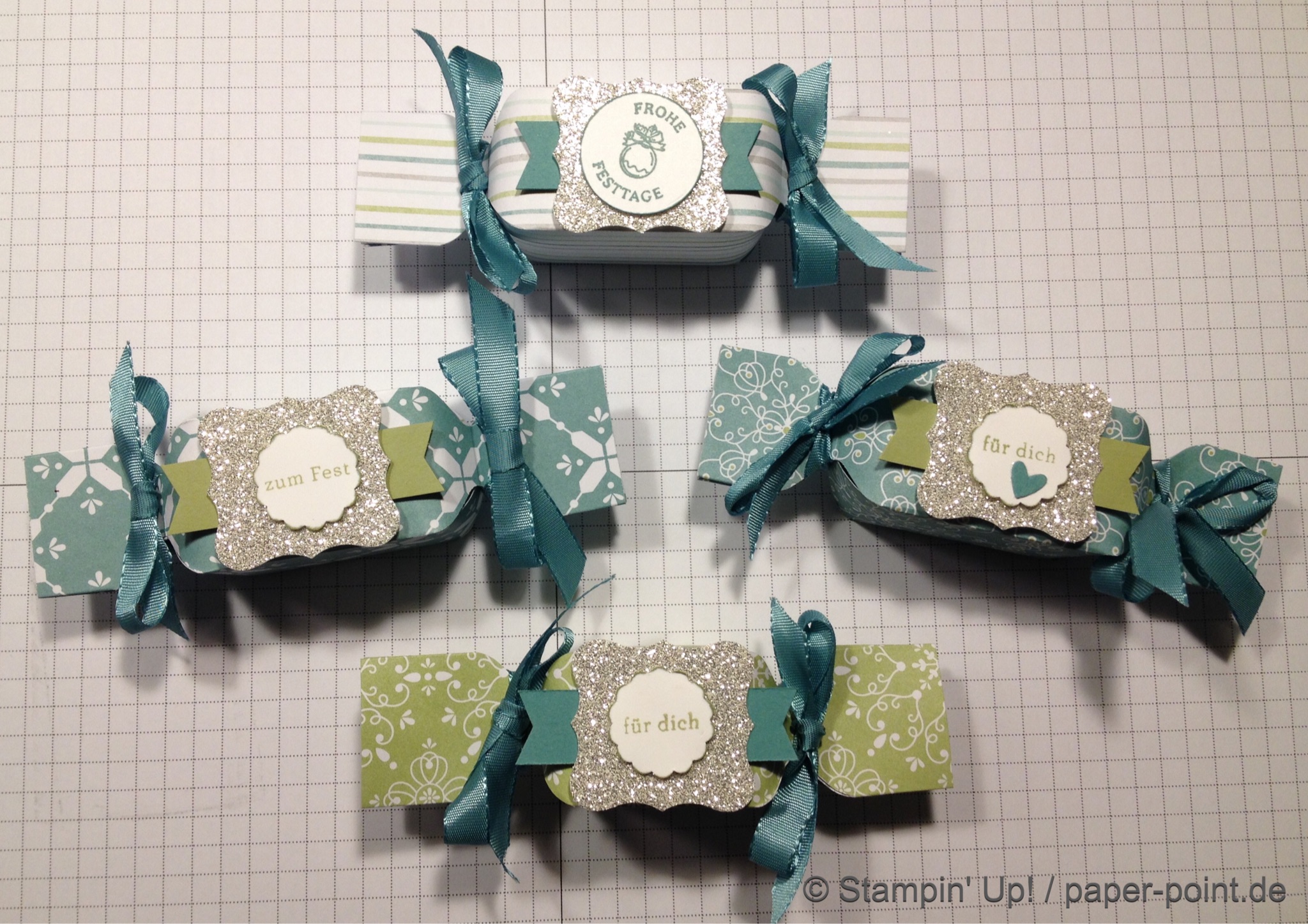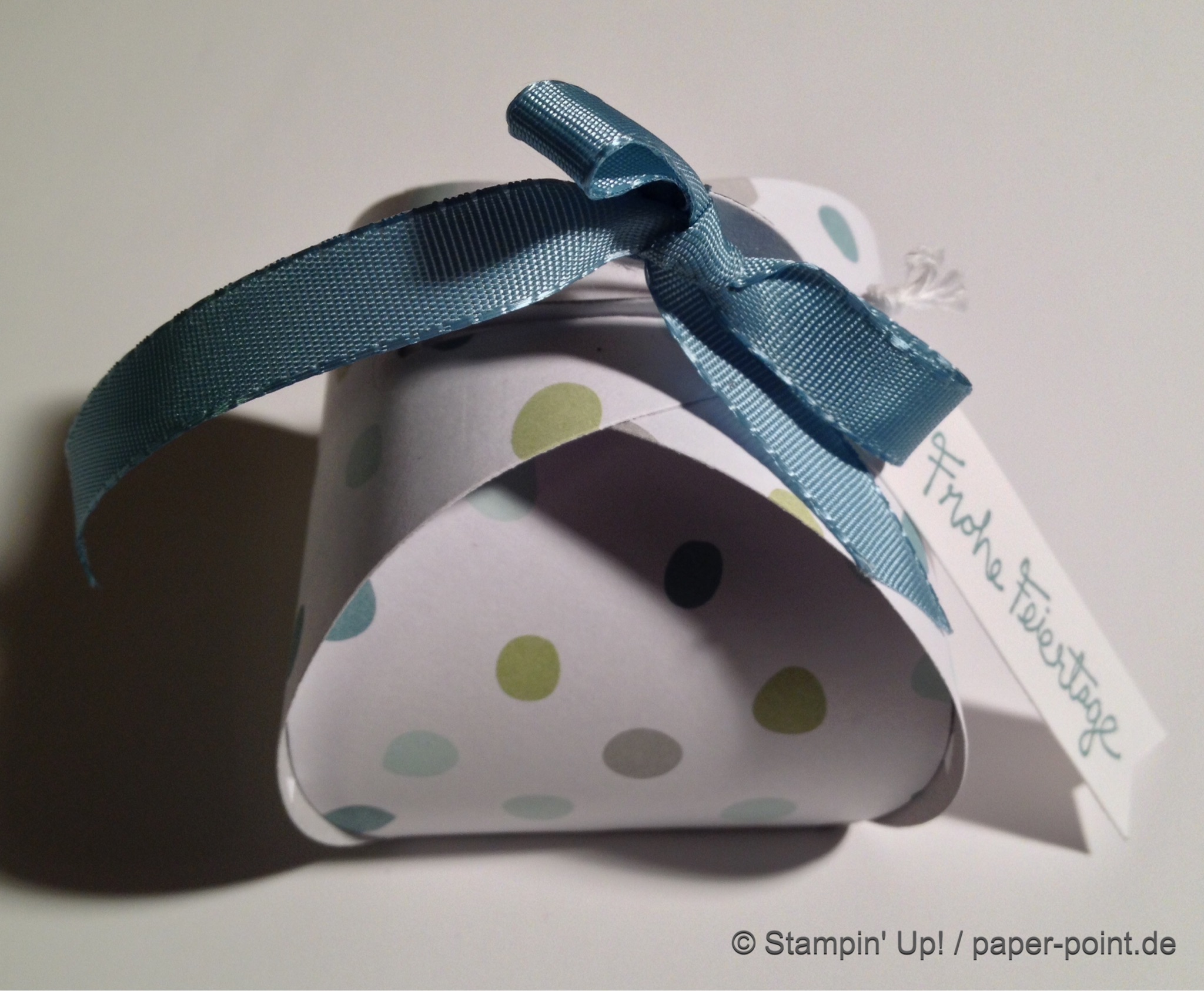 Und nun zur „Füllung“. Ich habe kleine Kaustreifen mit einem vorher bestempelten Fähnchen (Fähnchenstanze) verziert, bei dem ich noch ein Stück Leinenfaden mit reingetackert habe. Diesen Leinenfaden einfach zu einer Schleife binden – voilà, fertig!