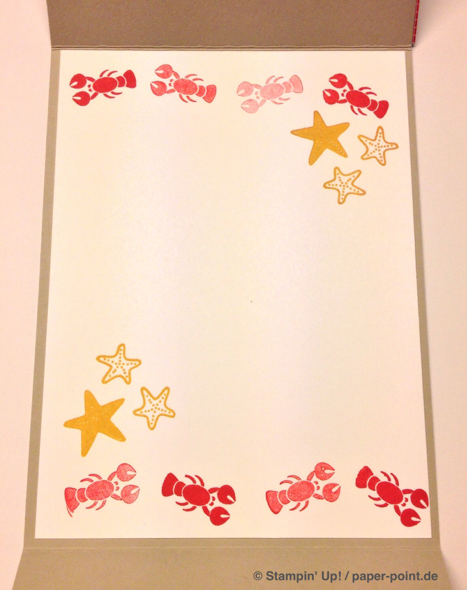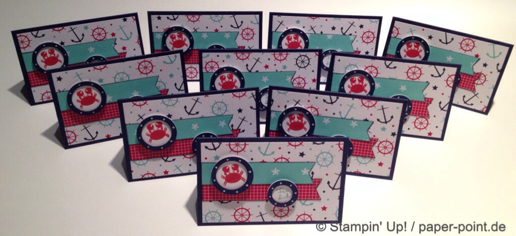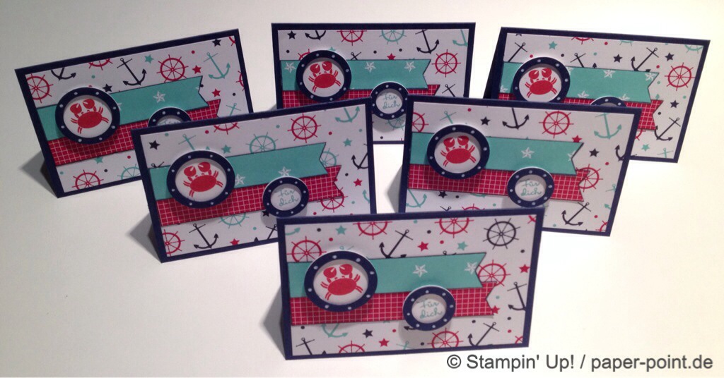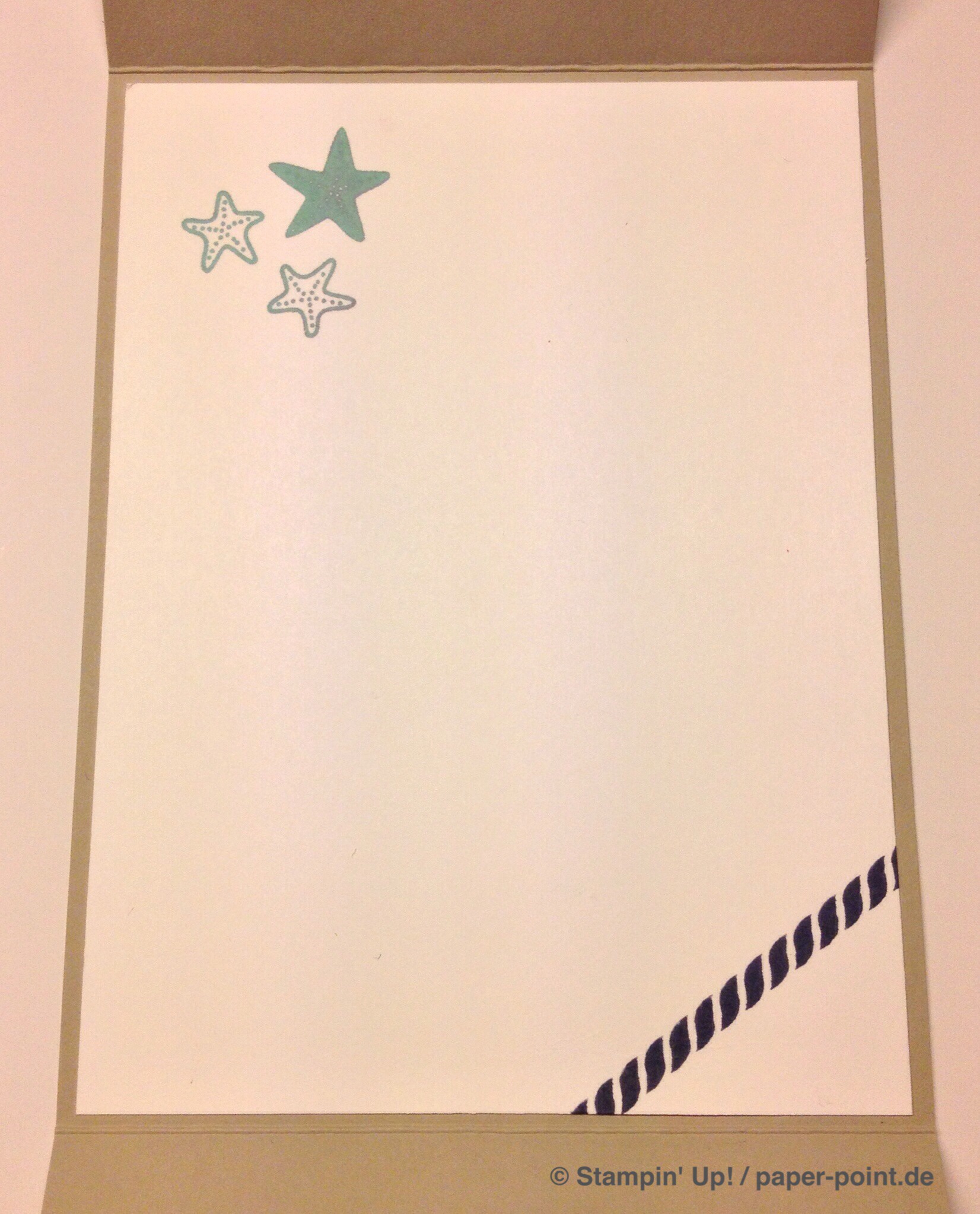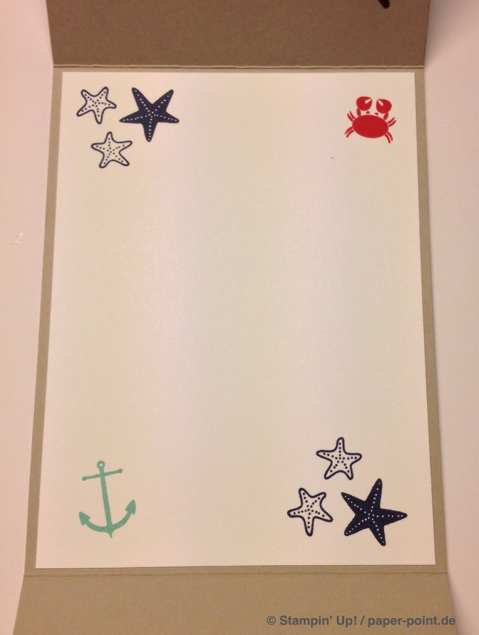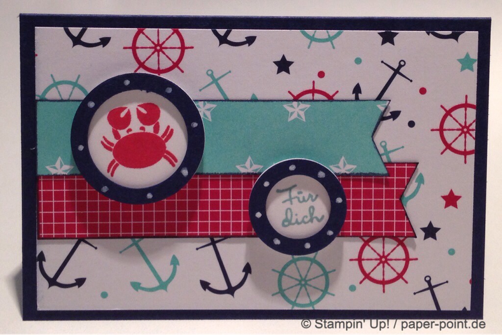 Man benötigt ein Stück Farbkarton (8,5 x 9,9 cm) in Flüsterweiß und bestempelt es mit dem Stempelset „Sea Street“ in den Farben Jade, Marineblau und Glutrot: