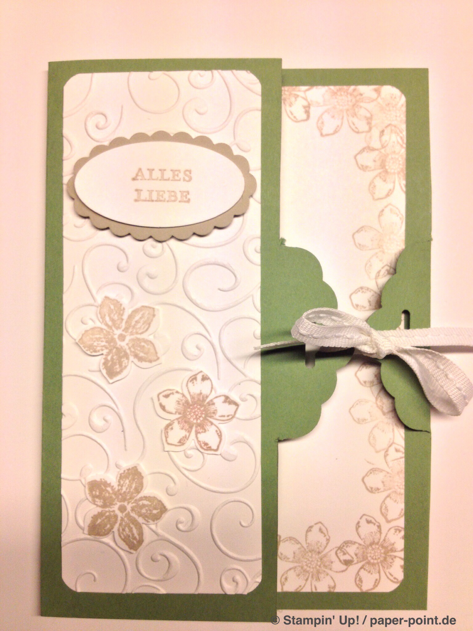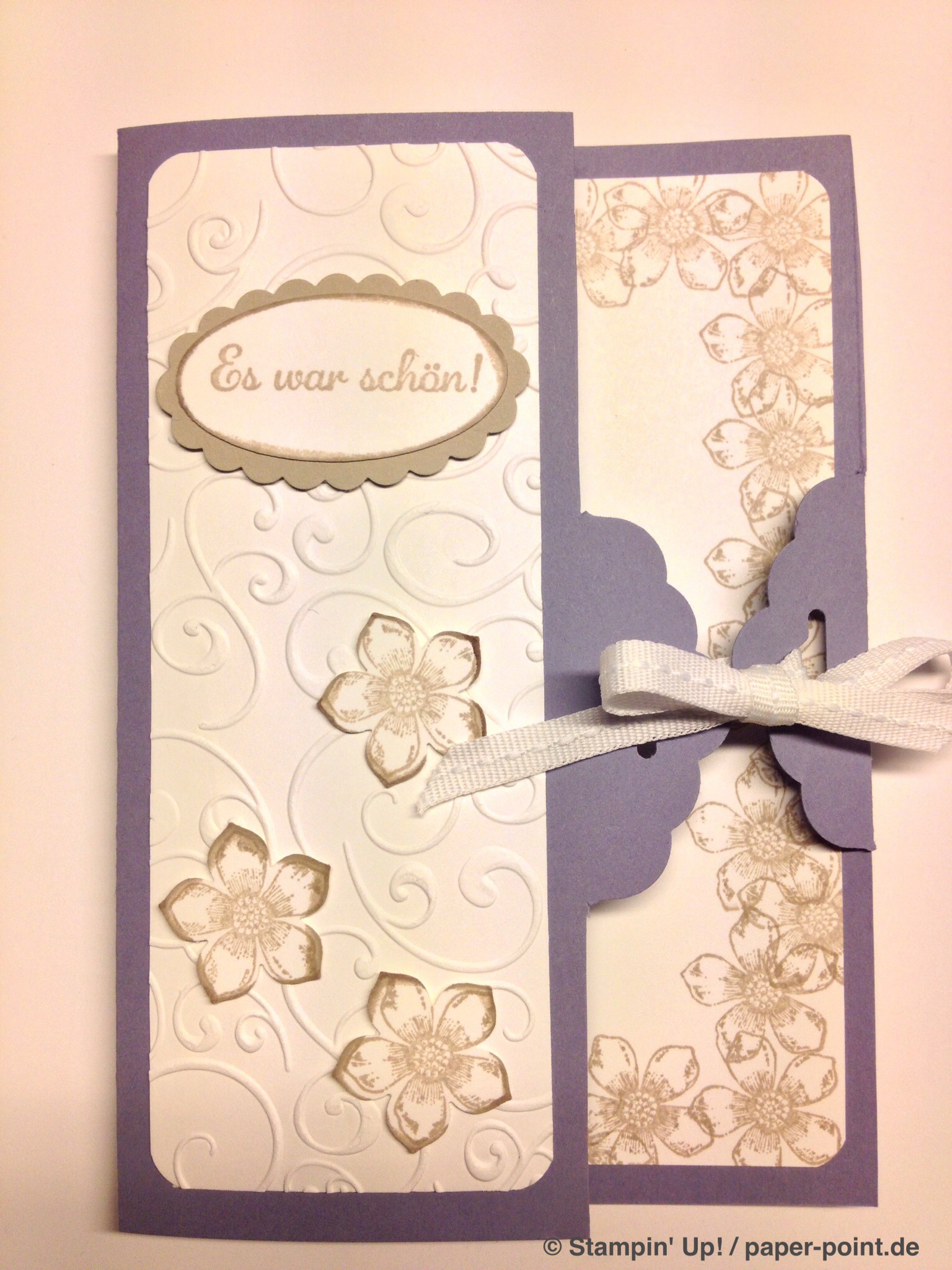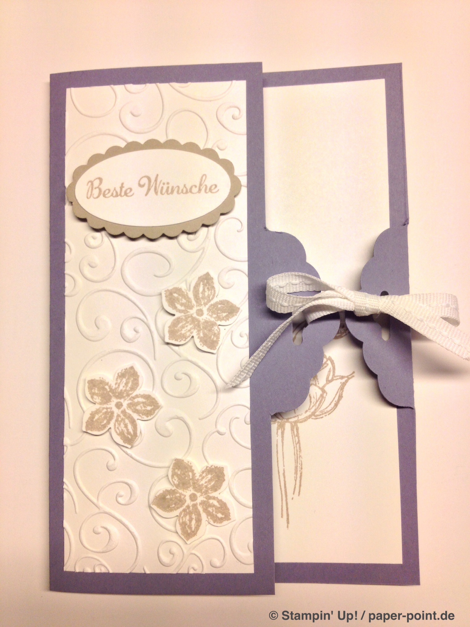 Unsere erste Karte war eine Einsteckkarte. In die untere Lasche kann man noch einen Gutschein oder einen Geldschein hineinstecken und dann bleibt innen noch genügend Platz für persönliche Grüße. Den „Verschluss“ haben wir mit dem Stanz- und Falzbrett hergestellt. Wir haben die obere Lasche jeweils 1″ von rechts und 1″ von links gestanzt, dann kann man sie in die untere Lasche stecken zum Verschließen.