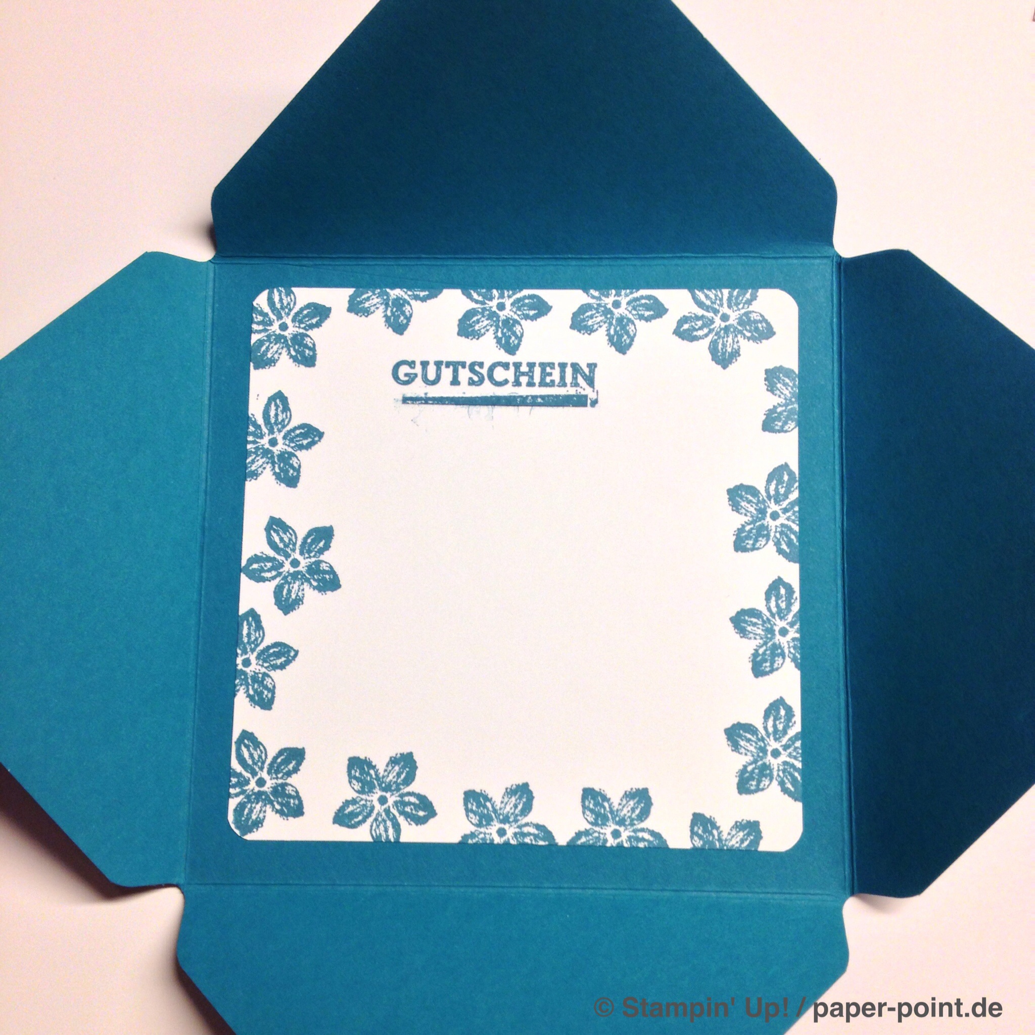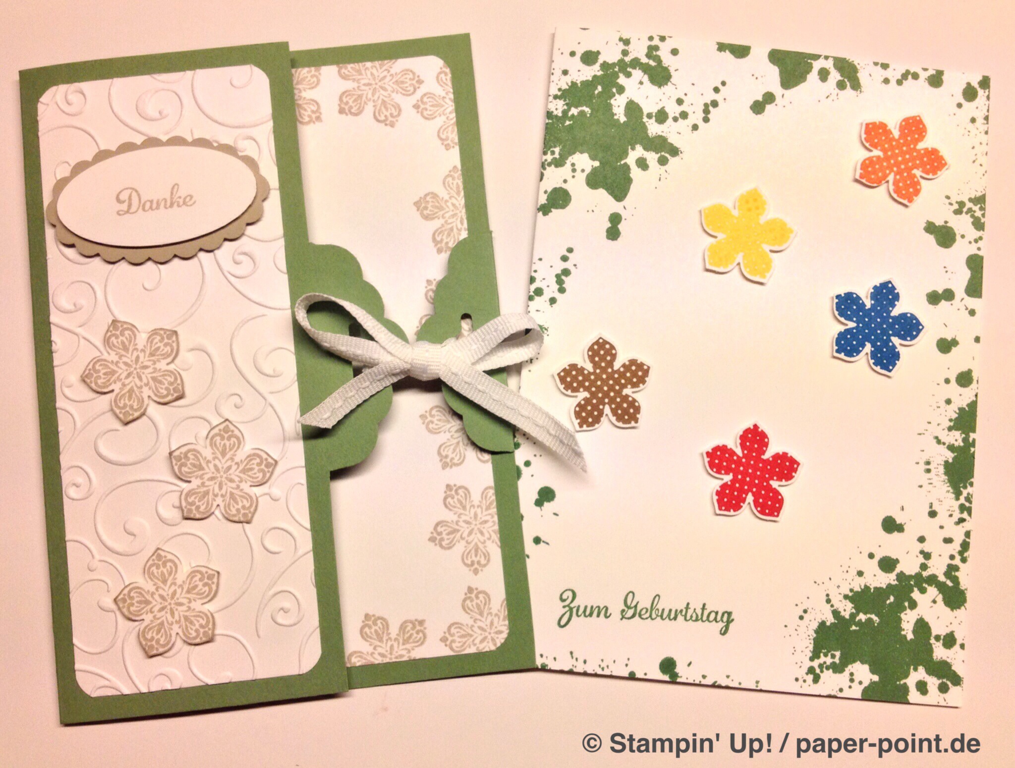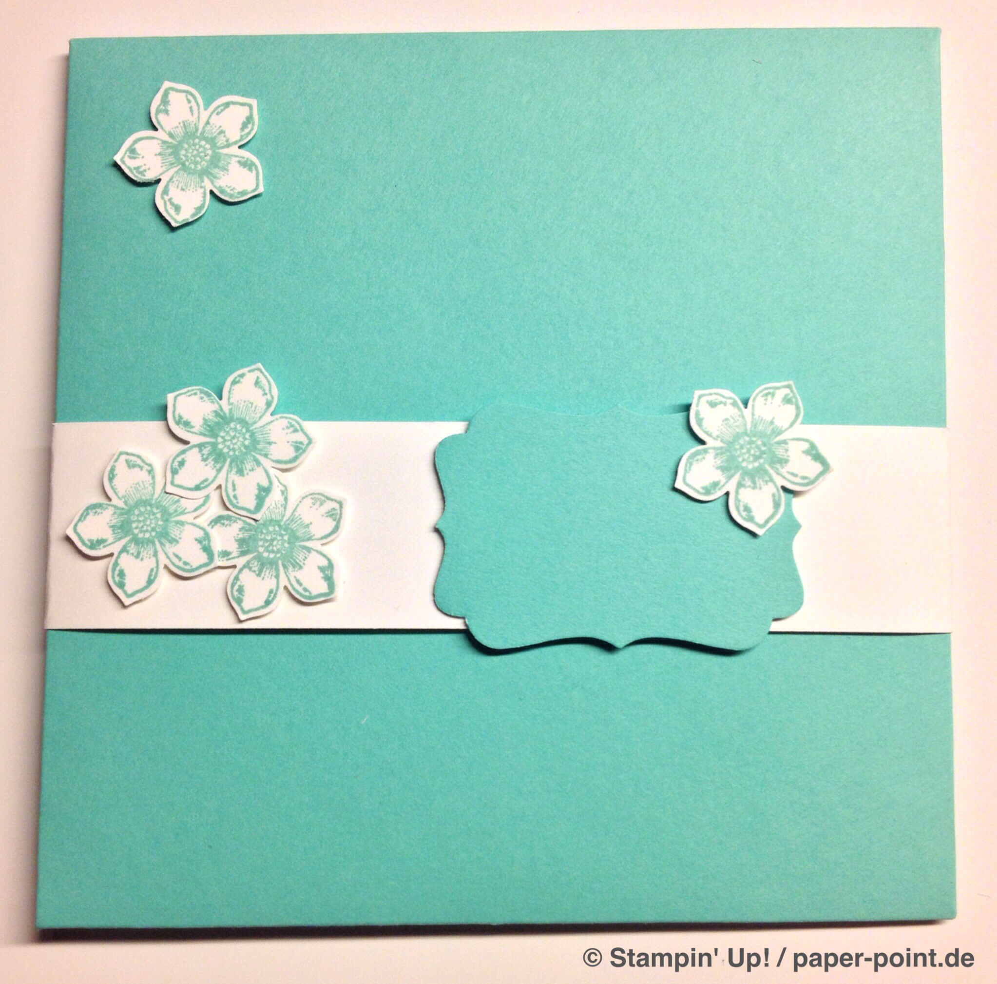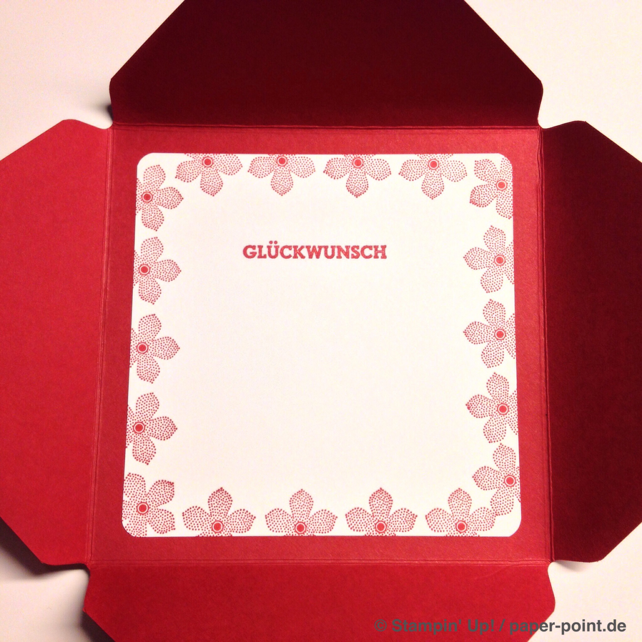 Unsere erste Karte war eine Einsteckkarte. In die untere Lasche kann man noch einen Gutschein oder einen Geldschein hineinstecken und dann bleibt innen noch genügend Platz für persönliche Grüße. Den „Verschluss“ haben wir mit dem Stanz- und Falzbrett hergestellt. Wir haben die obere Lasche jeweils 1″ von rechts und 1″ von links gestanzt, dann kann man sie in die untere Lasche stecken zum Verschließen.