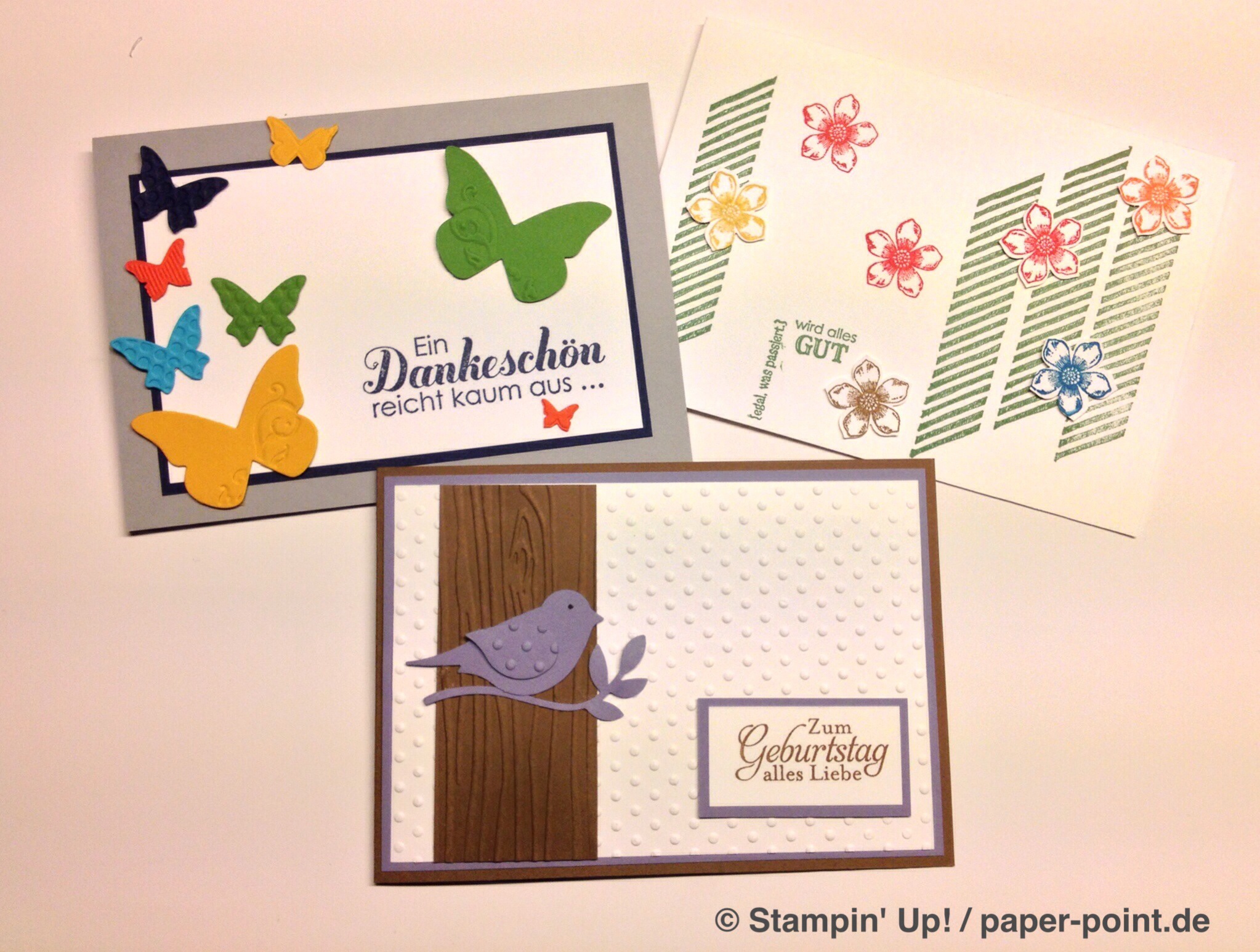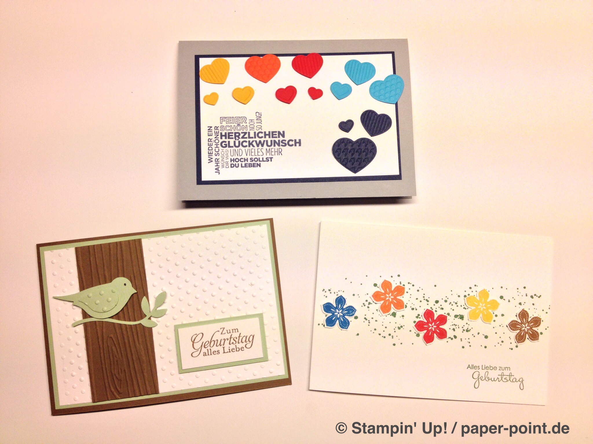 Nach einem Monat ohne Workshop war es gestern mal wieder soweit! Der große Tisch, auf dem schon die kleinen Begrüßungsgeschenke auf den Bastelunterlagen bereit lagen, wurde nach und nach mit Bastlerinnen, Farbkarton, Stempeln, Stempelkissen und weiteren Geräten und Zubehör gefüllt. Ich hatte vier Projekte zum Thema „Geburtstags- und Glückwunschkarten“ vorbereitet: