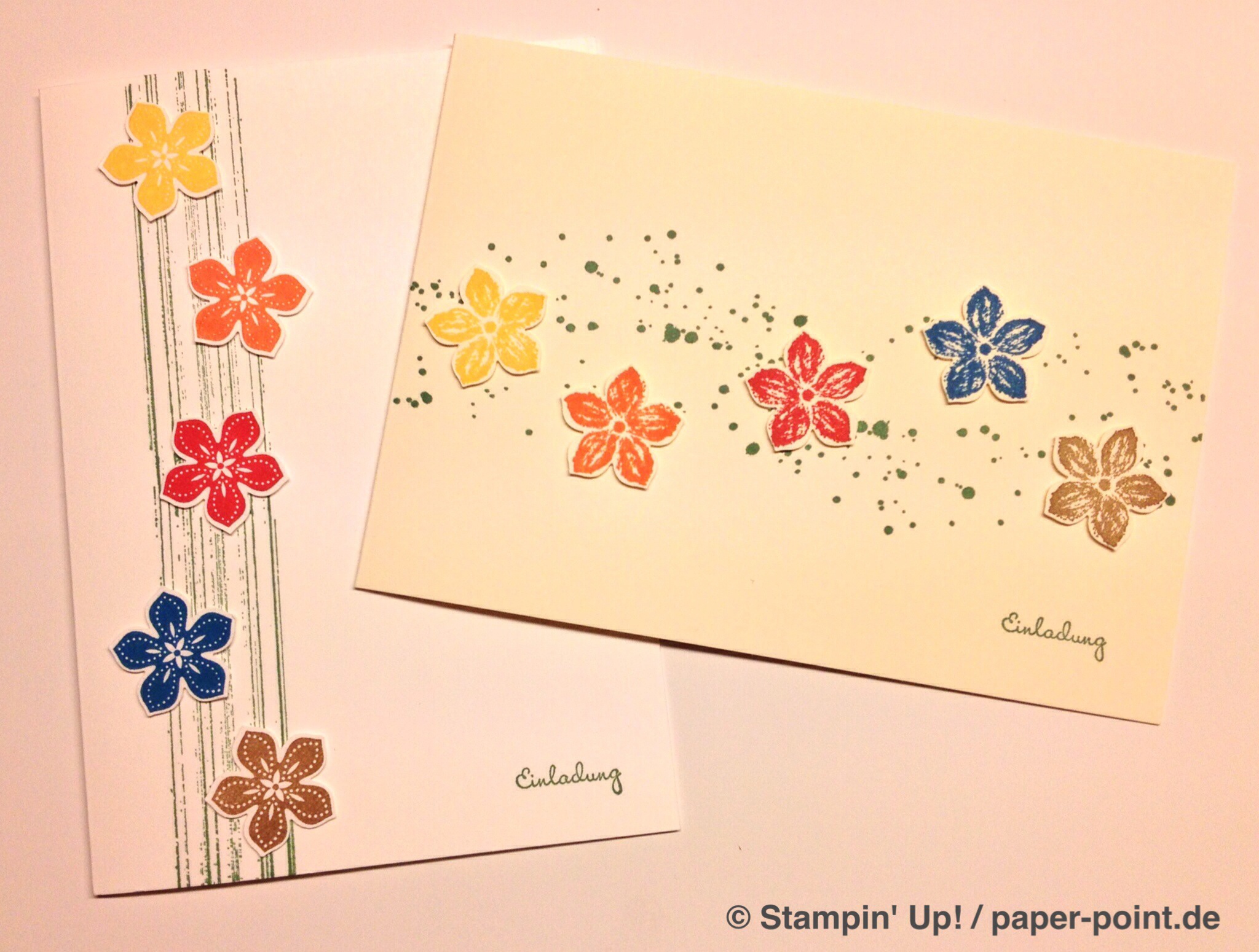 Danach haben wir mit der Stanze „Blume“ und einigen Blütenstempeln noch zwei süße kleine Grußkärtchen gebastelt.