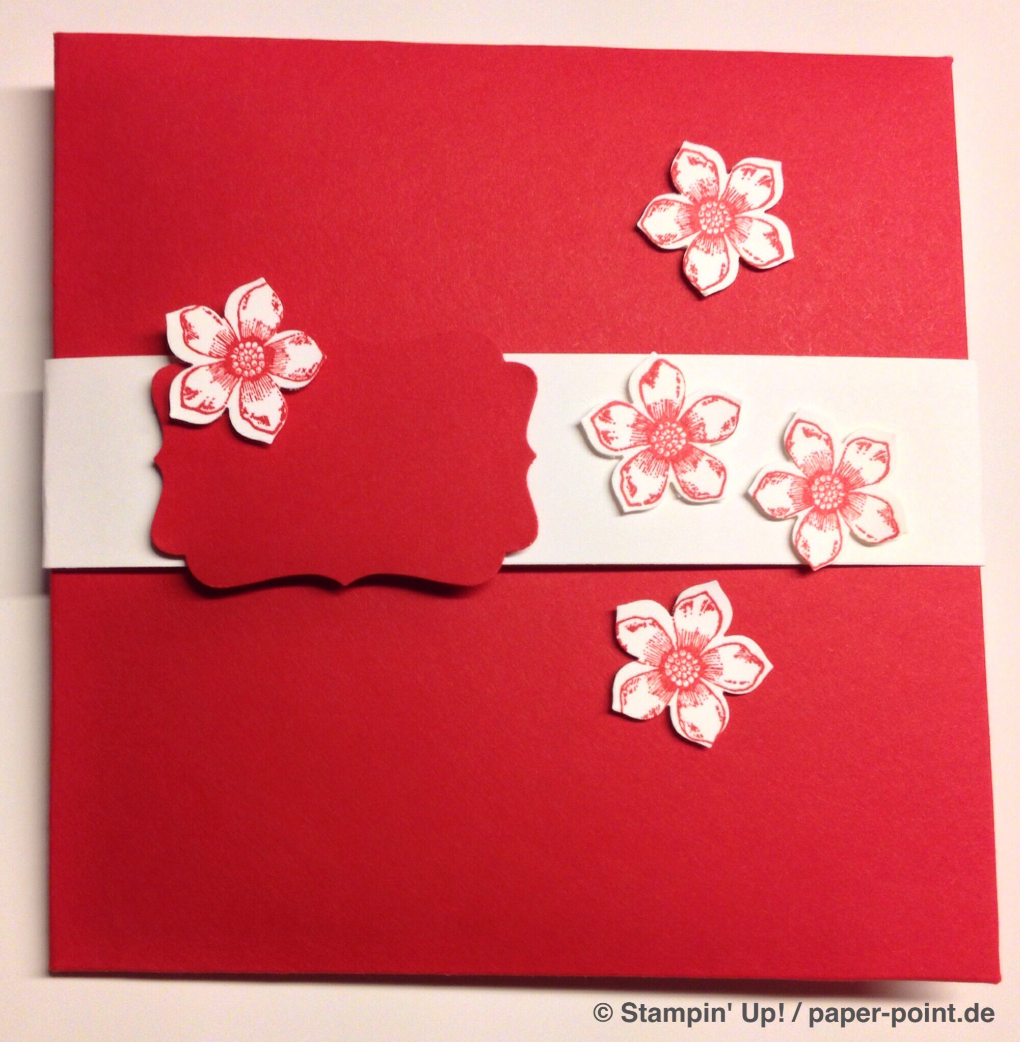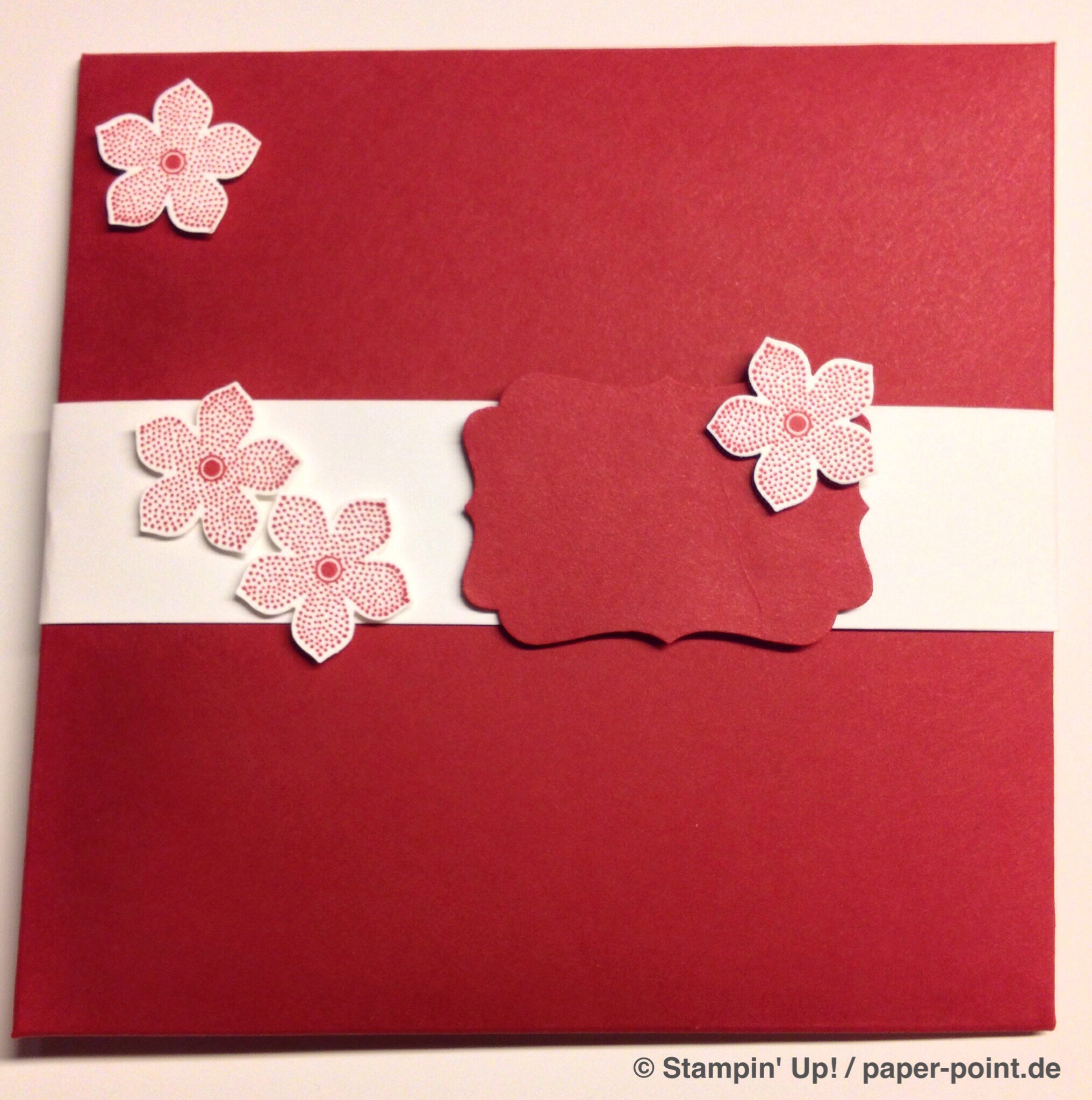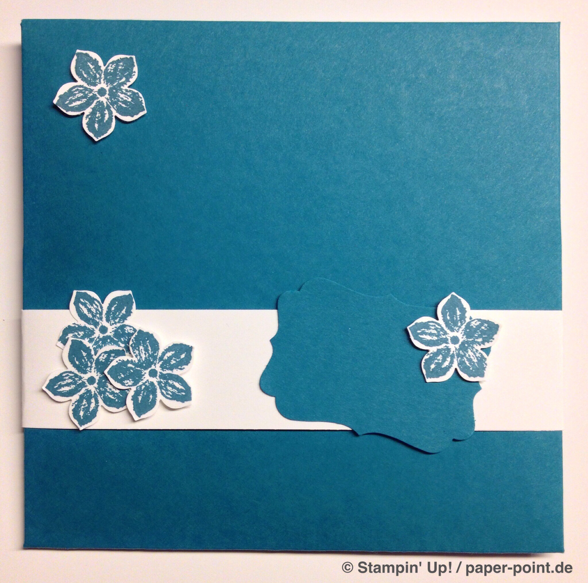 Beim dritten Projekt durfte sich jeder eine Farbe für den Umschlag aussuchen. Den Farbkarton habe ich dann quadratisch auf 21×21 cm zugeschnitten. Daraus haben wir den Umschlag für eine Karte gewerkelt, das ging natürlich am besten mit dem Stanz- und Falzbrett für Umschläge. Die Innenseite wurde noch mit einer Karte versehen und verschlossen haben wir den Umschlag mit einer Banderole. Die Blüten stammen aus dem Set „Petite Petals“ und das Namensschild ist ein „Dekoratives Etikett“.