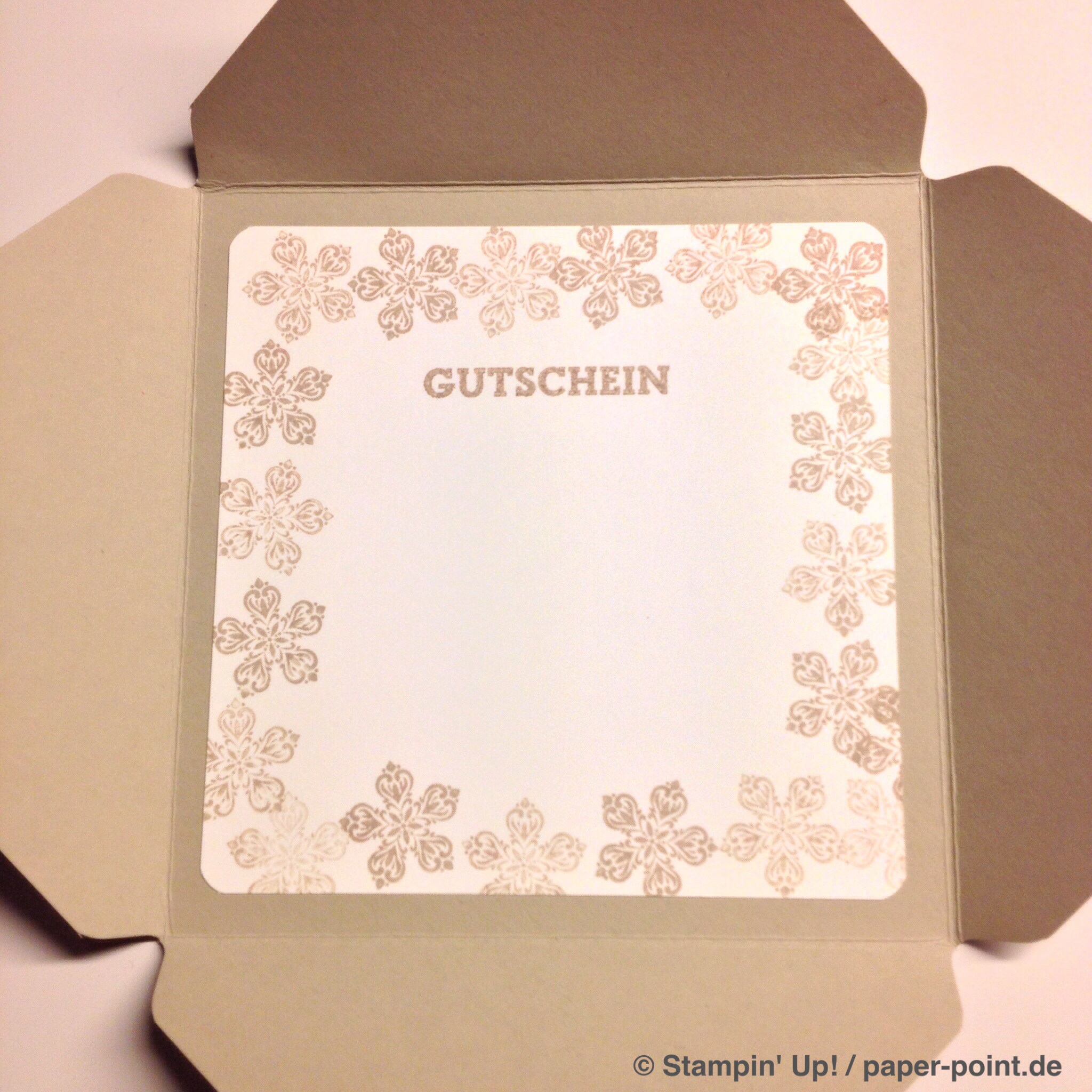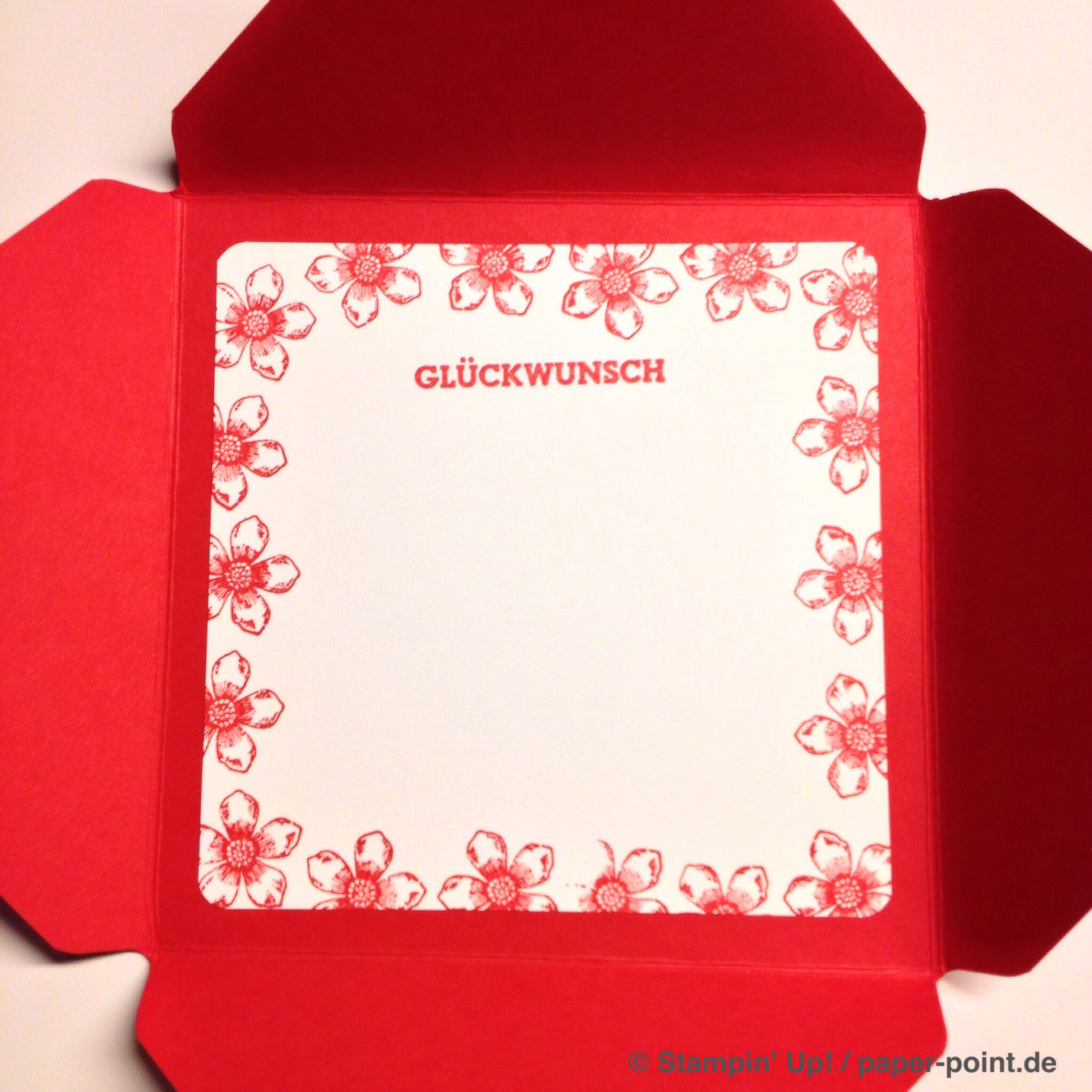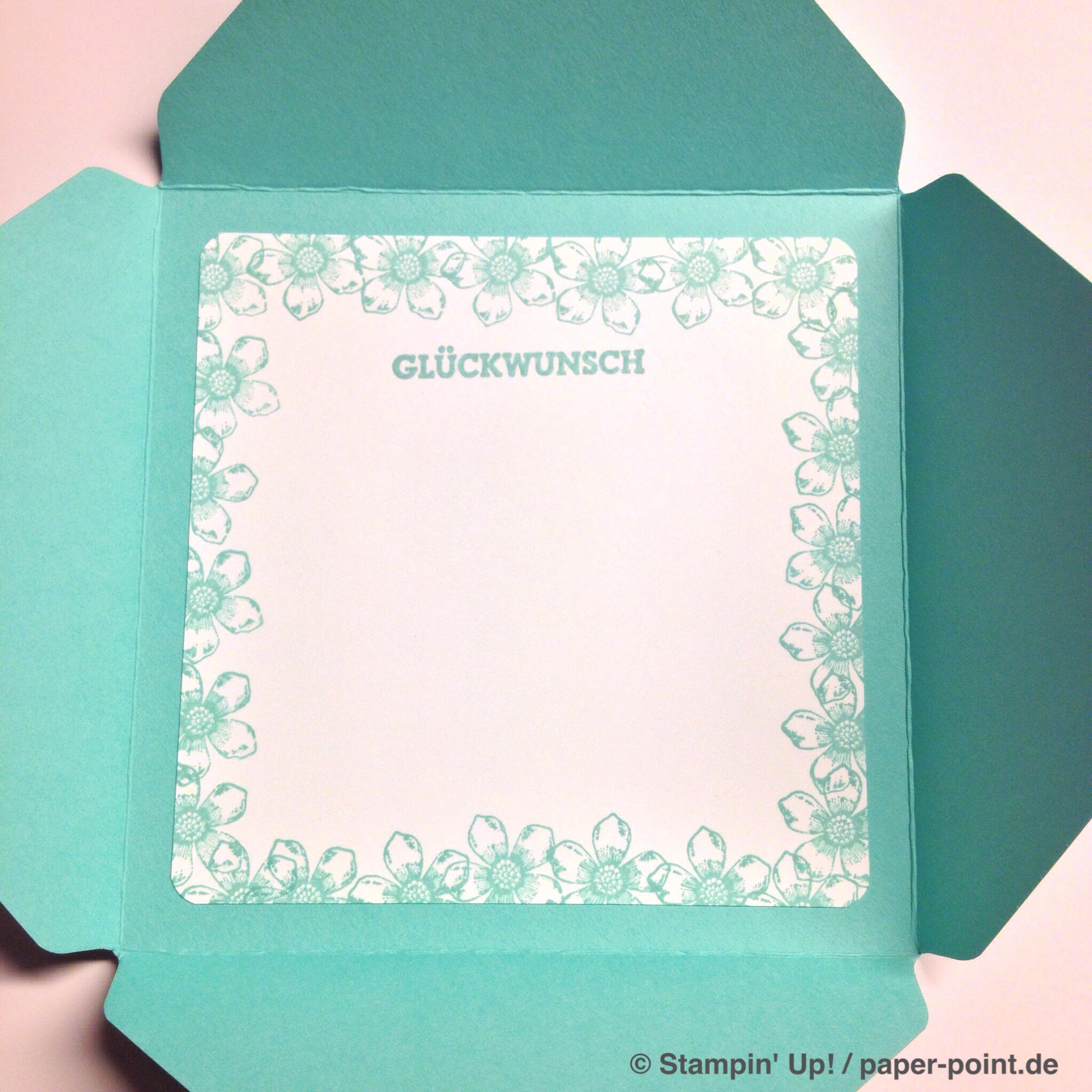 Für das Innenfutter: 8,5 x 8,5 cm (an zwei gegenüberliegenden Ecken stanzen mit dem Envelope Punch Board)