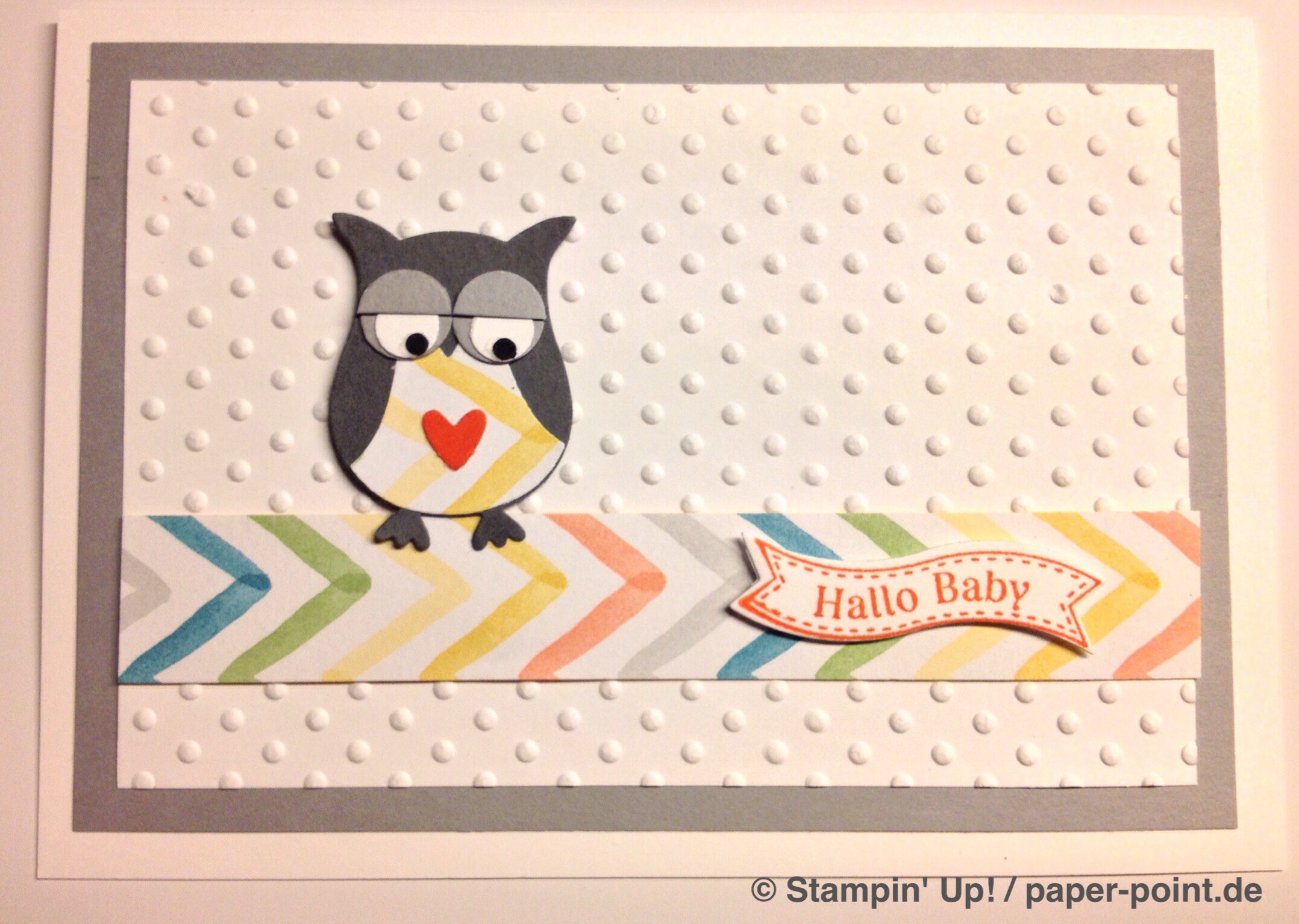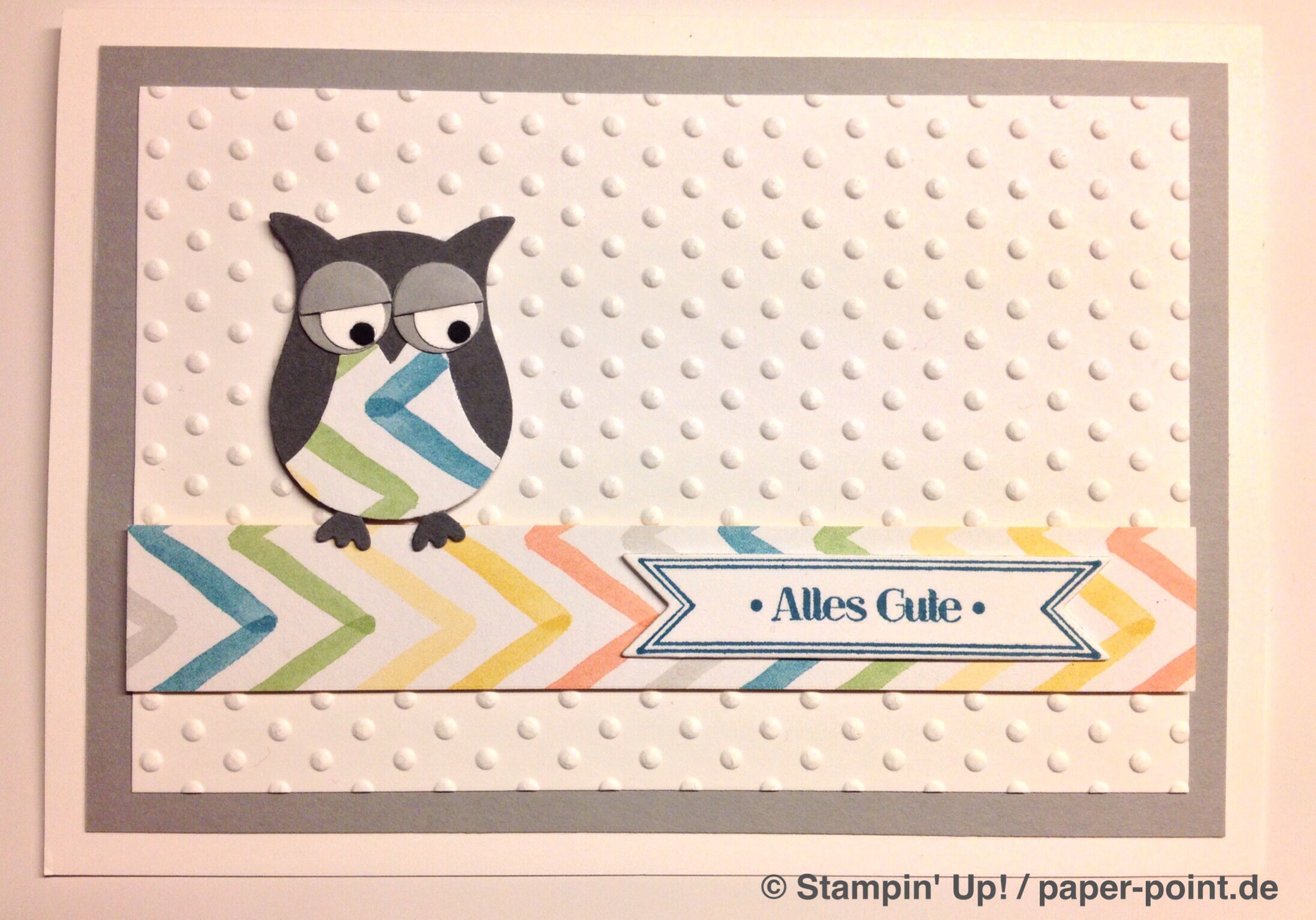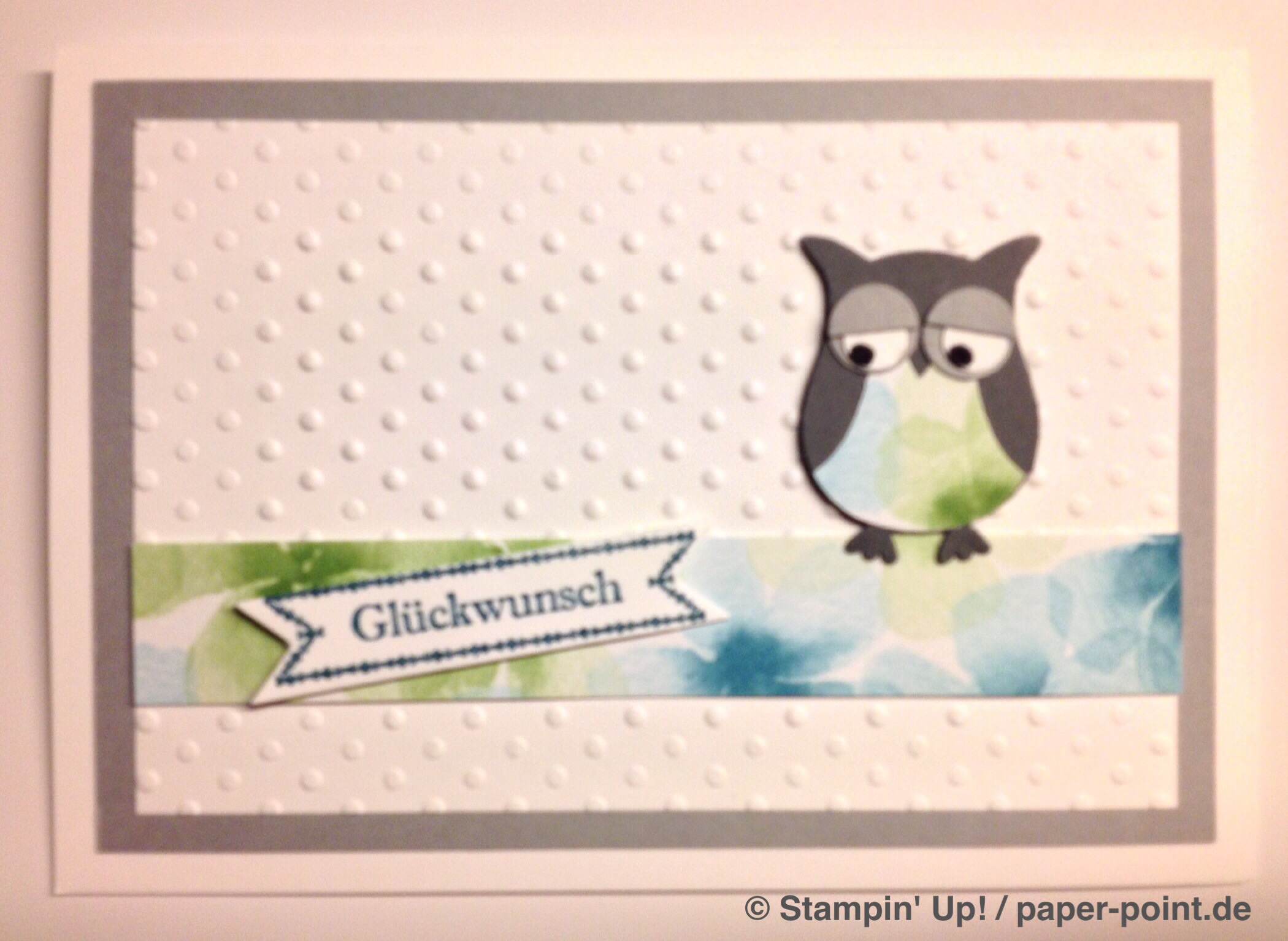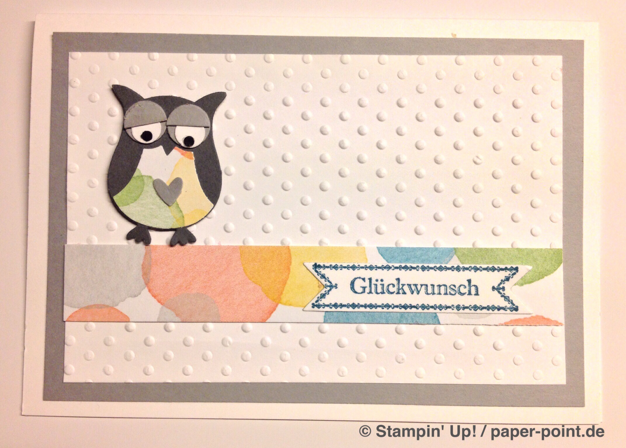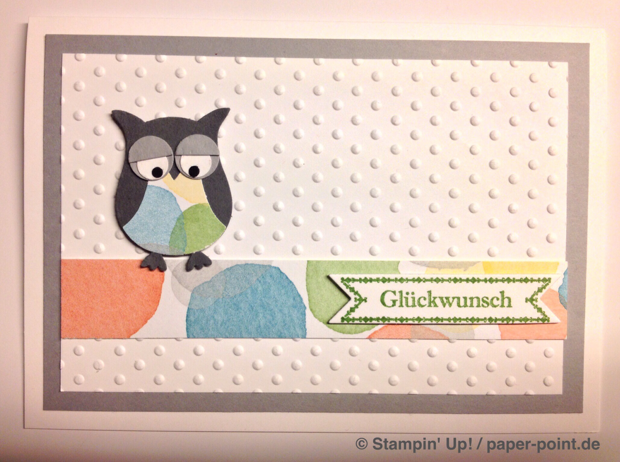 Verwendet haben wir das Designerpapier „Farbenwunder“ und die „Eulenstanze“, sowie die „Famosen Fähnchen“ mit den passenden Framelits.