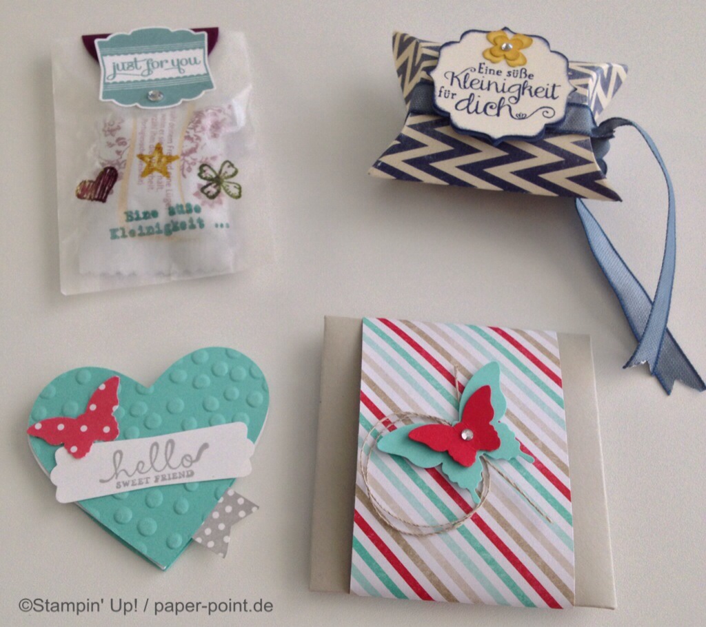 imageHier noch mal tolle Verpackungsideen: Das bestempelte Tütchen ist von Vera T., das Herz ist von Birgit B., die süße Kleinigkeit hat Angelika B. gebastelt und der Umschlag mit dem Schmetterling wurde von Tanja P. gestaltet.