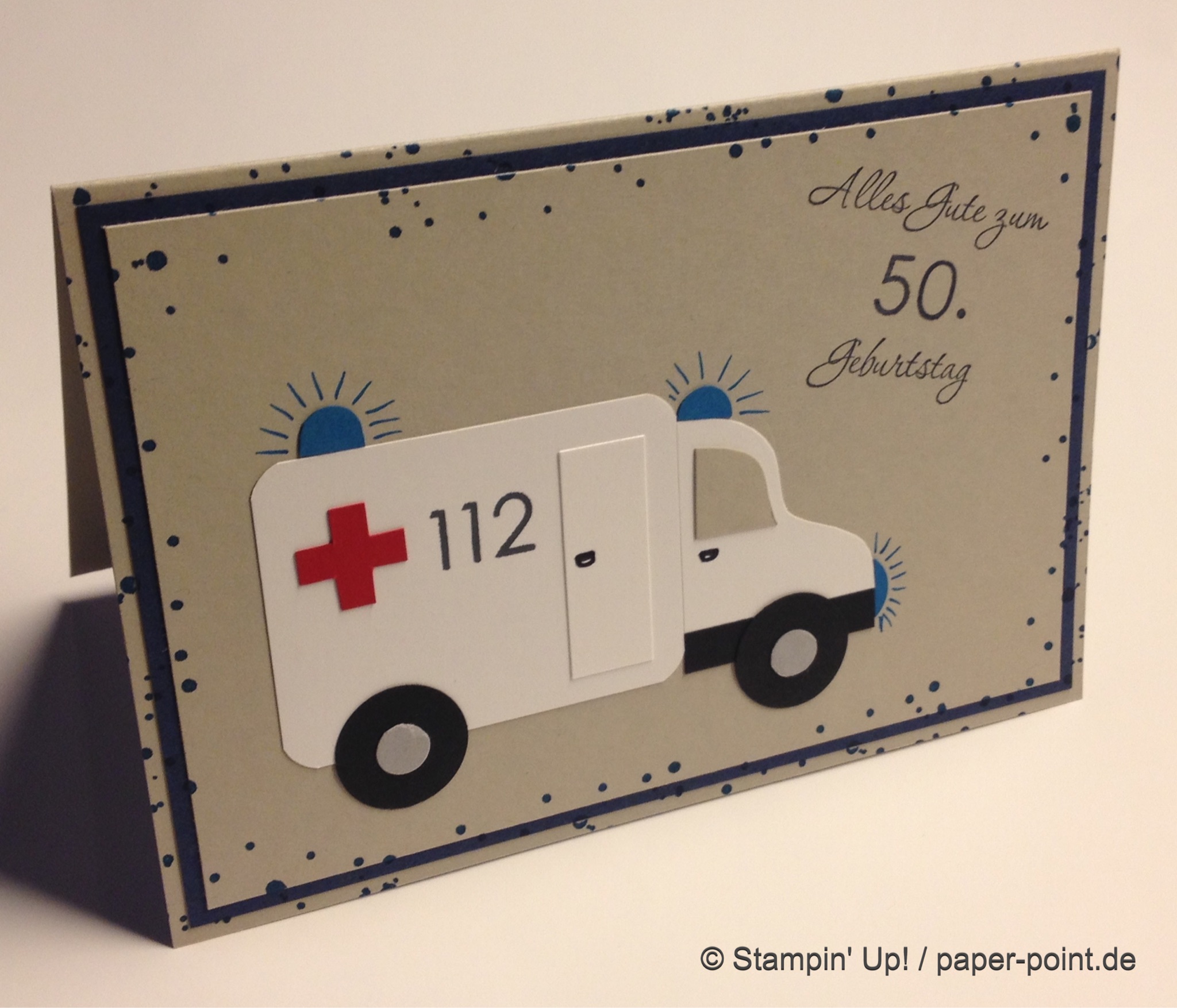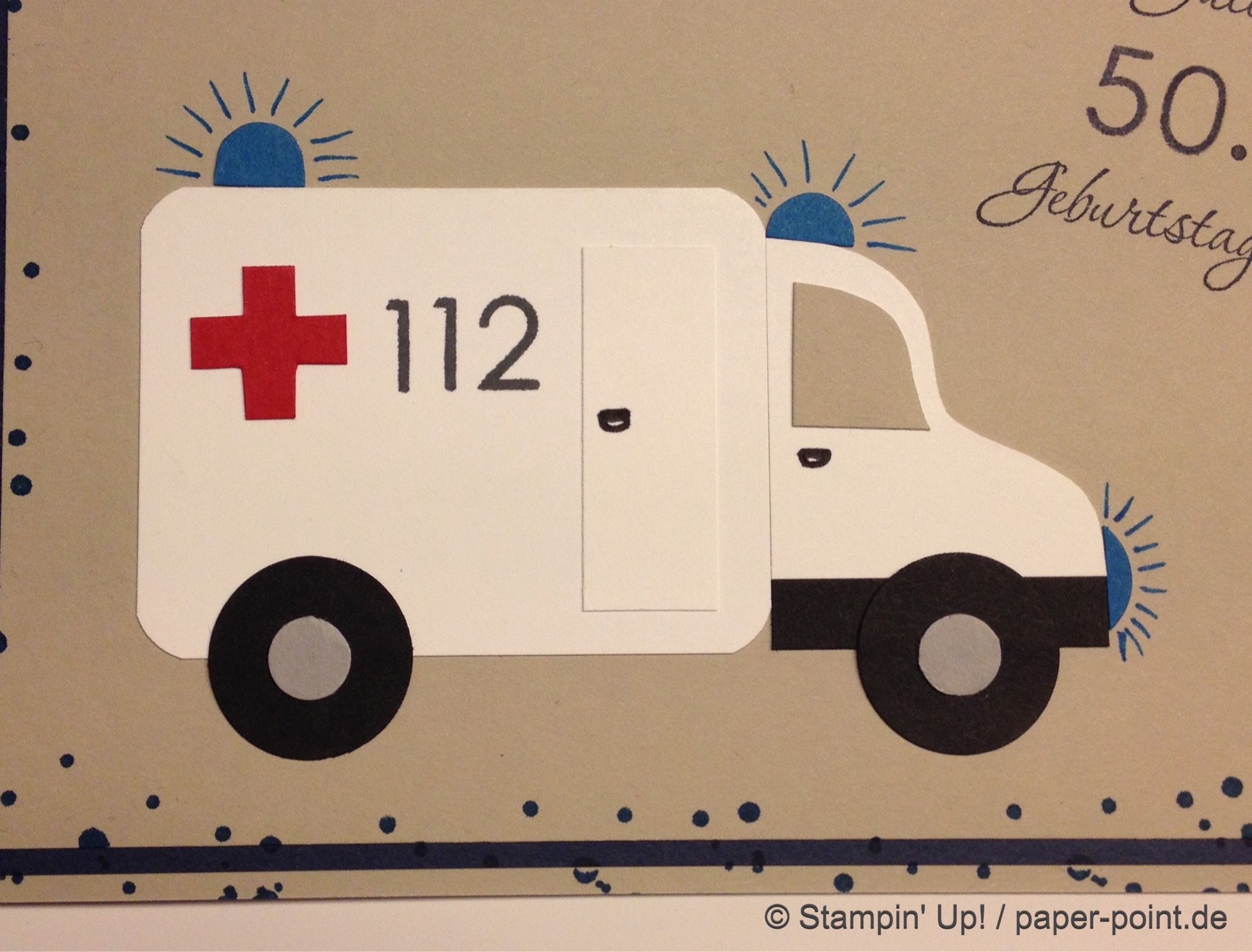 Ein paar Teile des Rettungswagens konnte ich ausstanzen, viele Teile habe ich aber auch per Hand zugeschnitten. Die 112 und die 50 habe ich mit dem „Back to Basics Alphabet“ gestempelt. Der Spruch stammt aus dem Stempelset „Zur Feier des Tages“.