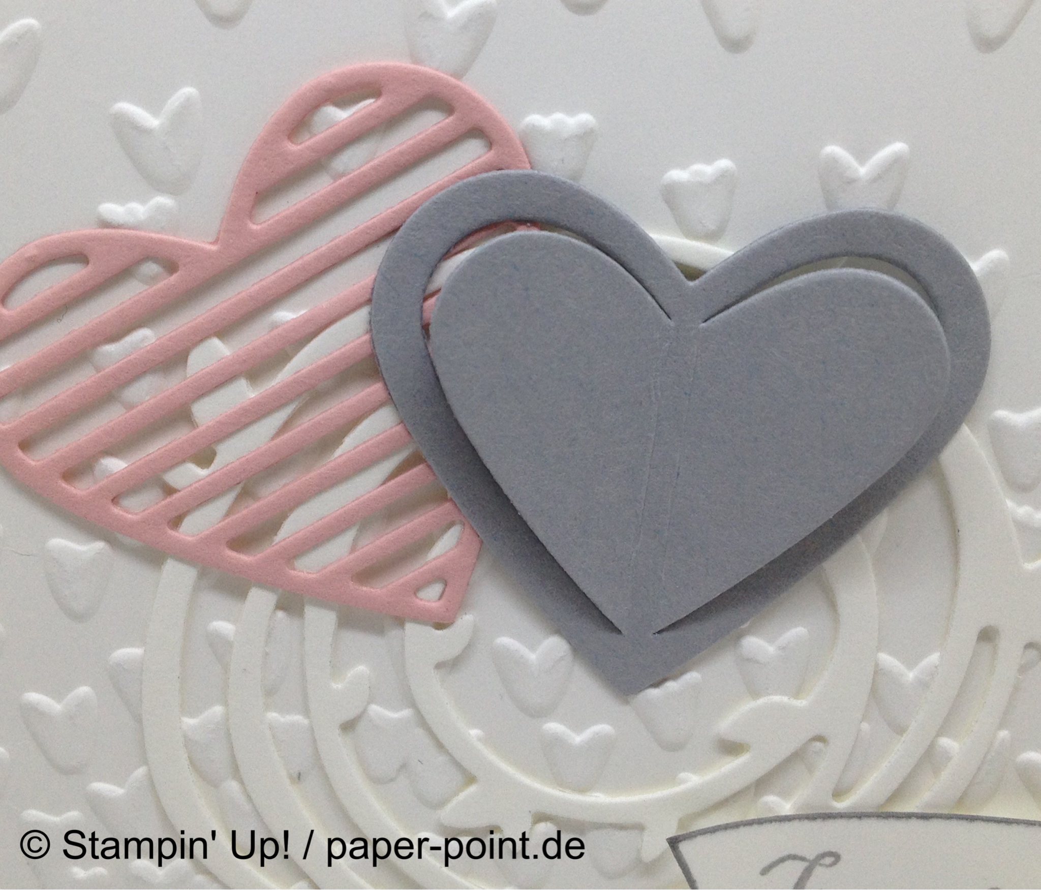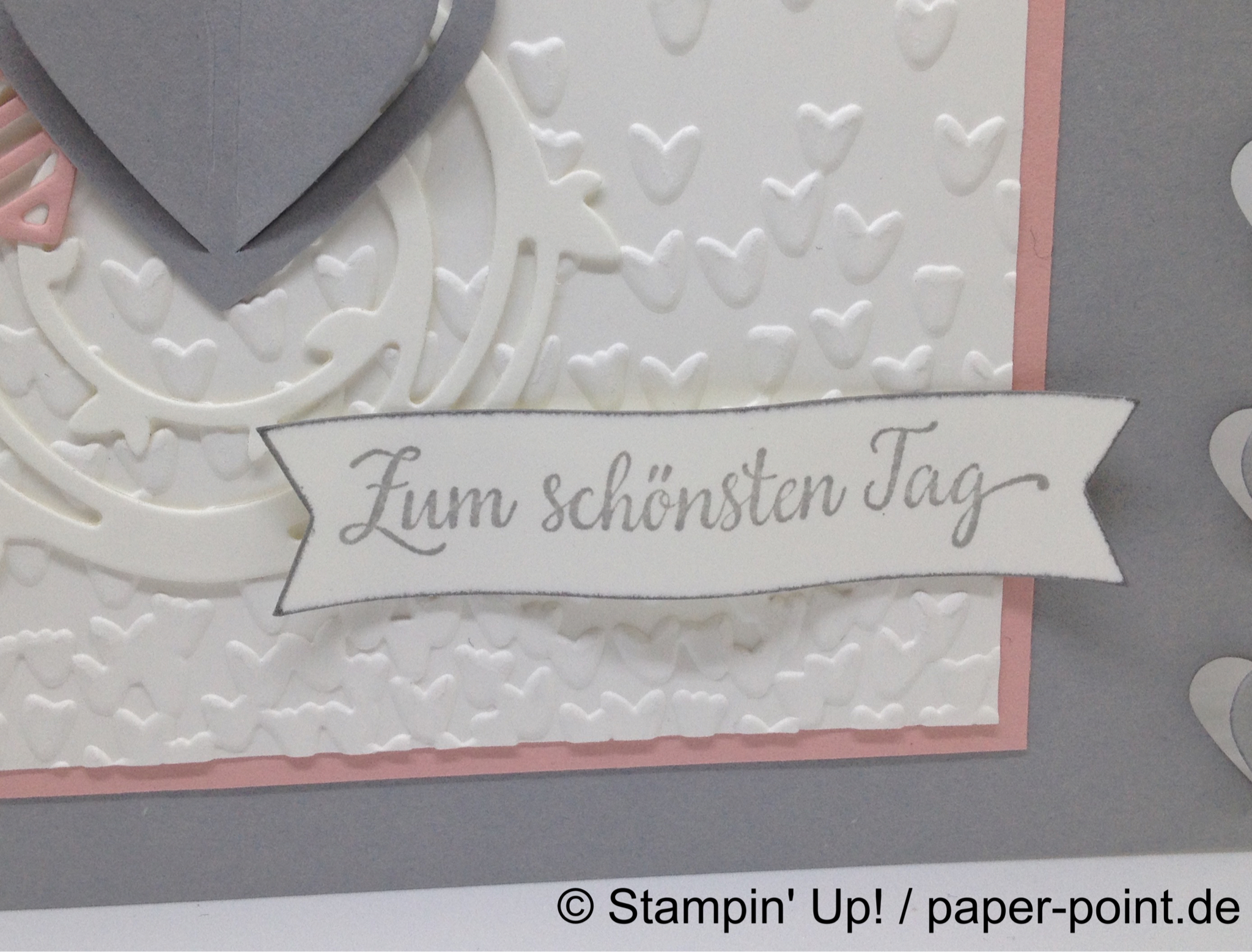 Der Hintergrund ist mit „Gorgeous Grunge“ gekleckst, der Farbkartonstreifen in Kirschblüte wurde mit „Blütenregen“ geprägt.