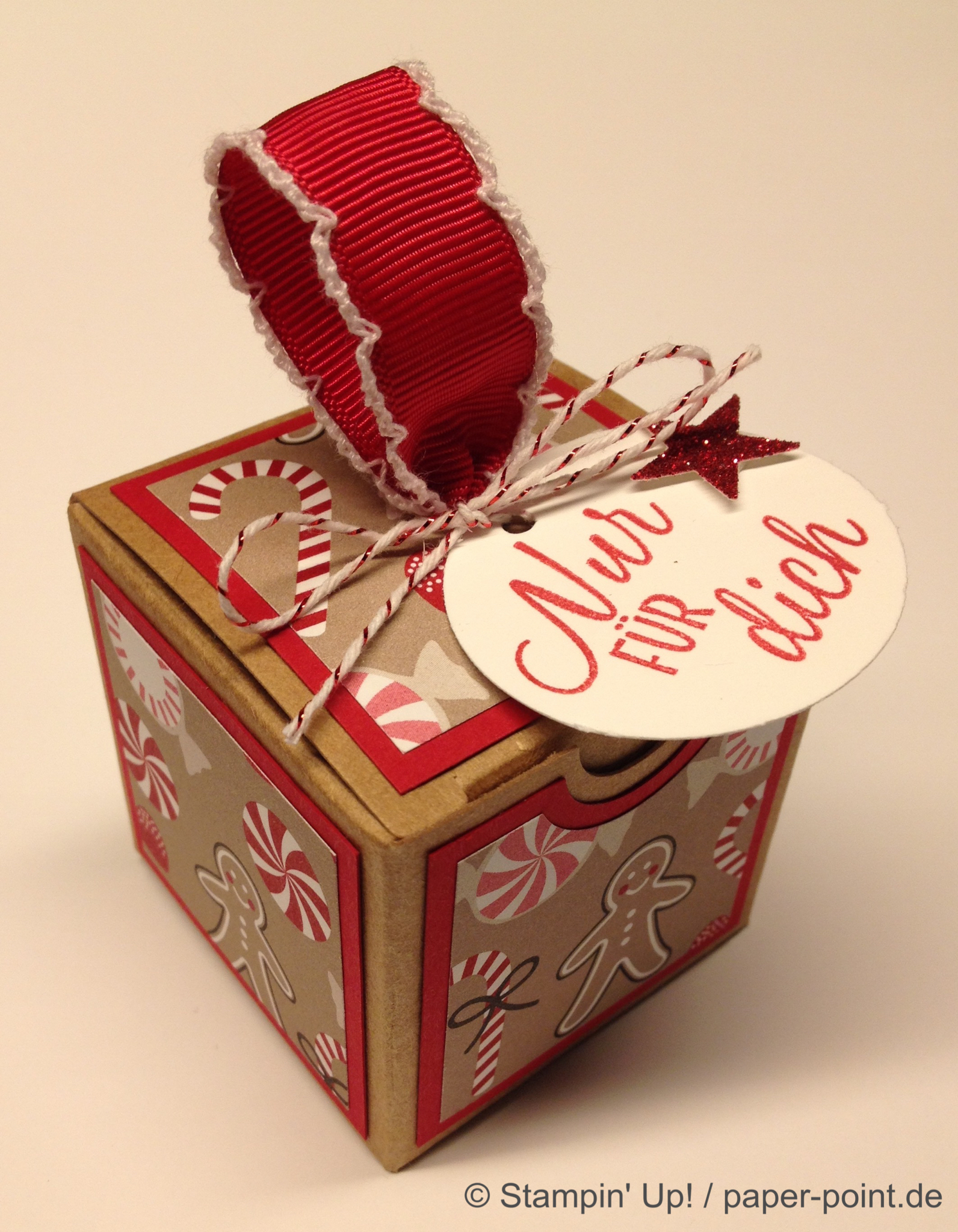 Mit dem Stempelset „Adventsgrün“ haben wir die Ilex-Girlande gestempelt. Die Schleife ist aus dem gleichen Set, ausgestanzt mit der Elementstanze „Adventsschmuck“.