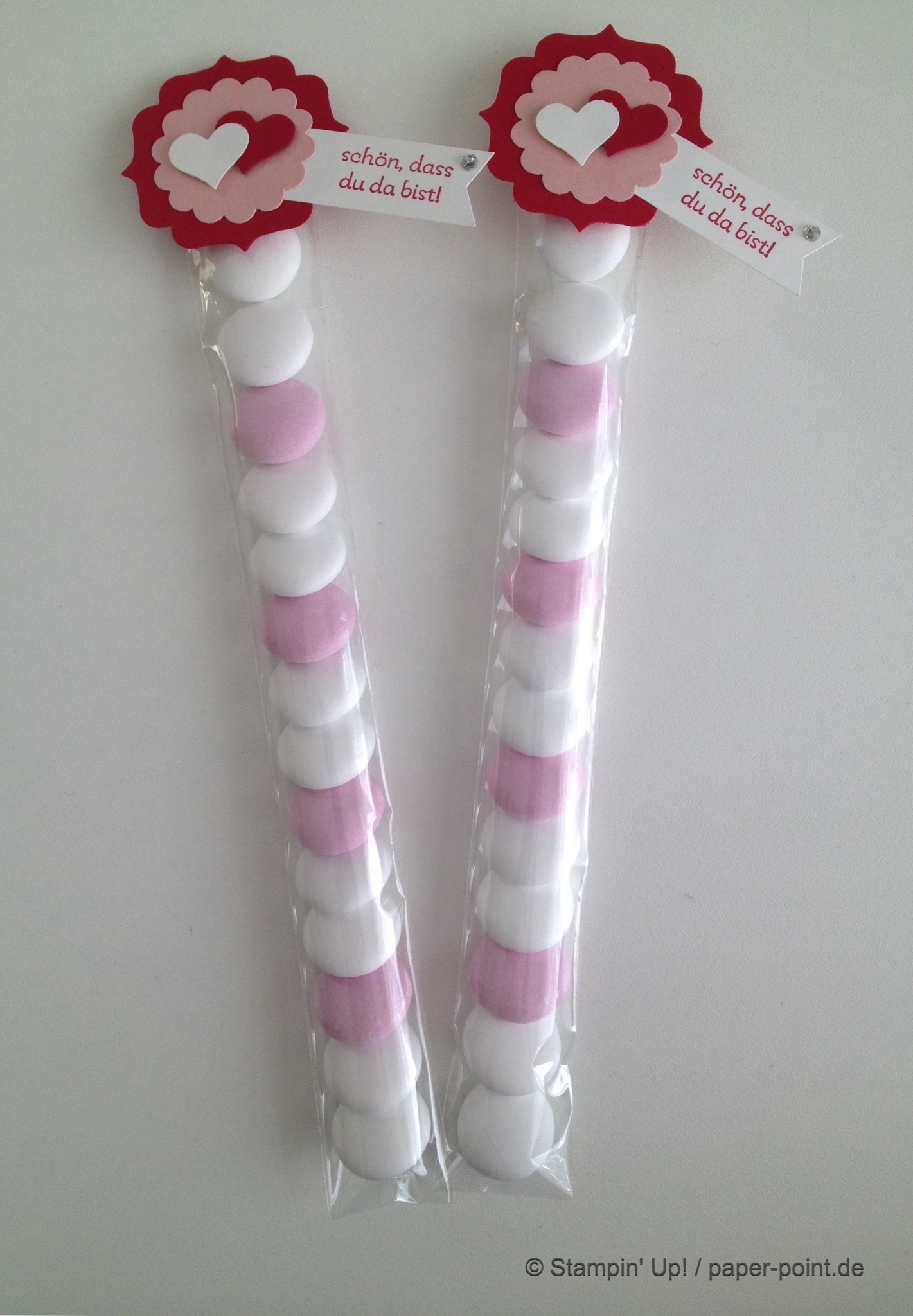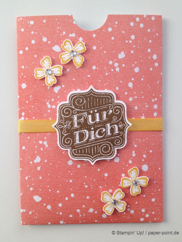 Die Vorderseite wurde mit verschiedenen Etiketten (z. B. Stempelset „Kein Geburtstag ohne Kuchen“, Abreißetikett, 7/8″ Wellenkreisstanze) sowie kleinen Blümchen und Herzchen (Stempelset „Pictogram Punches“, Itty Bitty Akzente) verziert. Es passen wunderbar kleine Schokoladentafeln hinein.