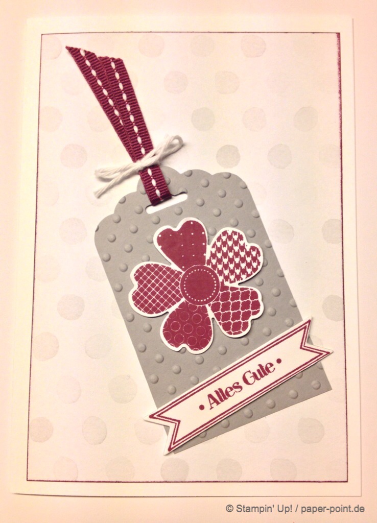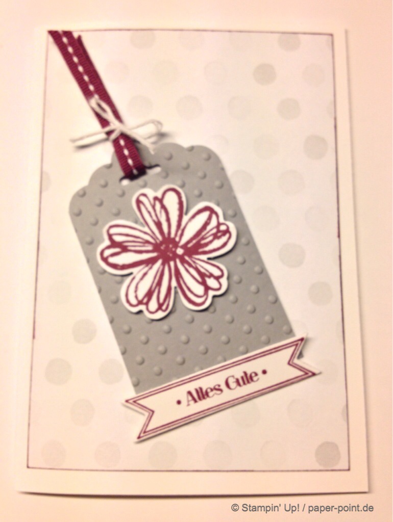 imageDie zweite Karte des Abends haben wir mit einem sogenannten Tag (Anhänger) dekoriert und mit einem Blümchen aus dem Flower Shop und einem kleinen Gruß versehen. Die Farbe Himbeerrot hebt sich schön vom Schiefergrau ab.