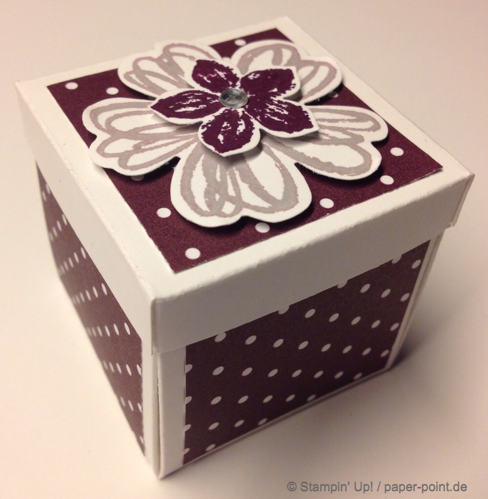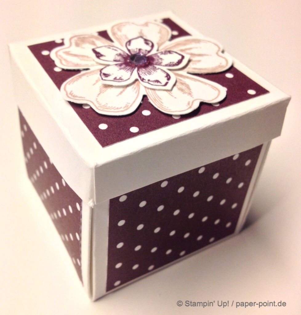 Zum Schluss haben wir noch eine kleine Box gebastelt, die nur aus zwei Quadraten erstellt wird. Das größere Quadrat wird zur Schachtel gefaltet, das kleinere Quadrat wird zum Deckel geklebt. Anschließend noch mit schönem Designerpapier (neue InColor Farben) und Blümchen verziert, so hat man schnell eine schöne Geschenkschachtel zur Hand.