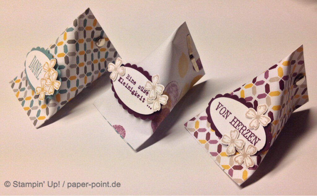 Schoki-VerpackungBegonnen haben wir mit einer ganz einfachen Faltung, die viele sicher noch aus Kindertagen kennen. Aber mit dem tollen Umschlagpapier in den neuen InColor-Farben aus dem neuen Jahreskatalog hat es gleich ein perfektes Muster bekommen. Mit ein paar Blüten in 3D-Optik übereinander geklebt und einem kleinen Spruch drauf kann man das Goodie perfekt z.B. auf die Teller einer Kaffeetafel legen.