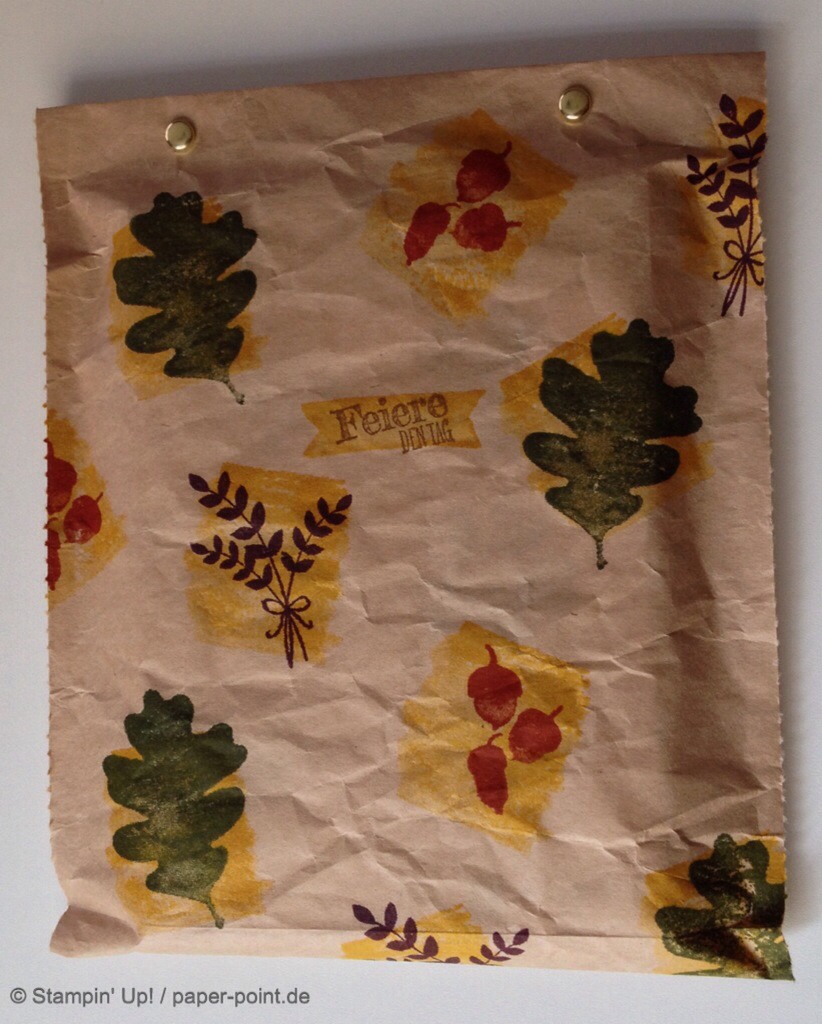 Aber ich will Euch ja noch den zweiten Teil des Geschenkes zeigen! Die Verpackung habe ich selbst gemacht. Die Tüte besteht aus dem Füllpapier, das man in fast allen Lieferungen von SU findet. Ich habe einen Streifen vorsichtig abgerissen, auf ca. 50 cm Breite zurecht geschnitten, in der Hälfte gefaltet und rechts und links zusammen geklebt. So ist die Tüte entstanden. Verschlossen habe ich sie mit zwei goldenen Musterbeutelklammern. Bestempelt habe ich sie in herbstlichen Farben (Currygelb, Waldmoos, Brombeermousse, Terrakotta und Wildleder) mit dem Stempelset „Herbstfarben“. Der Gruß „Feiere den Tag“ ist aus dem Stempelset „Spruch-reif“. Könnt Ihr Euch schon denken, was in der Tüte versteckt ist? (Leider ist das Bild etwas dunkel geraten – sorry!)