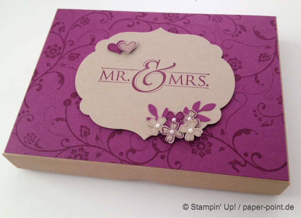 Mit Flowering Flourishes im Hintergrund und ein paar Glitzersteinchen auf den Blüten ist die Box nun vollendet und bereits beim Brautpaar angekommen.