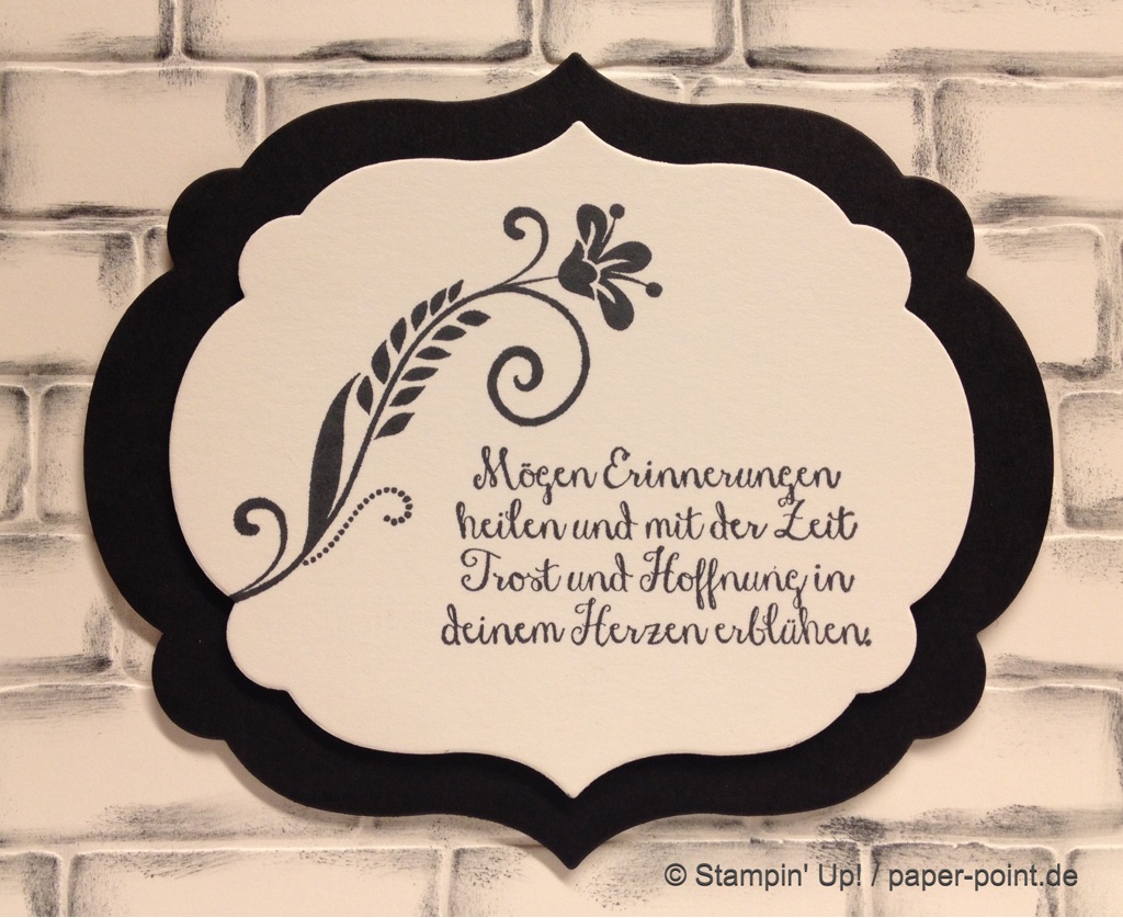 Die Blüte ist aus dem Stempelset „Flowering Flourishes“, der Text ist aus dem Set „Wo die Hoffnung blüht“. Das ganze habe ich dann mit den „Framelits Rahmen-Kollektion“ (leider nicht mehr erhältlich) und der Big Shot ausgestanzt, ebenso den schwarzen Farbkarton.
