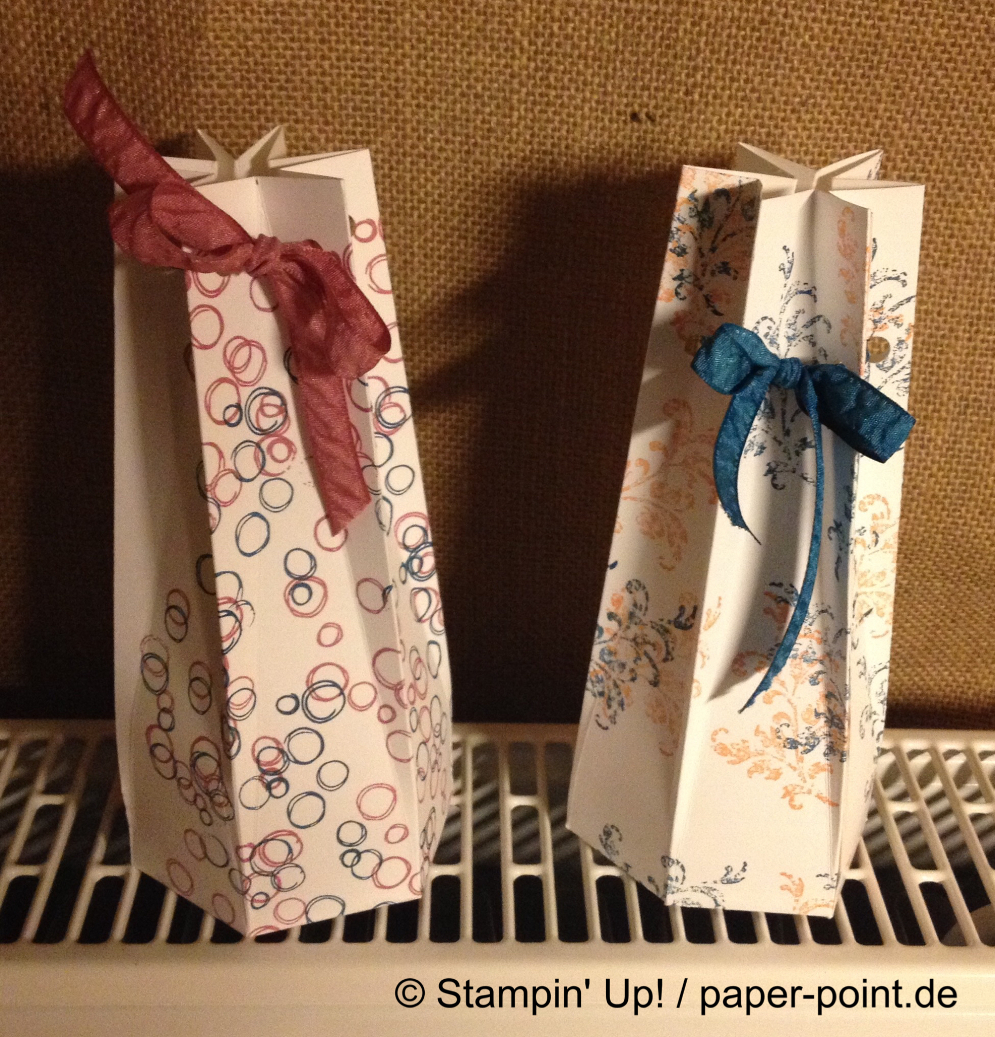 Wir haben flüsterweißen Karton 6″ x 6″ (15,2 x 15,2 cm) mit verschiedenen Mustern bestempelt, dann gefalzt, gestanzt und geschnitten und anschließend mit einer farblich passenden Schleife zugebunden.