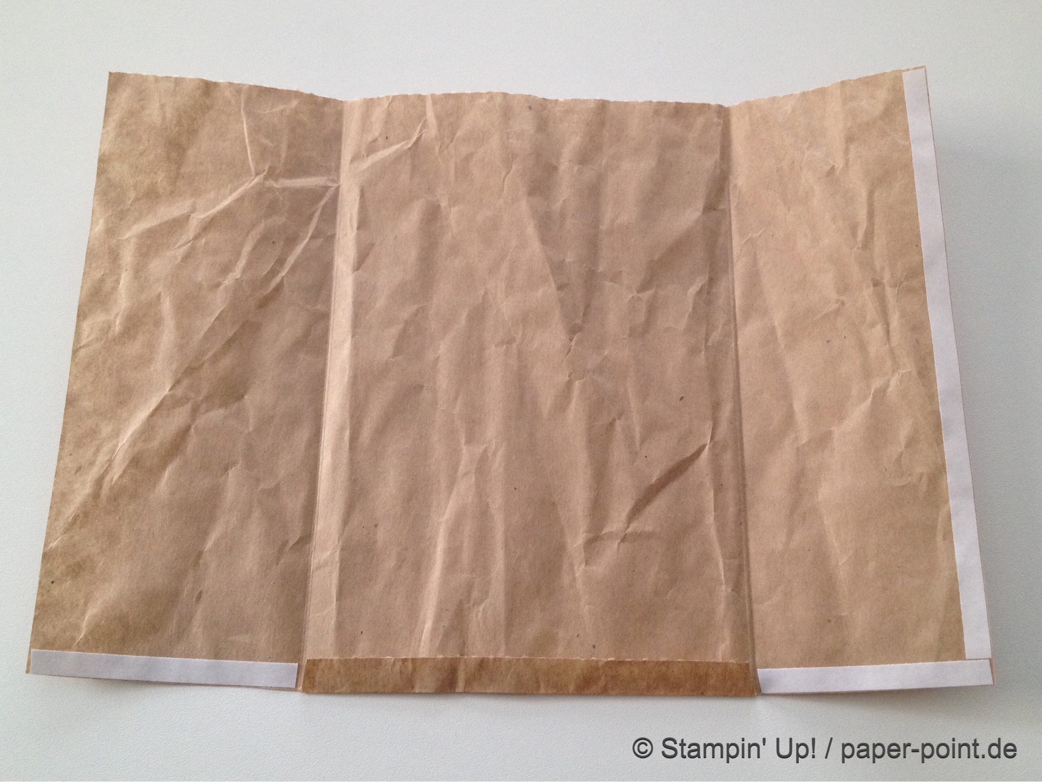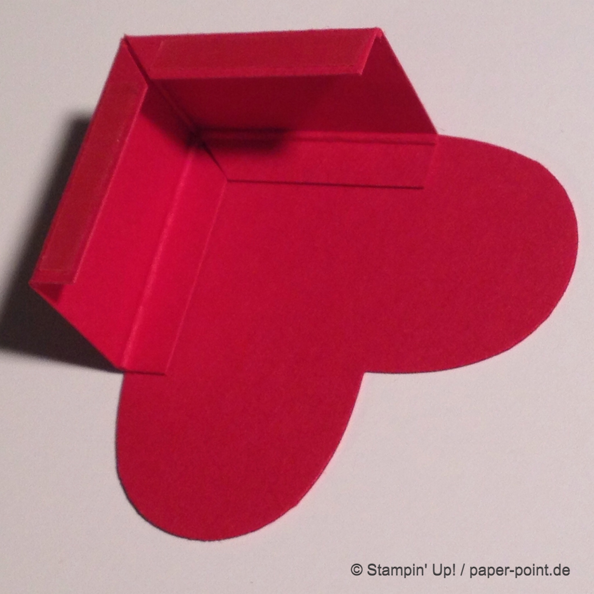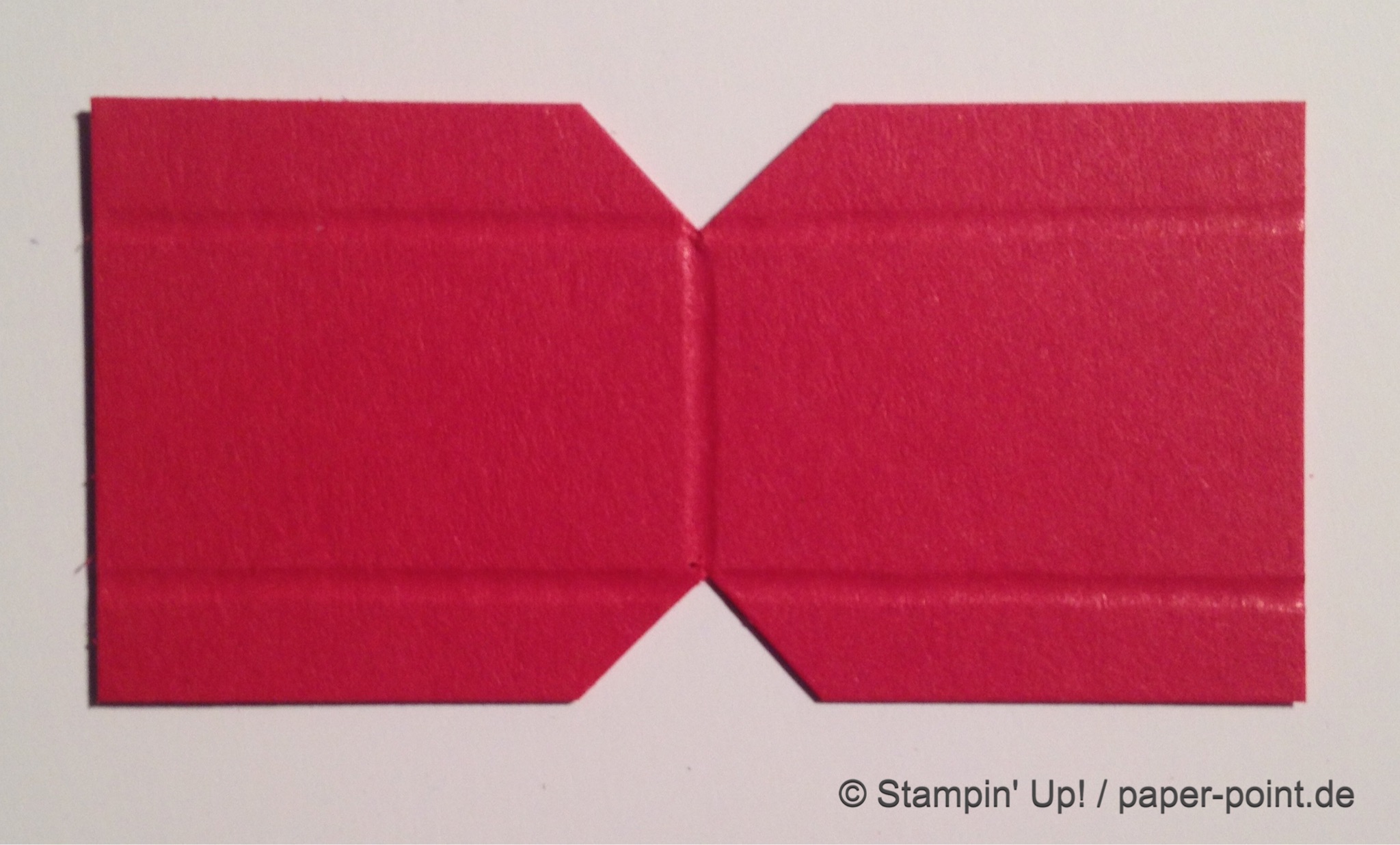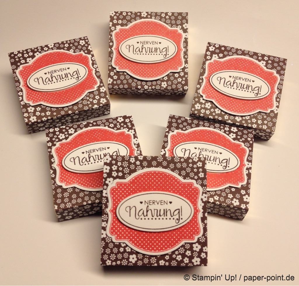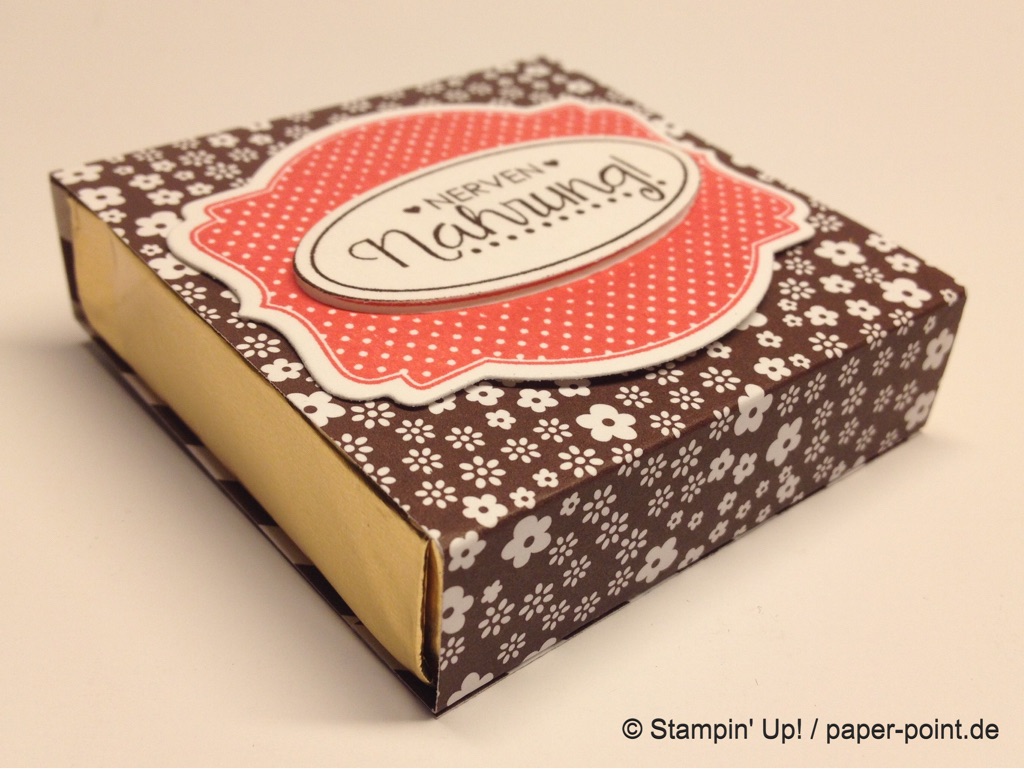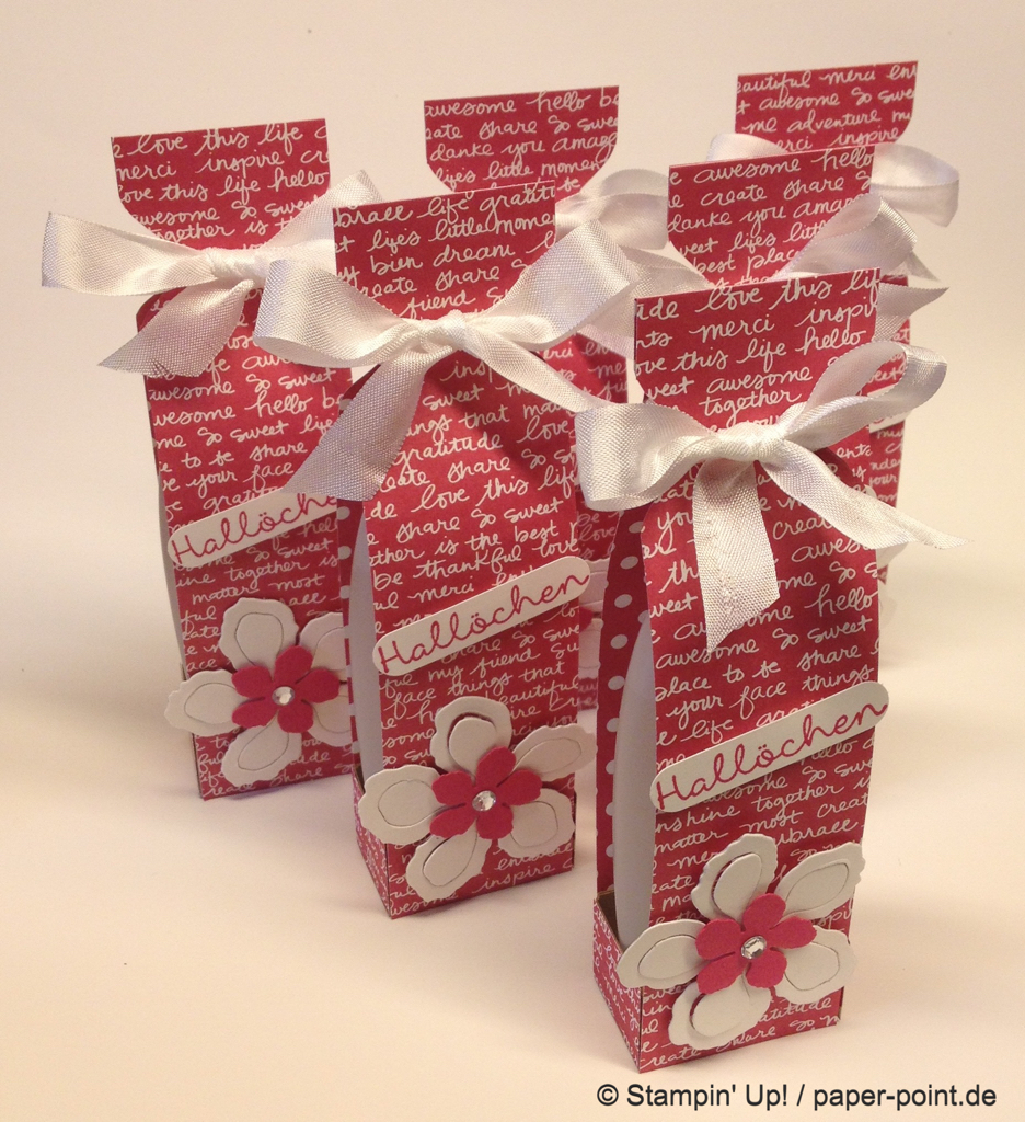 Aus dem Sandfarbenen Karton (JK Seite 175) habe ich eine kleine rechteckige Grundschachtel hergestellt (Grundfläche 2,5 x 4 cm, 2 cm hoch). Diese habe ich seitlich mit kleinen Stückchen Designerpapier (2,5 x 2 cm) beklebt. Die langen Teile sind 4 x 15 cm lang. Die Einkerbungen für die Schleife habe ich mit dem Envelope Punch Board (Umschlagbrett) gemacht. Den Streifen habe ich mit der langen Seite angelegt und bei 1″ gestanzt. Dann auf die Rückseite gedreht und noch mal gestanzt. Beide Teile vorne und hinten angeklebt, oben zusammengeklebt und eine weiße Schleife darum gebunden.