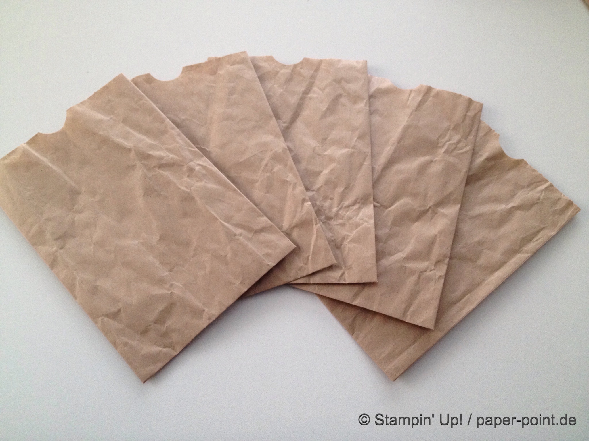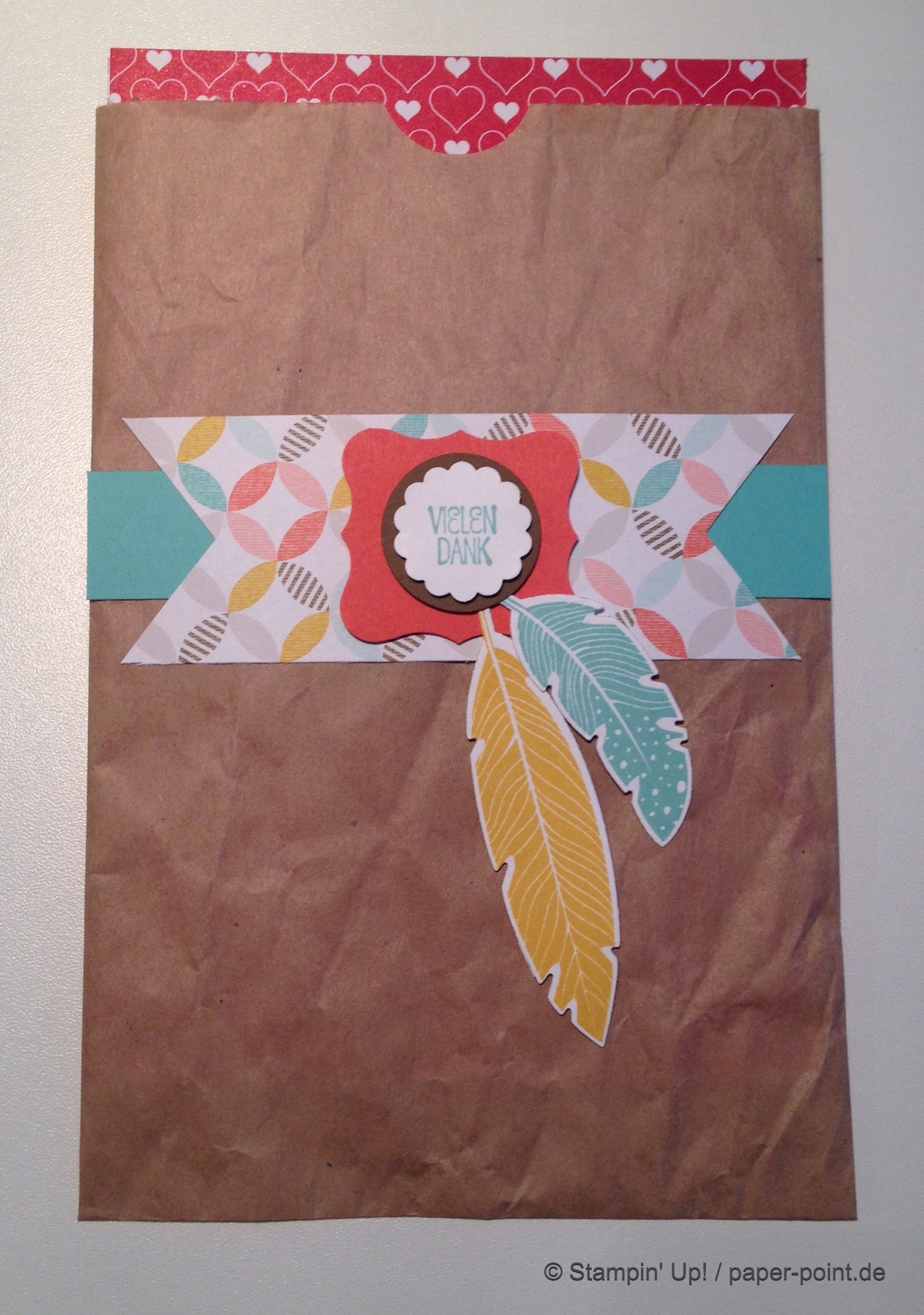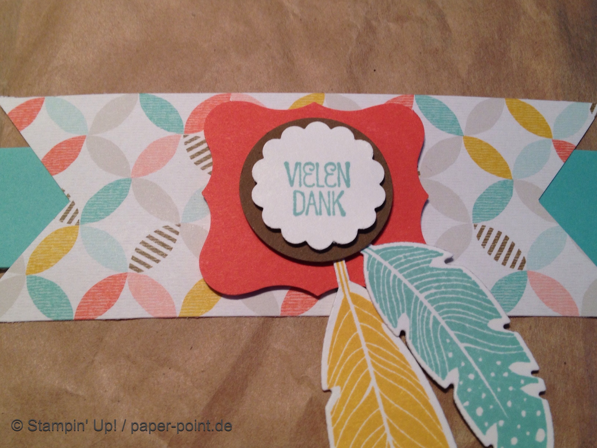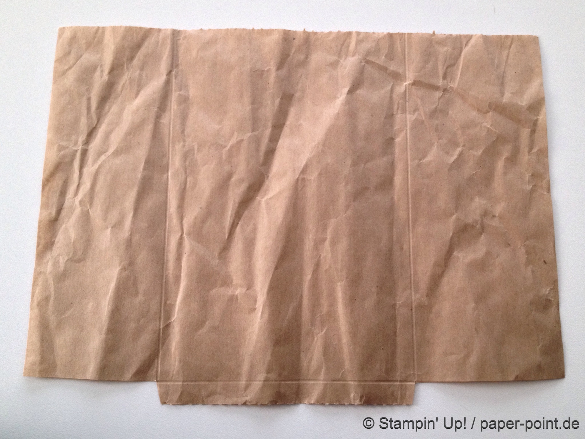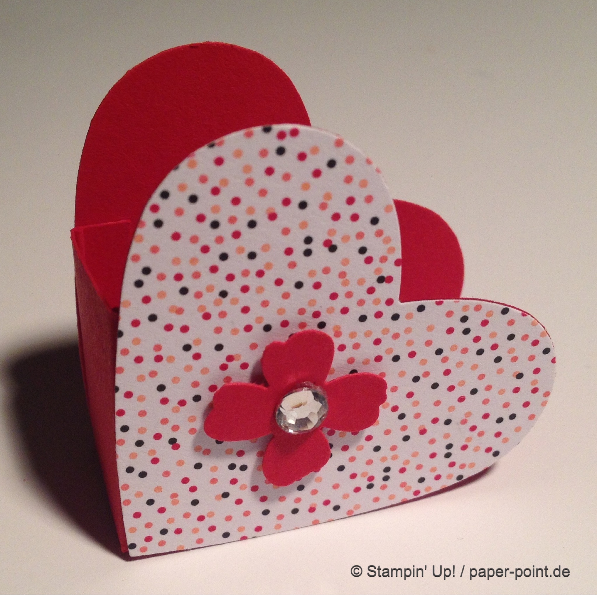 Aus dem Sandfarbenen Karton (JK Seite 175) habe ich eine kleine rechteckige Grundschachtel hergestellt (Grundfläche 2,5 x 4 cm, 2 cm hoch). Diese habe ich seitlich mit kleinen Stückchen Designerpapier (2,5 x 2 cm) beklebt. Die langen Teile sind 4 x 15 cm lang. Die Einkerbungen für die Schleife habe ich mit dem Envelope Punch Board (Umschlagbrett) gemacht. Den Streifen habe ich mit der langen Seite angelegt und bei 1″ gestanzt. Dann auf die Rückseite gedreht und noch mal gestanzt. Beide Teile vorne und hinten angeklebt, oben zusammengeklebt und eine weiße Schleife darum gebunden.