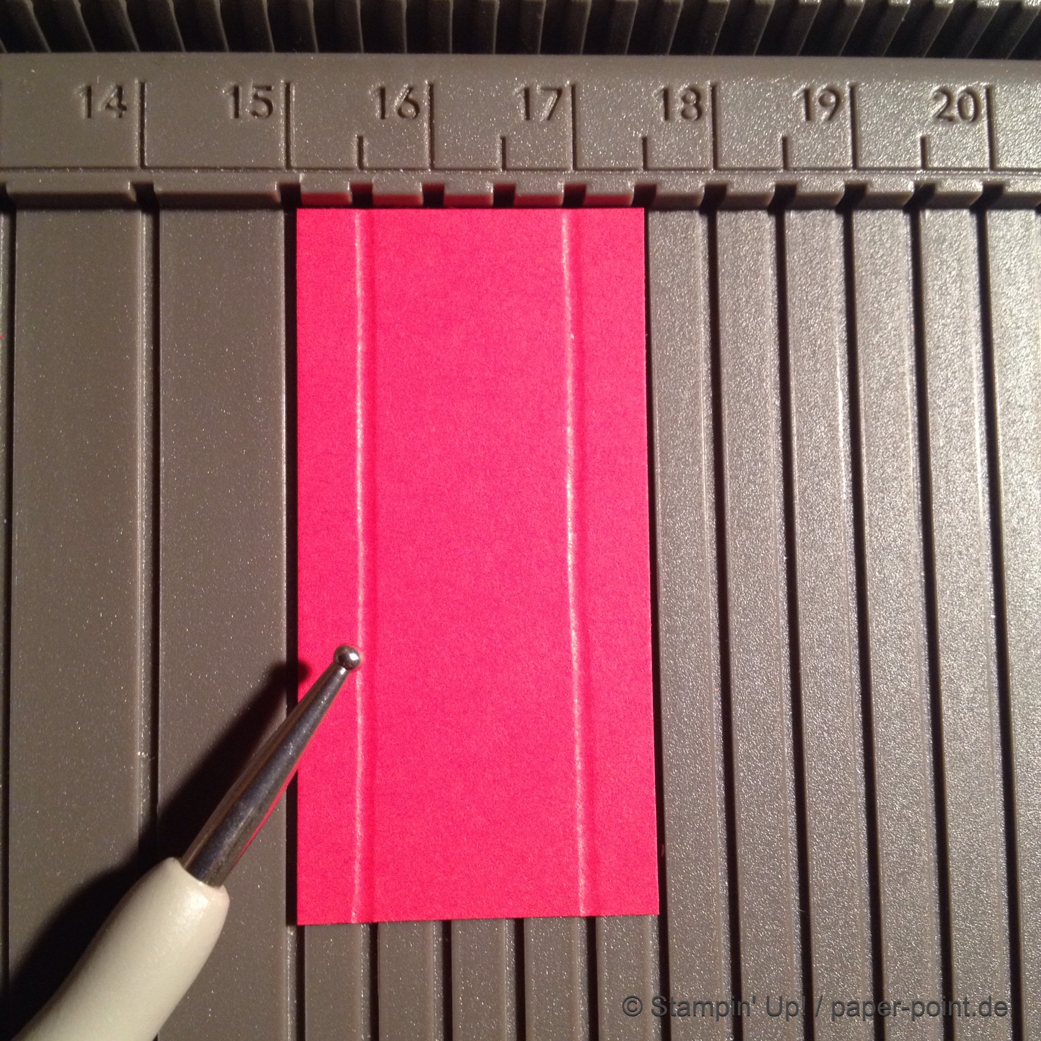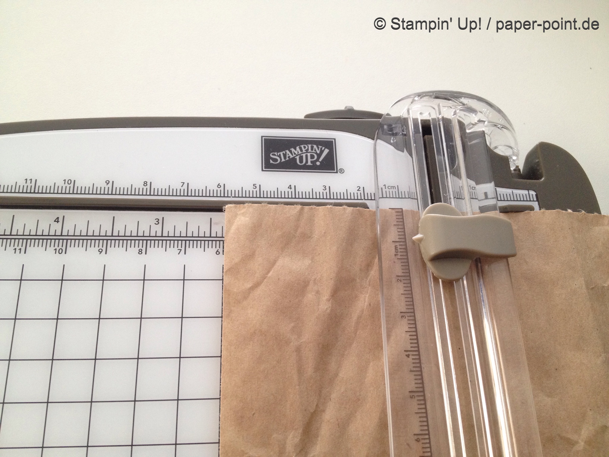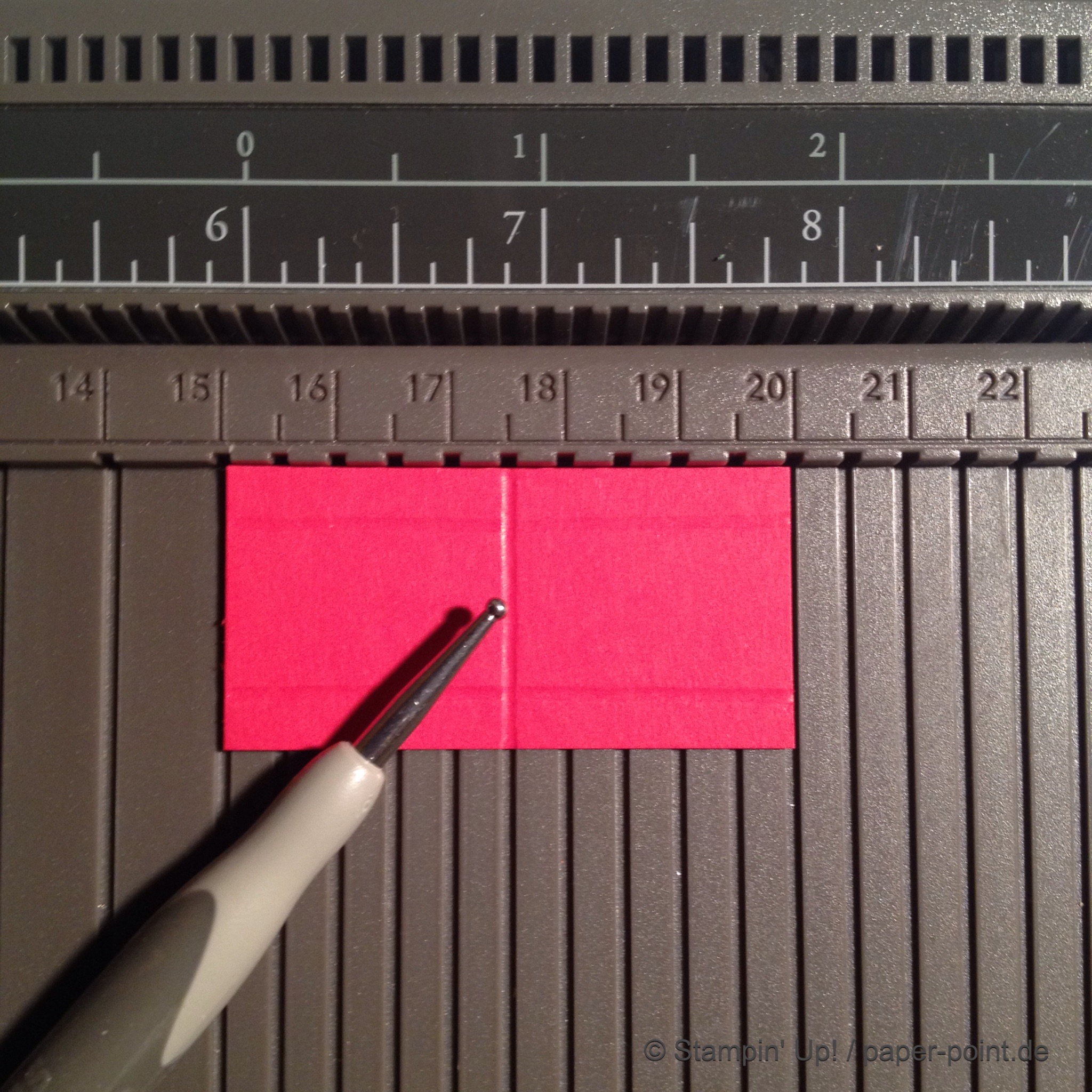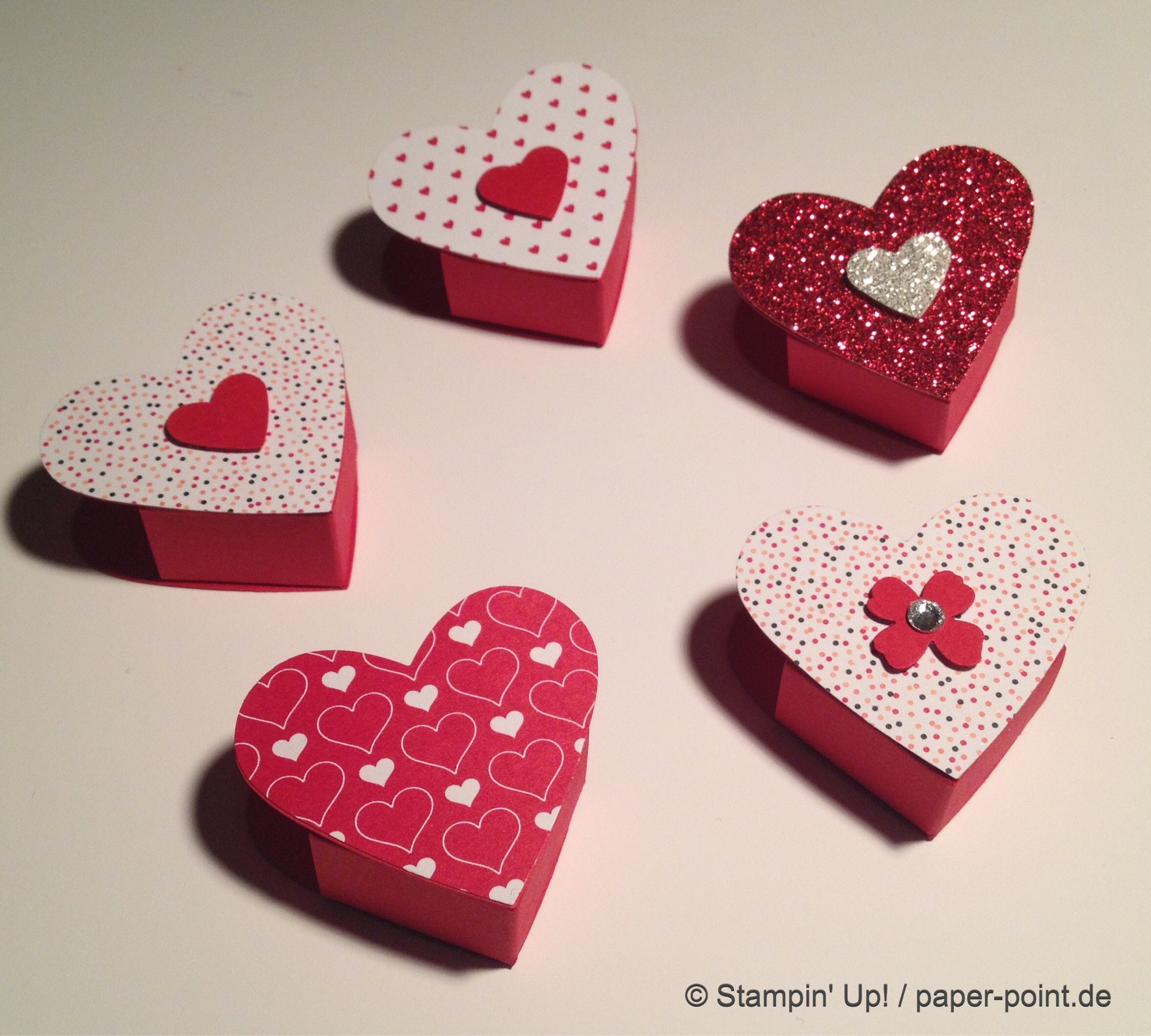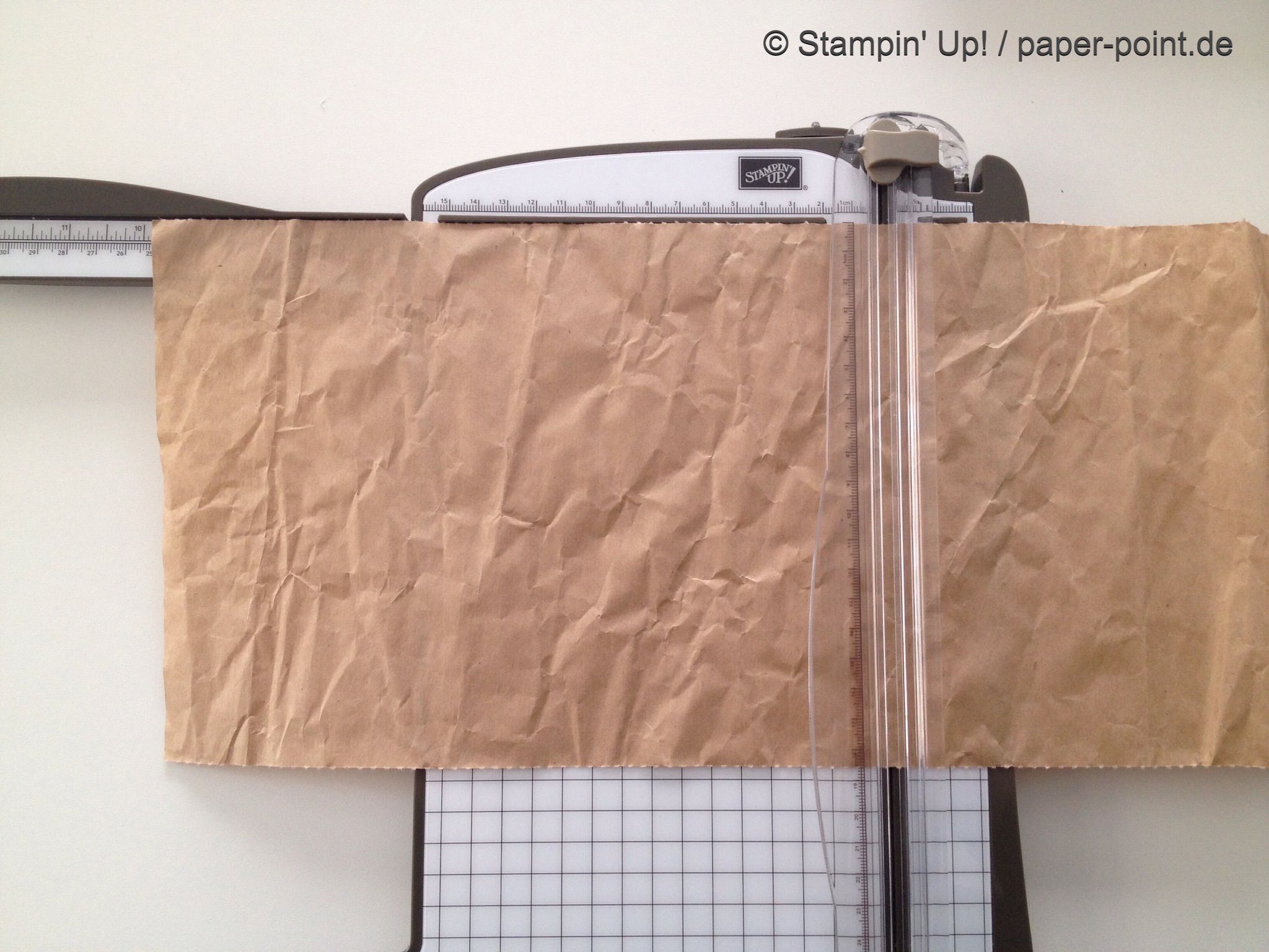 Aus dem Sandfarbenen Karton (JK Seite 175) habe ich eine kleine rechteckige Grundschachtel hergestellt (Grundfläche 2,5 x 4 cm, 2 cm hoch). Diese habe ich seitlich mit kleinen Stückchen Designerpapier (2,5 x 2 cm) beklebt. Die langen Teile sind 4 x 15 cm lang. Die Einkerbungen für die Schleife habe ich mit dem Envelope Punch Board (Umschlagbrett) gemacht. Den Streifen habe ich mit der langen Seite angelegt und bei 1″ gestanzt. Dann auf die Rückseite gedreht und noch mal gestanzt. Beide Teile vorne und hinten angeklebt, oben zusammengeklebt und eine weiße Schleife darum gebunden.
