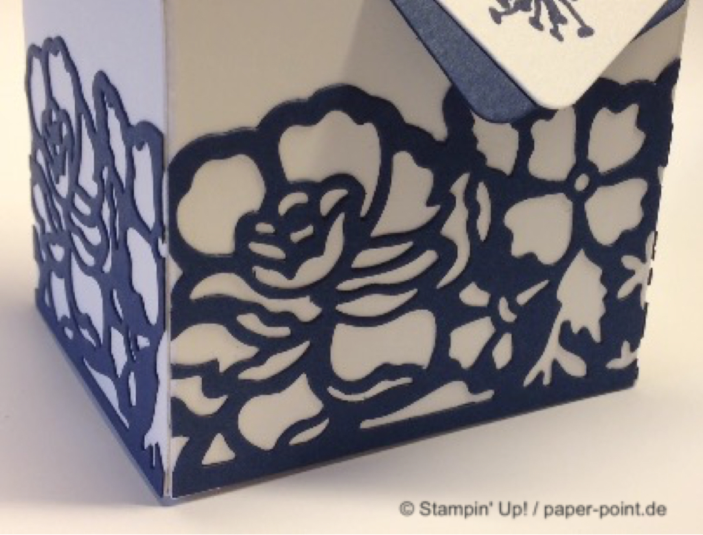 Aus den Framelits „Pflanzen-Potpourri“ habe ich eine große und eine kleine Blüte ausgestanzt und damit die Verpackung dekoriert. Der Glitzerstein in der Mitte durfte nicht fehlen!