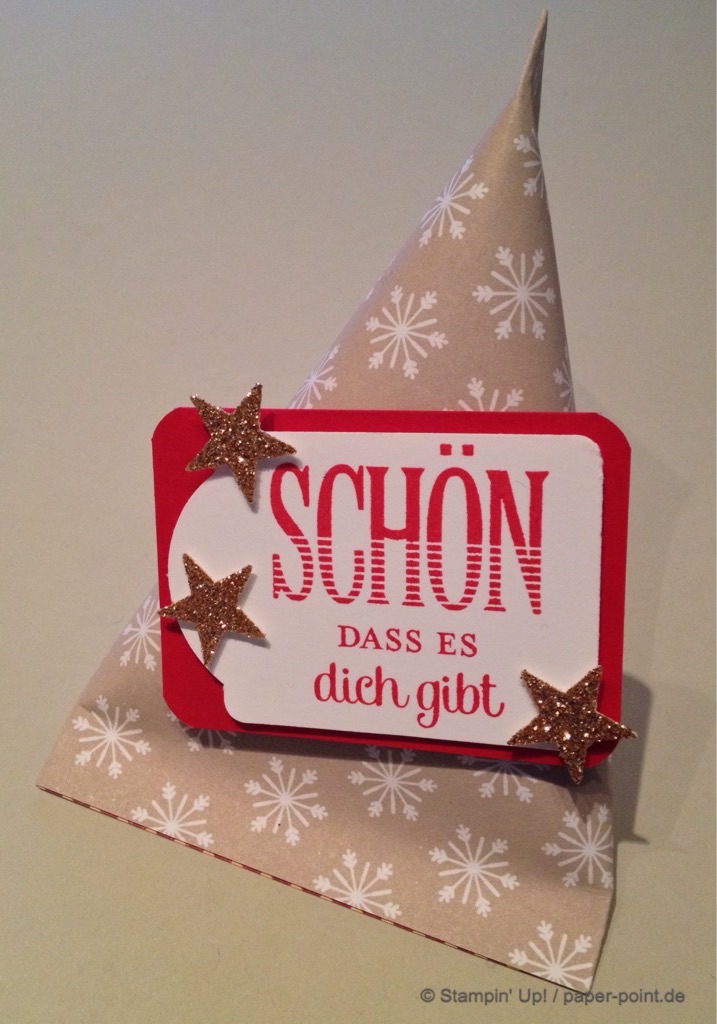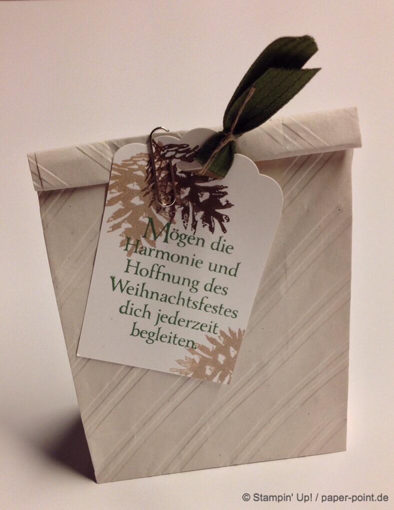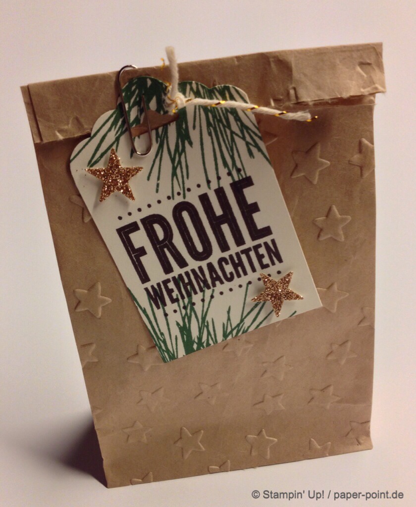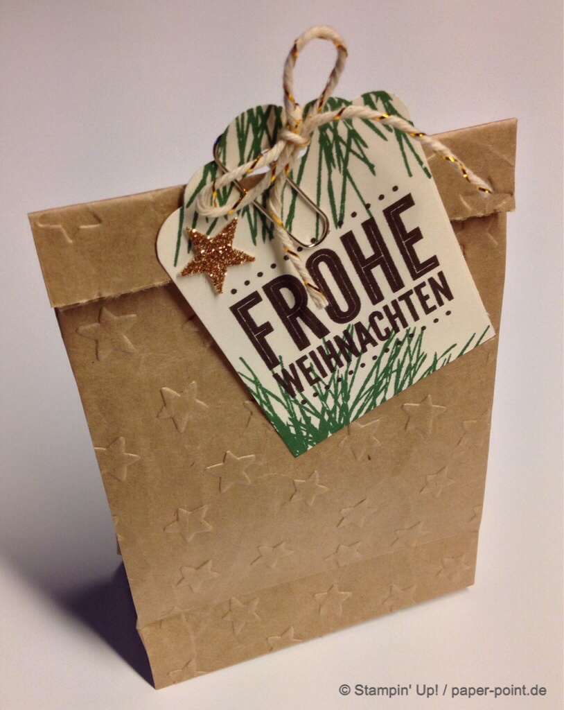 Wir haben mit den Thinlits Formen Mini-Leckereientüte die Teile für kleine Tüten ausgestanzt, mit einem Prägefolder geprägt und mit den im Set enthaltenen Sterne und Herzen-Formen dekoriert. Nach Wunsch konnte jeder noch ein Gruß-Schildchen anbringen.