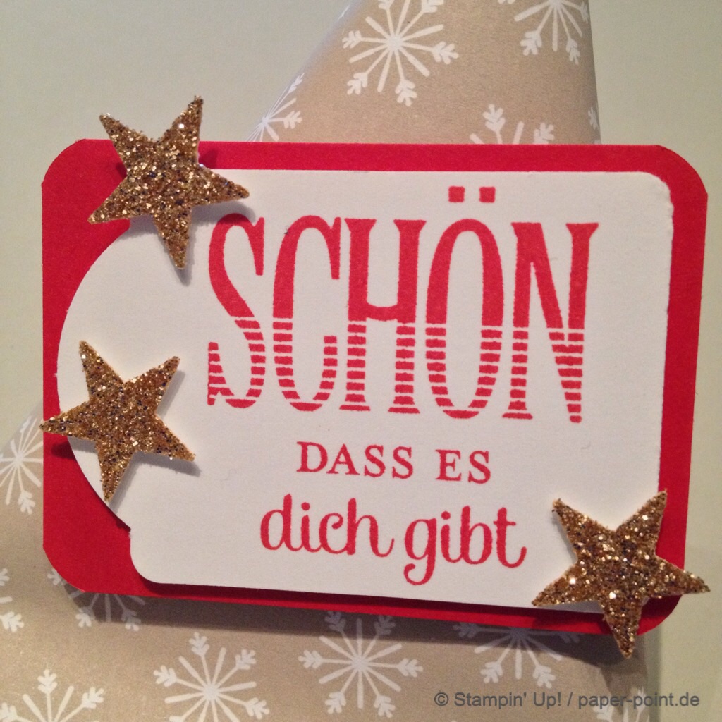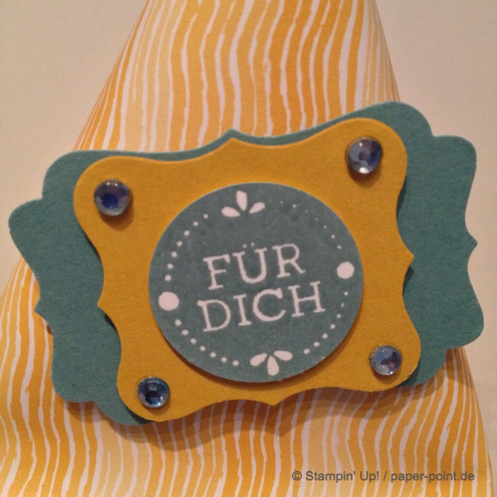 Ein Etikett aus dem Stempelset „Für Dich“ und drei kleine Blümchen, natürlich mit Glitzersteinchen, komplettierten unsere Deko.