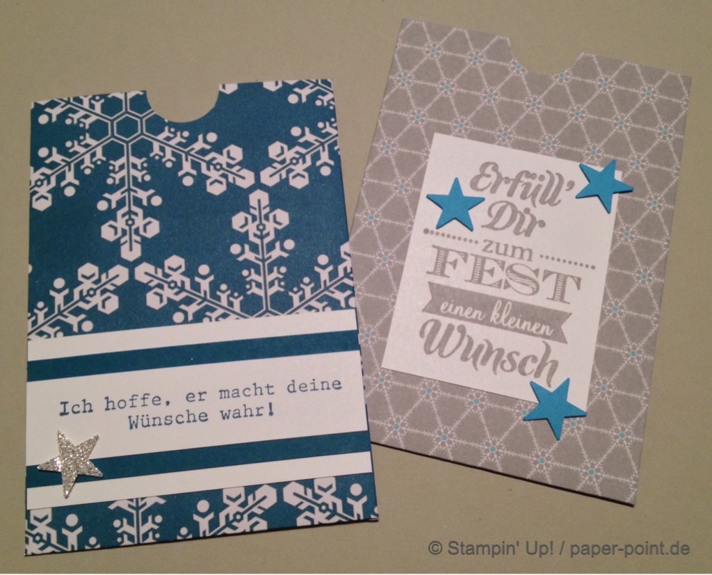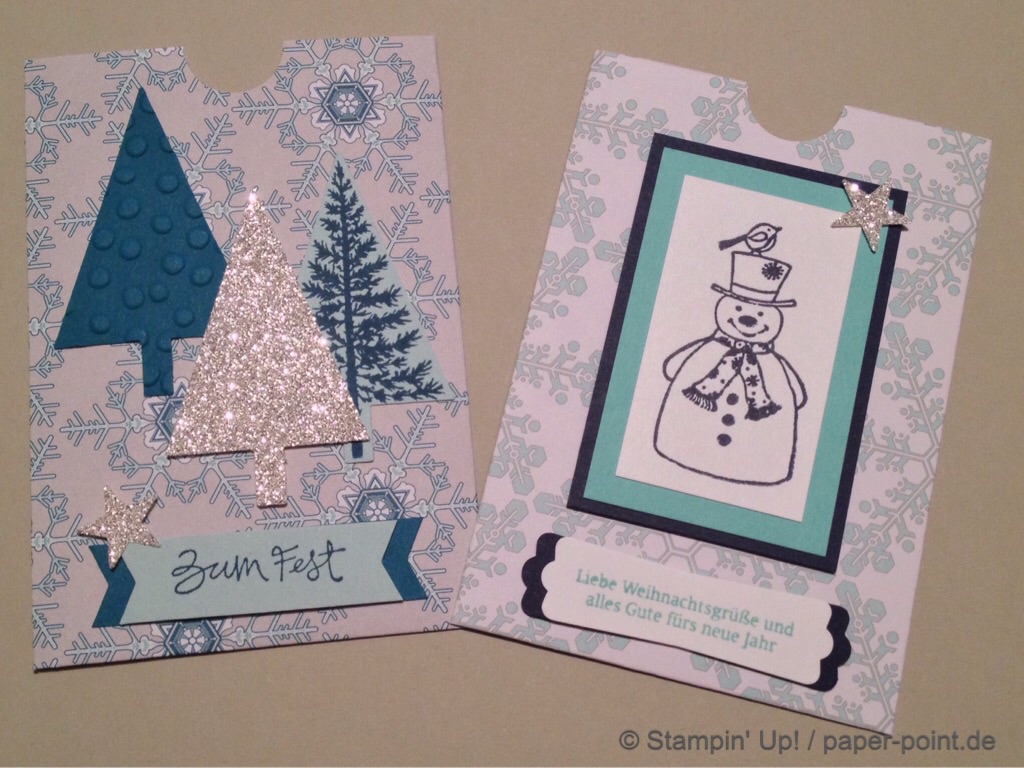 Bei diesen Gutscheinhüllen habe ich viele tolle Blautöne verwendet und mit silbernem Glitzerpapier verziert: