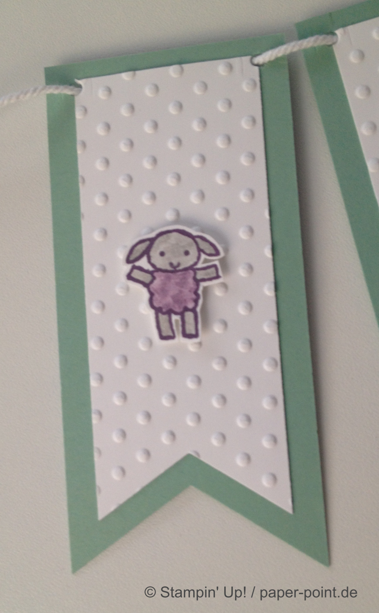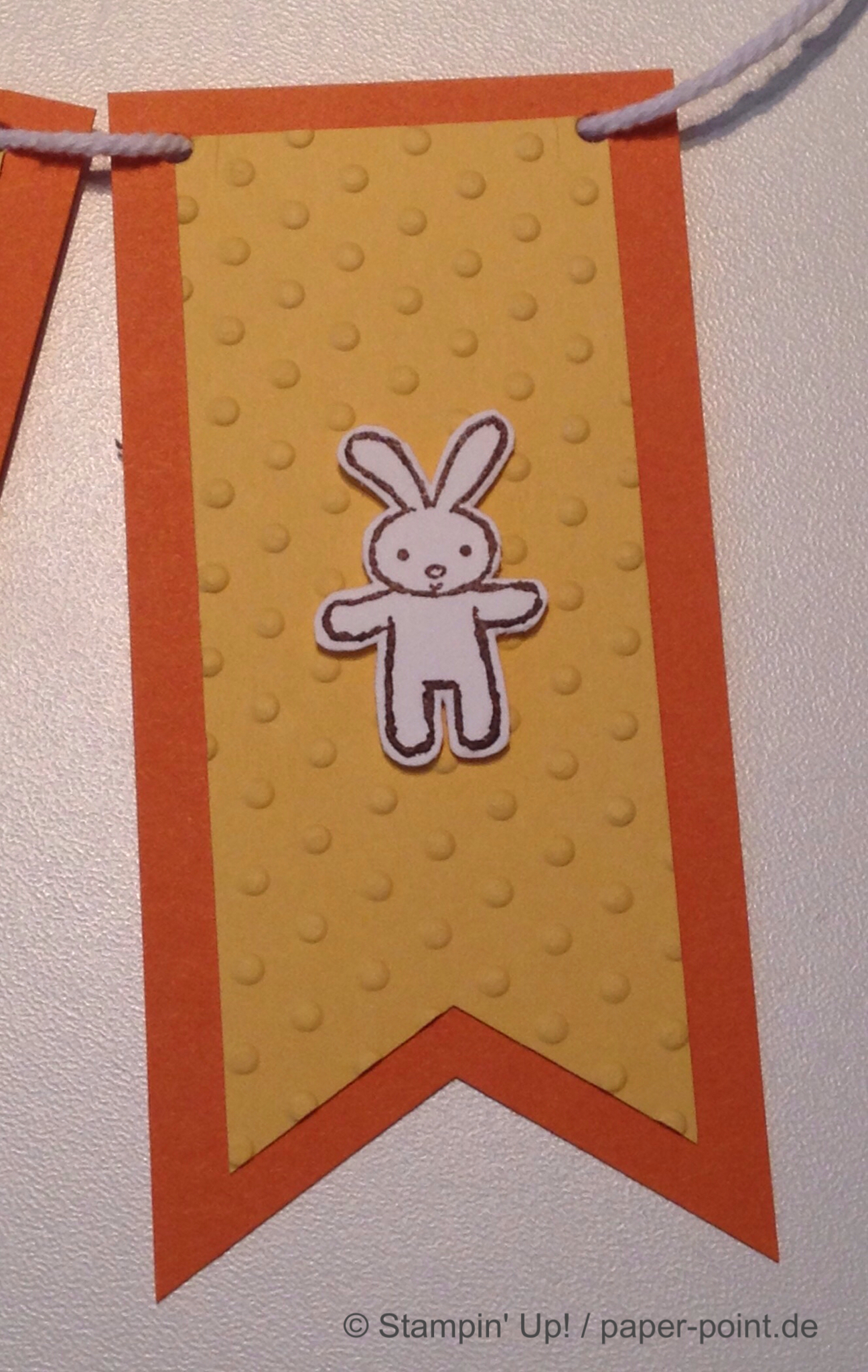 Ich habe 6 Fähnchen, je zwei in den Farben Hummelgelb, Ziegelrot und Bermudablau mit der 3-fach Fähnchenstanze (JK 2020/2021) ausgestanzt. Sie haben eine Größe von 10,5 x 5 cm. Am oberen Ende sind sie mit zwei Löchern versehen. Da habe ich das Band durchgefädelt. Das Designerpapier benötigt man ebenfalls 6x mit der Größe 9,5 x 3,8 cm, diese werden auch zu Fähnchen gestanzt und aufgeklebt.