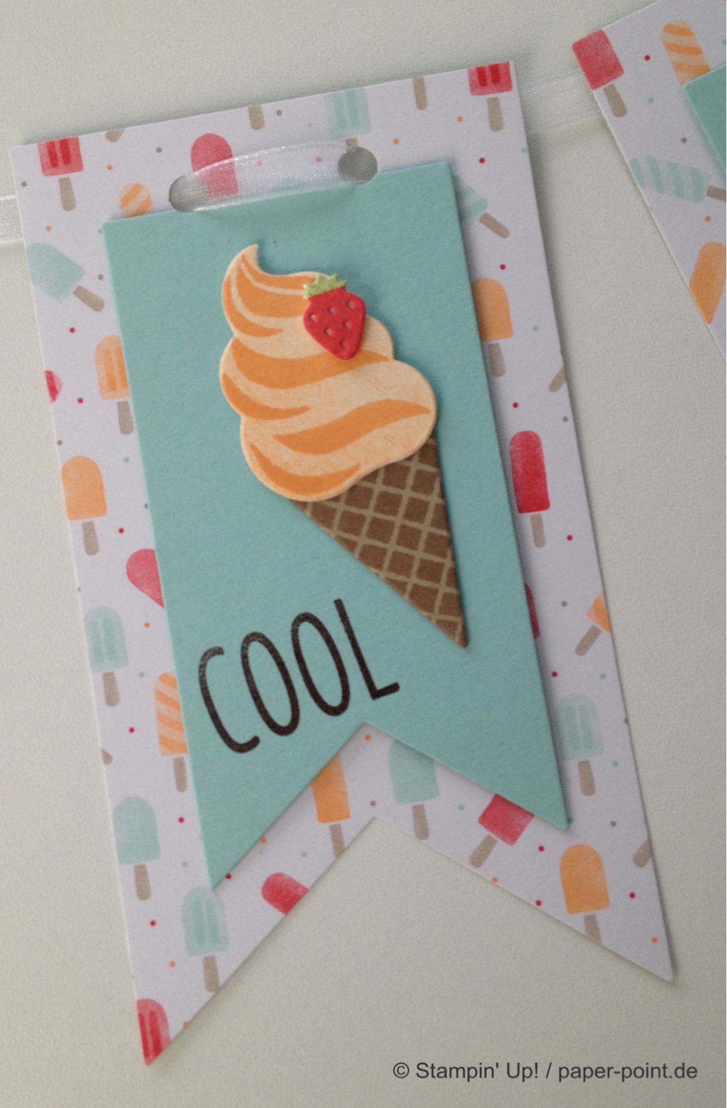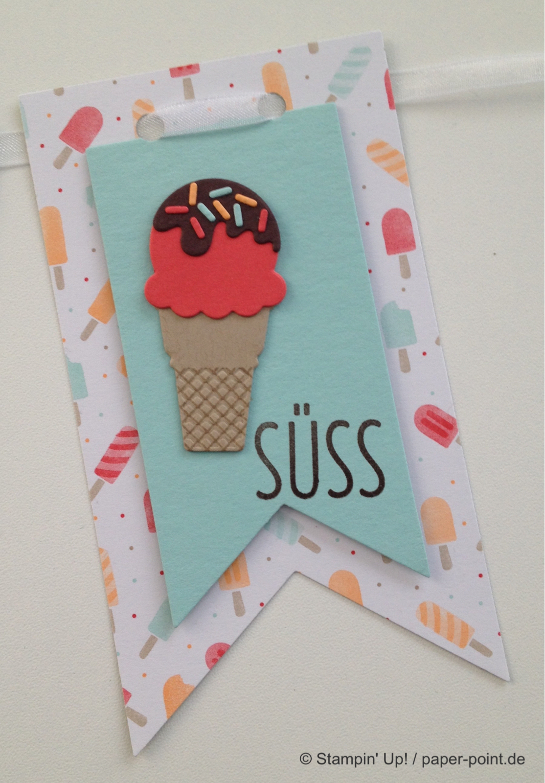 Jedes Fähnchen bekommt einen Stiel in Zimtbraun sowie das leckere Eis dazu. Für die hell-dunkel-Nuancen habe ich jeweils den 1. bzw. 2. Abdruck beim Stempeln verwendet. Diese Teile habe ich anschließend alle ausgeschnitten und mit Klebepads aufgeklebt..