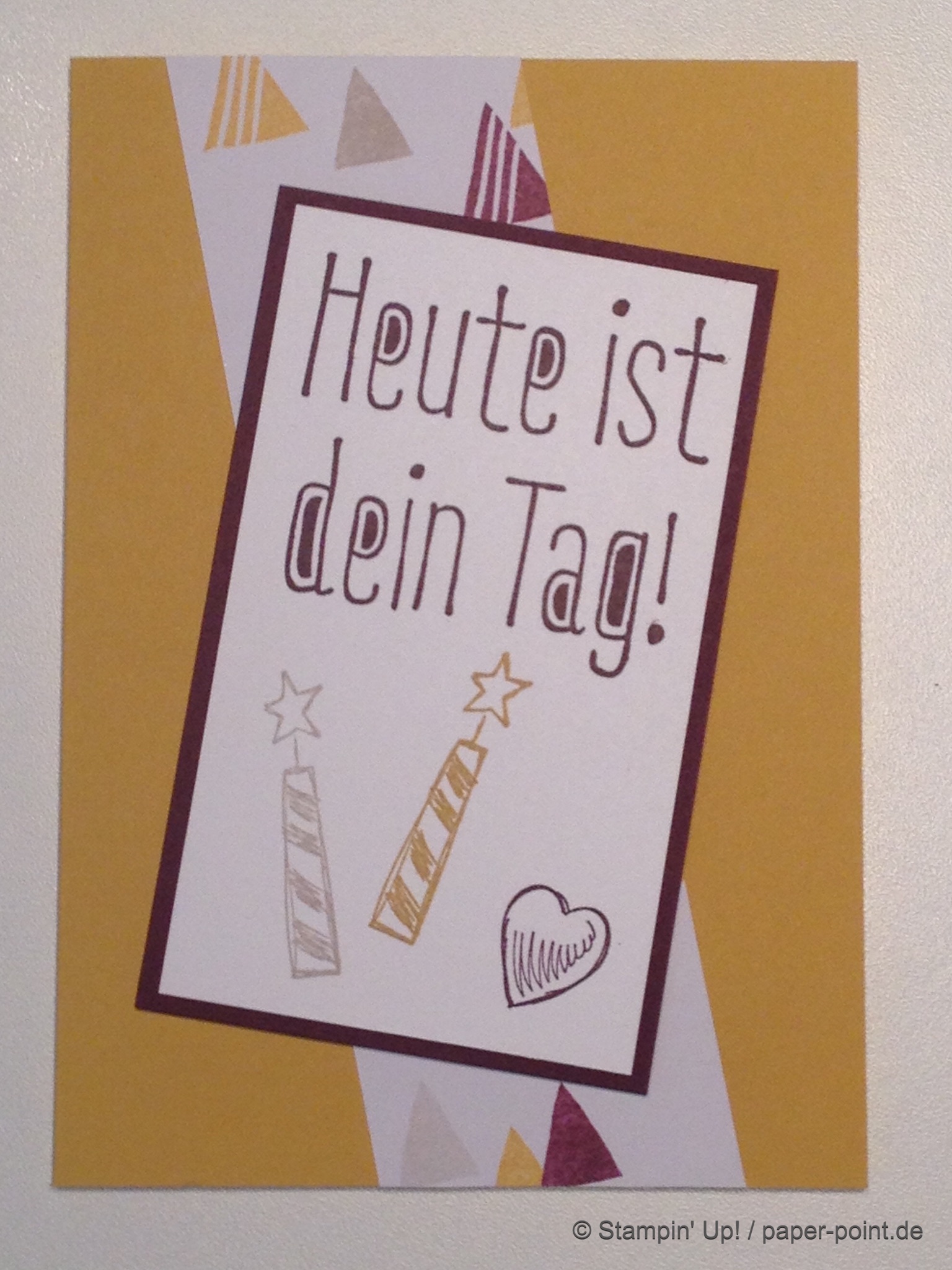 Wir haben die Karten kunterbunt bestempelt (Stempelsets: „Großes Glück“ / „Geburtstagsgrüße für alle“) und anschließend mit der Prägeform „Ziegel“ zu einer Mauer geprägt.
