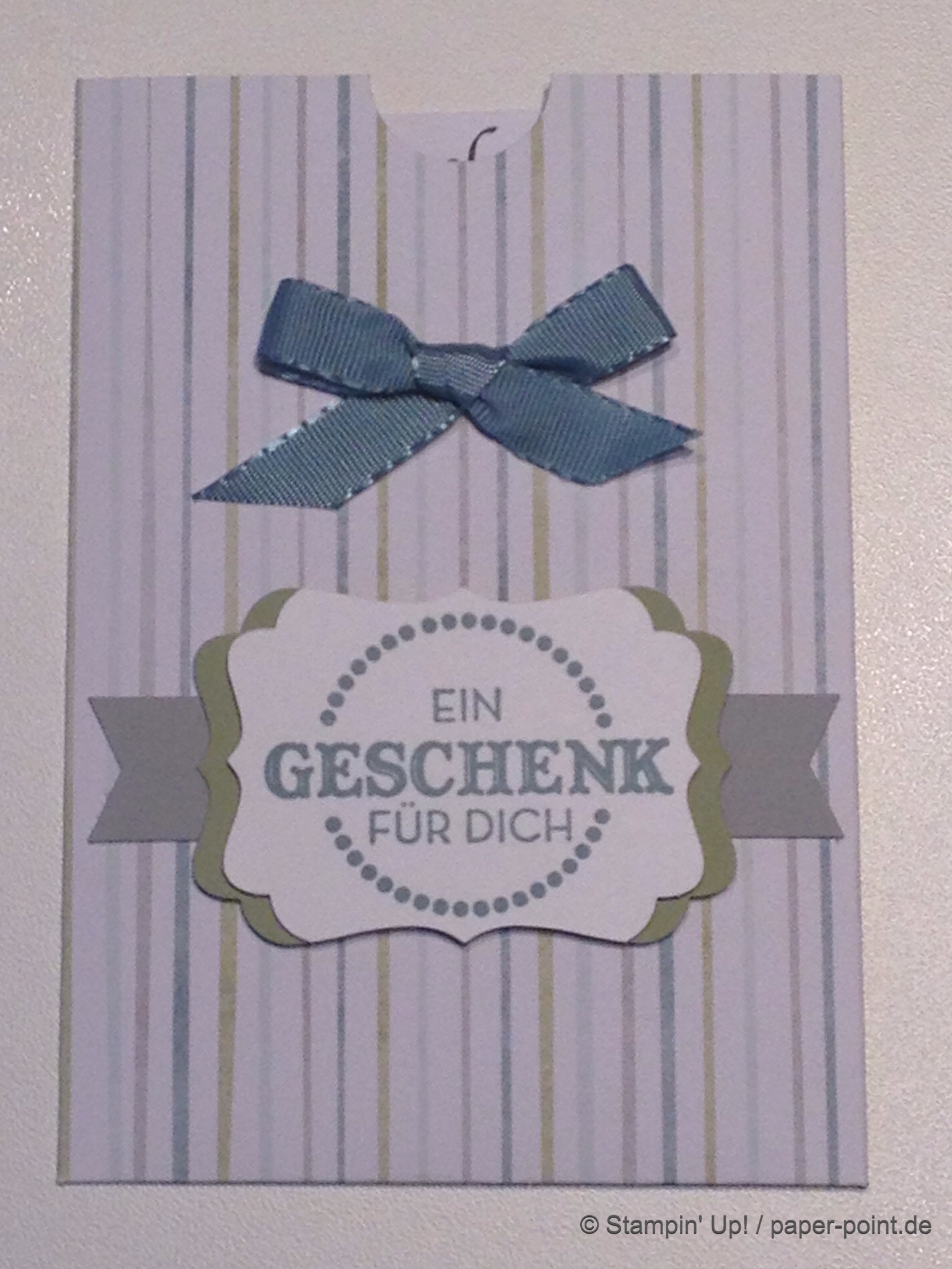 Ein Gruß oder Glückwunsch, z.B. aus dem Stempelset „Landlust“, haben wir mit der Stanze „Abreißetikett“ ausgestanzt und auf die Karte geklebt.