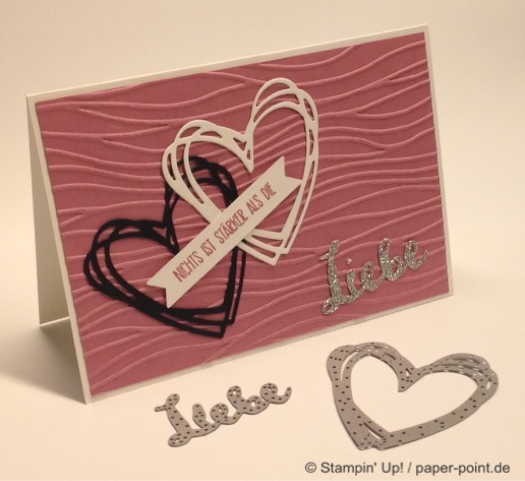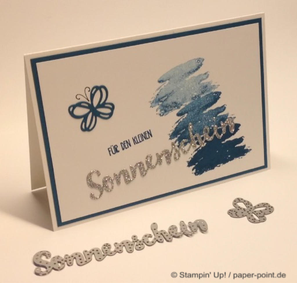 Und während die beiden Erwachsenen dann noch die Glückwunschkarte mit dem Stempelset und den gleichnamigen Thinlits „Grüße voller Sonnenschein“ in ihren Lieblingsfarben bearbeitet haben, hat die Enkelin die Karte mit der Arche Noah aus dem Set „Perfectly Paired“ ganz alleine gestaltet. Den Hintergrund hat sie mit der BigShot in „Meereswellen“ geprägt. Das passt sowohl zu den Wolken als auch zu den Fischen (die beide auch im Set enthalten sind):