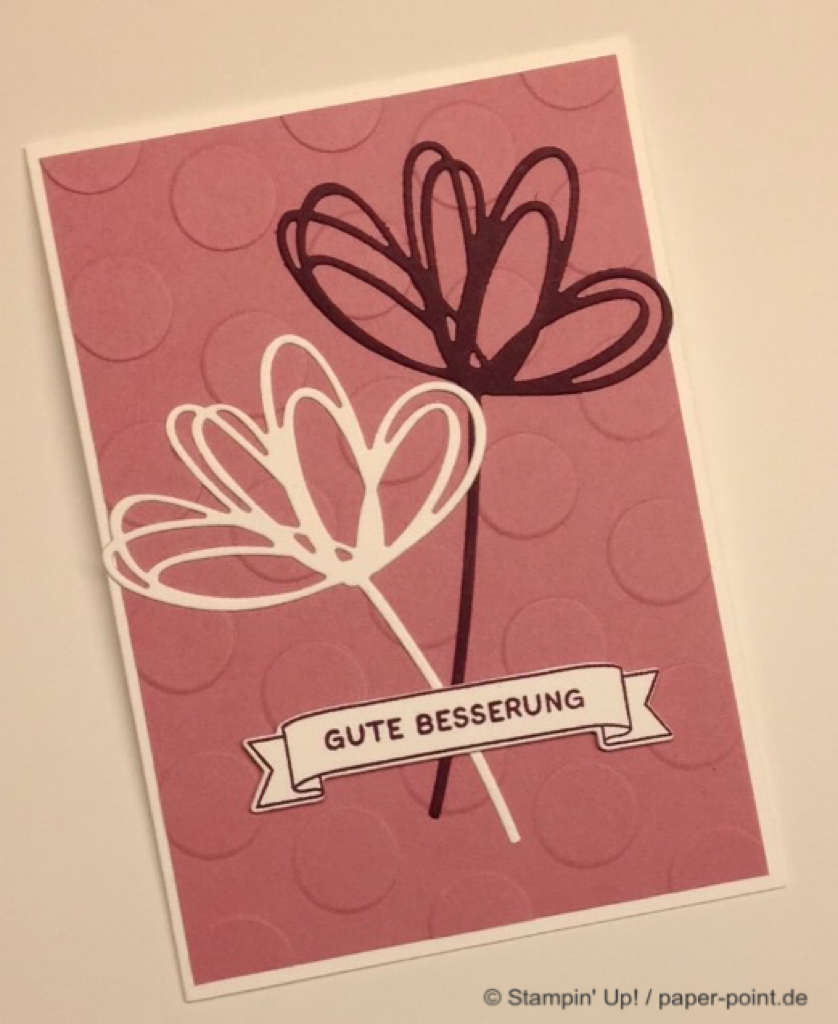 Zuerst haben wir die Karte mit dem Gänseblümchen gebastelt. Hier konnte sich jeder seine Lieblingsfarbe aus dem Designerpapier InColor 2018-2020 aussuchen. In dieser Farbe wurde dann auch das Gänseblümchen gestempelt und ein passender Spruch dazu ausgesucht.