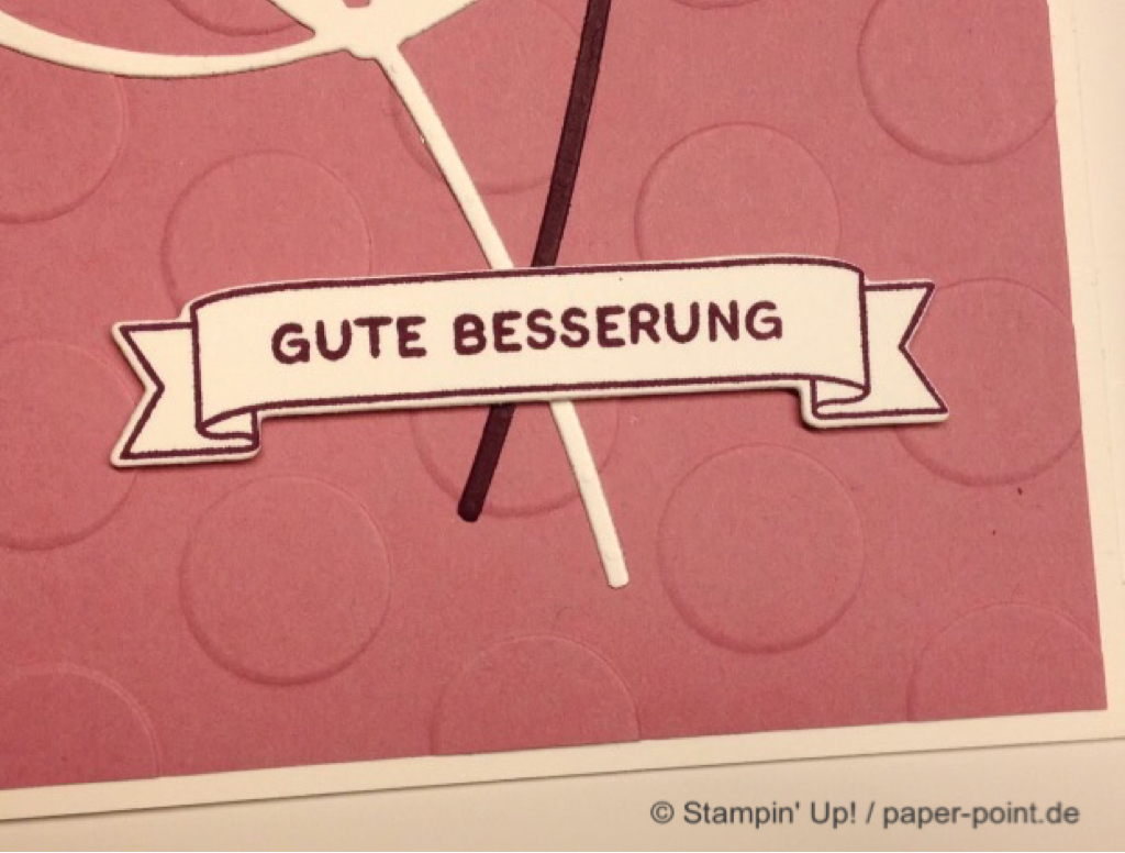 Eine weitere Karte haben wir mit dem neuen SAB-Set „Süße Grüße für Dich“ gestaltet. Ein niedlich verzierter Cupcake mit gefaltetem Spruchfähnchen klebt hier auf dem gestempelten Hintergrund.