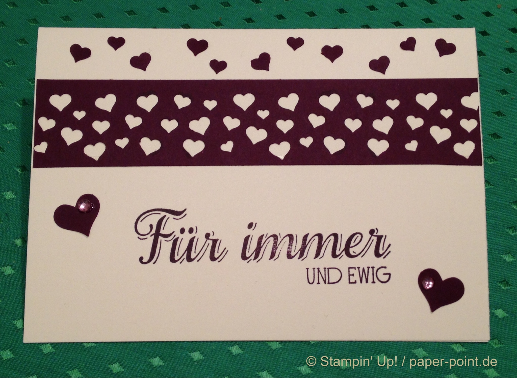 Hier habe ich die Wimpelkette aus den „Framelits Formen Ballon“ mit Flüsterweiß durch die BigShot gekurbelt. Dann kam noch mal die „Bordürenstanze Herzkonfetti“ zum Einsatz. Die kleinen in Glutrot ausgestanzten Herzchen haben ihren Platz auf den Wimpeln gefunden. Zum Abschluss habe ich noch eine Kordel in Flüsterweiß um den oberen Rand mit einer Schleife festgebunden.