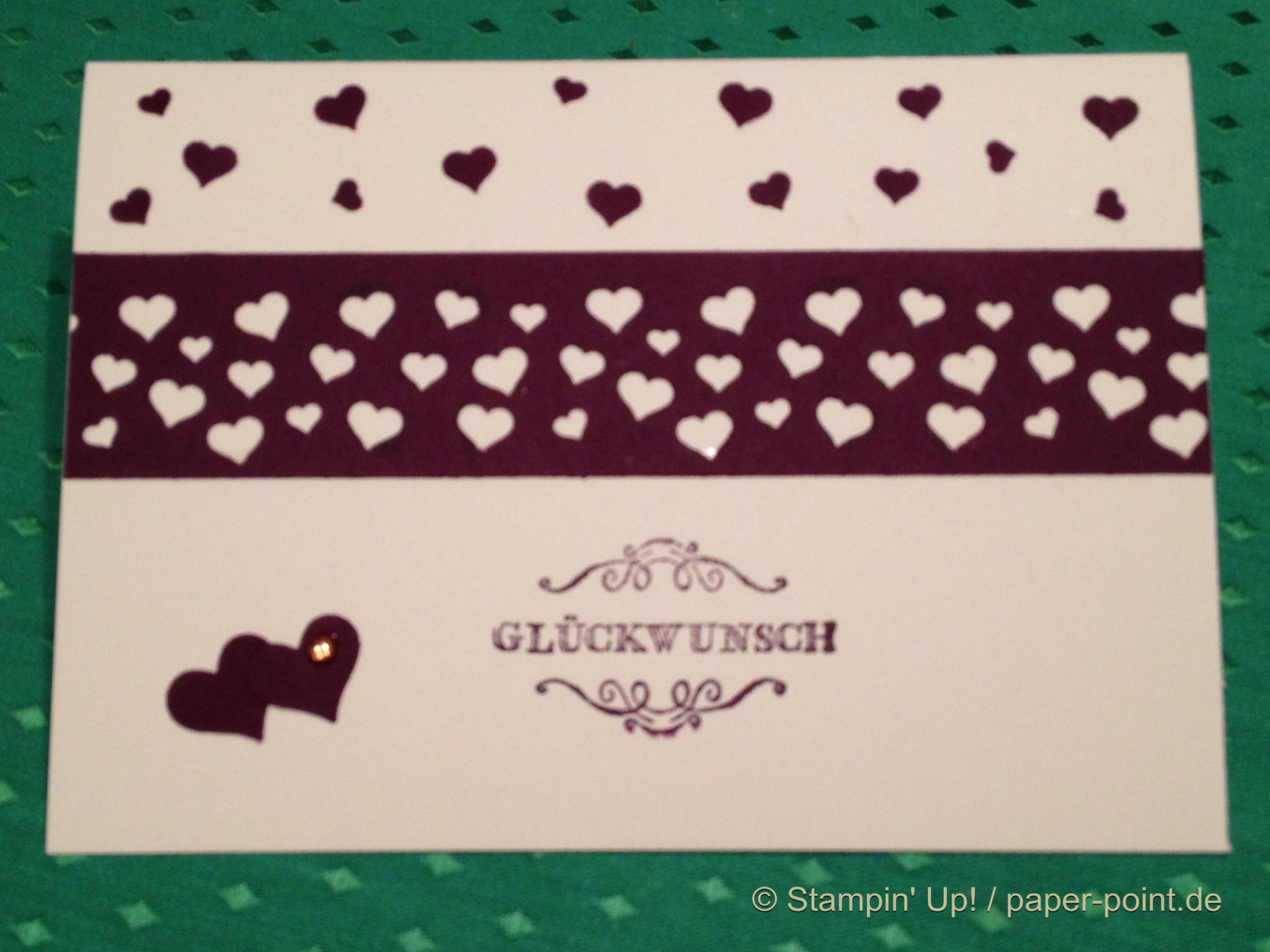 Bei dieser Variante habe ich die Herzchen direkt auf das Pergament geklebt. Mit dem Mehrzweck-Flüssigkleber ging das ganz einfach. Auch hier durfte eine Schleife aus Kordel in Flüsterweiß nicht fehlen.