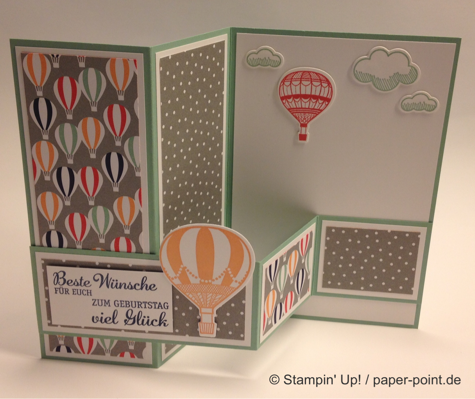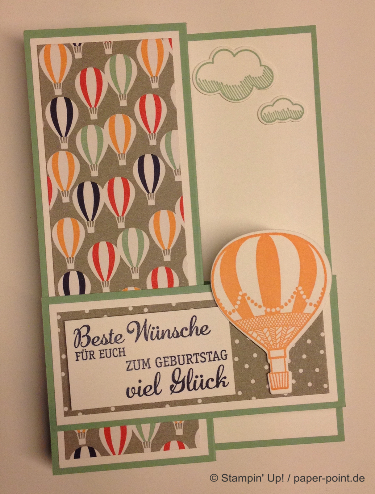 Überall fahren glutrote und marineblaue Heißluftballons und es schweben Wölkchen aus dem Stempelset „Abgehoben“ umher, diese kann man mit den Thinlits Formen „In den Wolken“ ausschneiden.